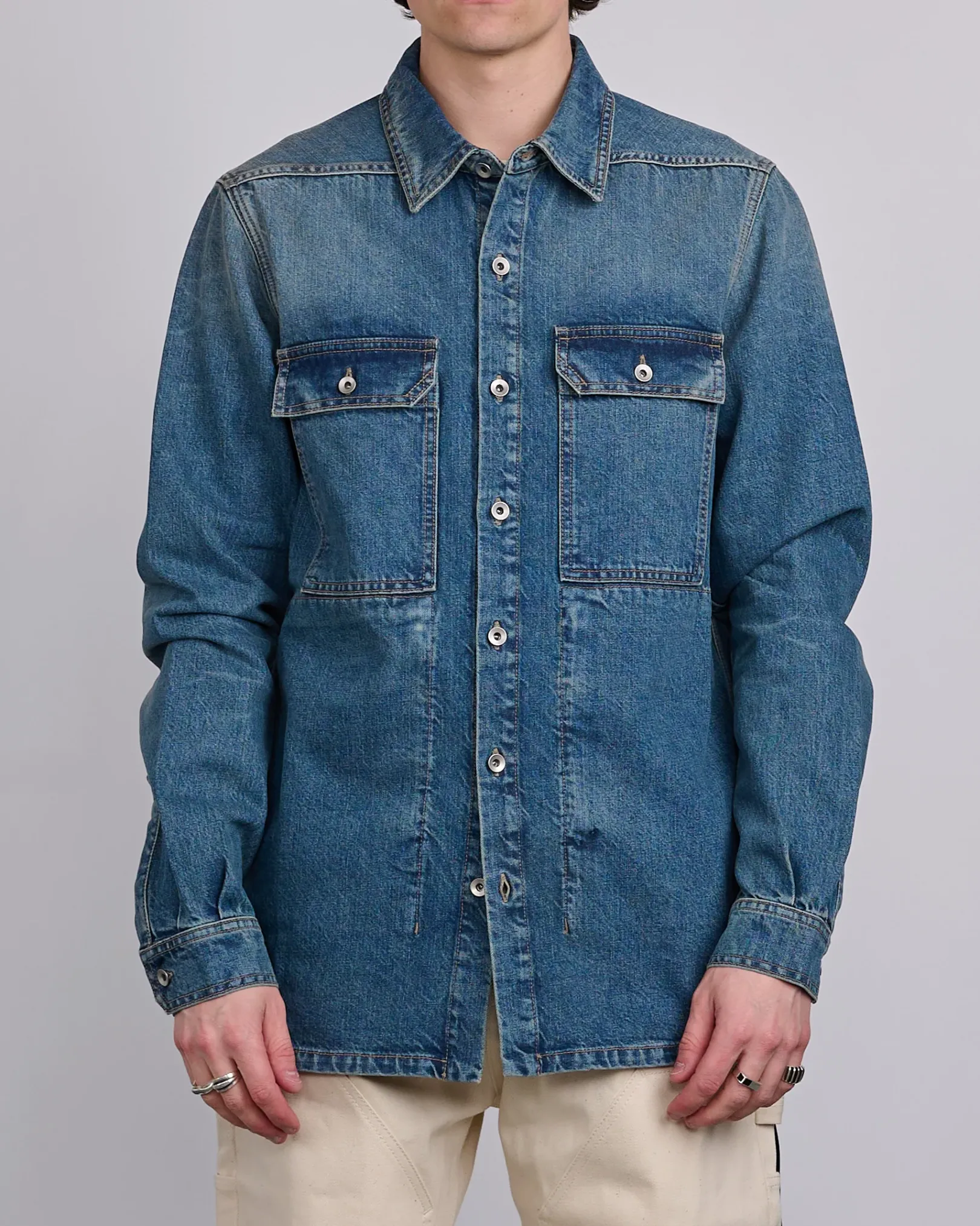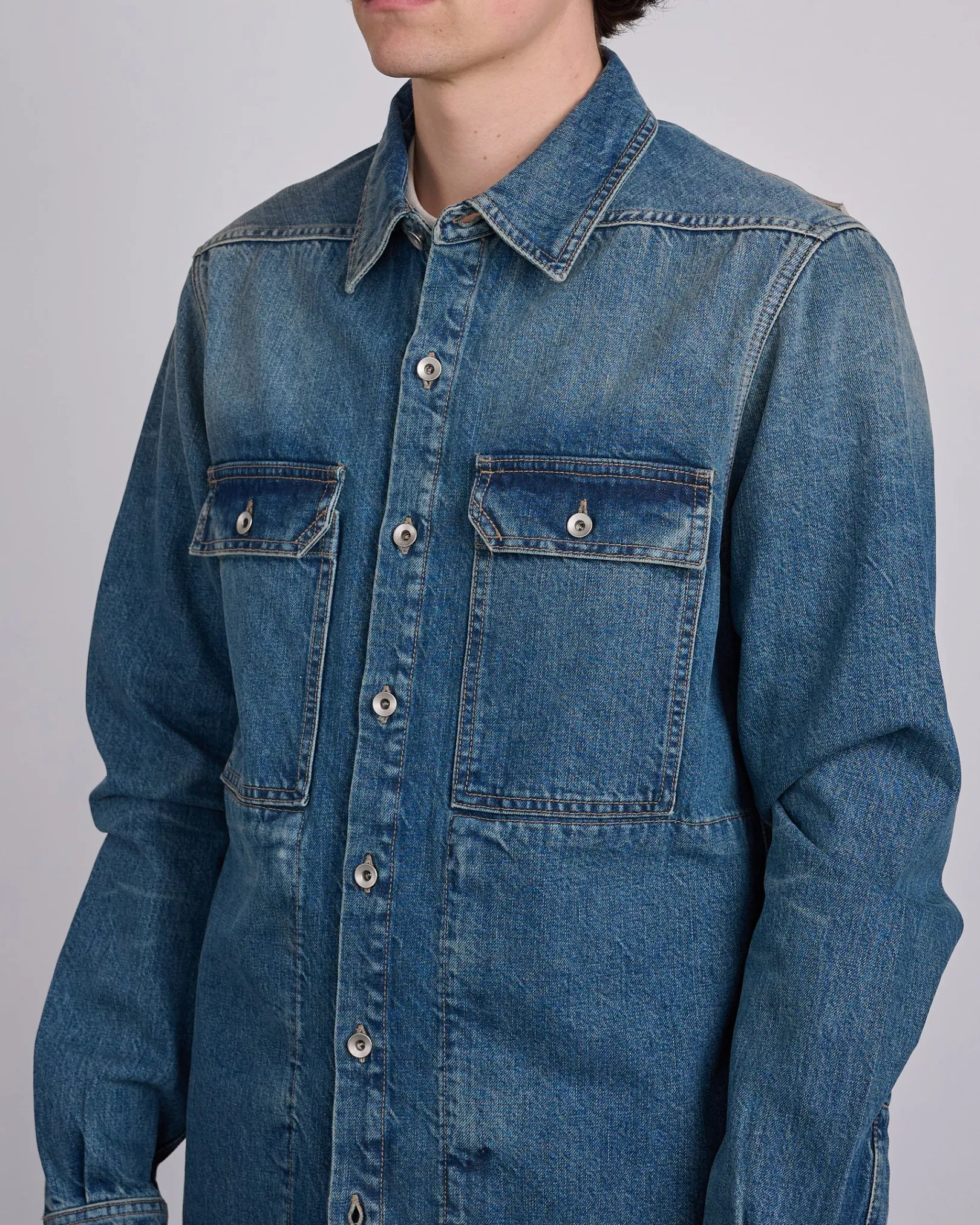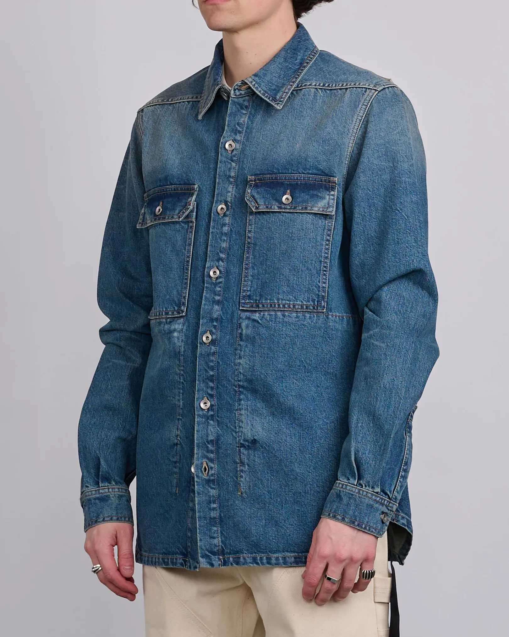 This outershirt is below hip length with a straight fit. It has a centre front placket with visible metal buttons, a classic collar, and a hemline with beveled sides seams. It features square chest pockets with buttons and beveled corner flaps. It has long sleeves with buttoned cuffs, signature level shoulder seams, a back yoke and double top stitching on all seams.