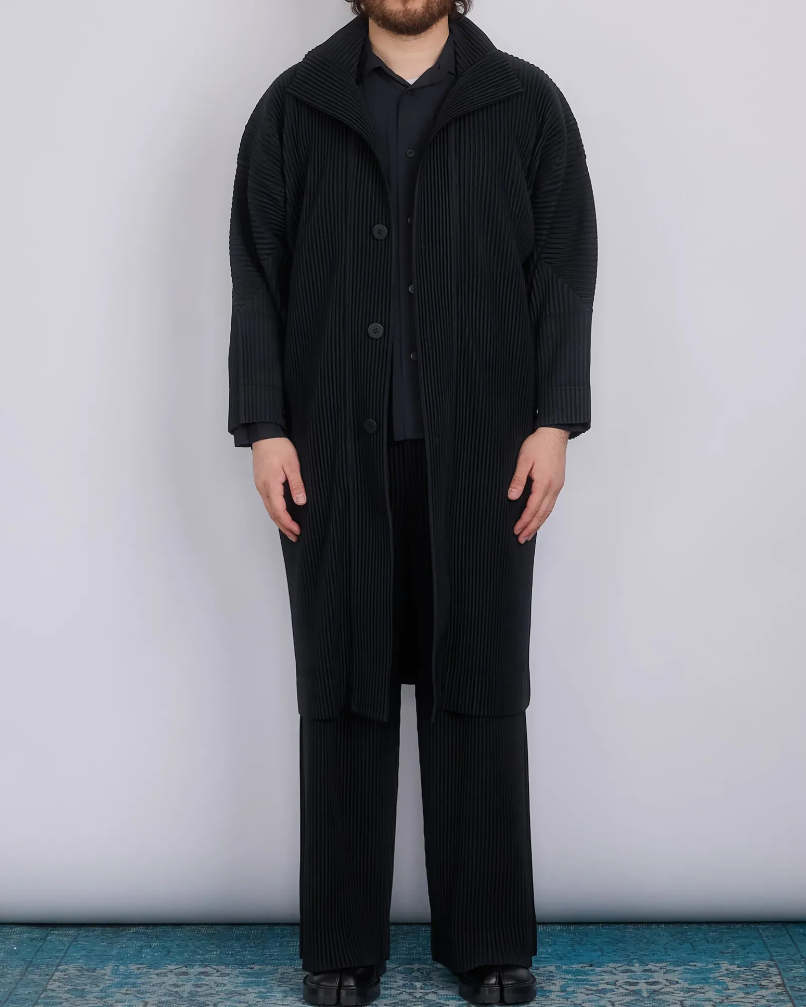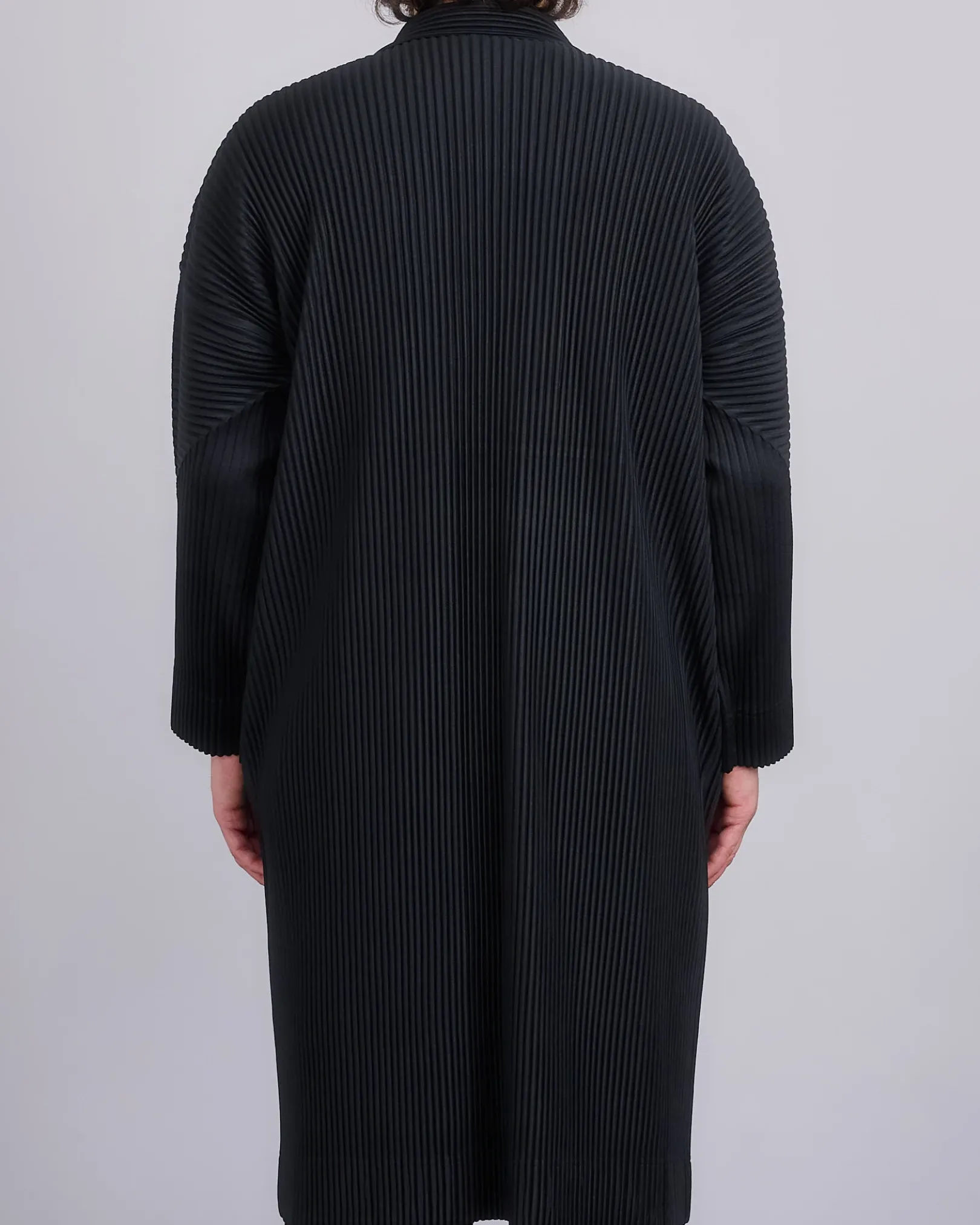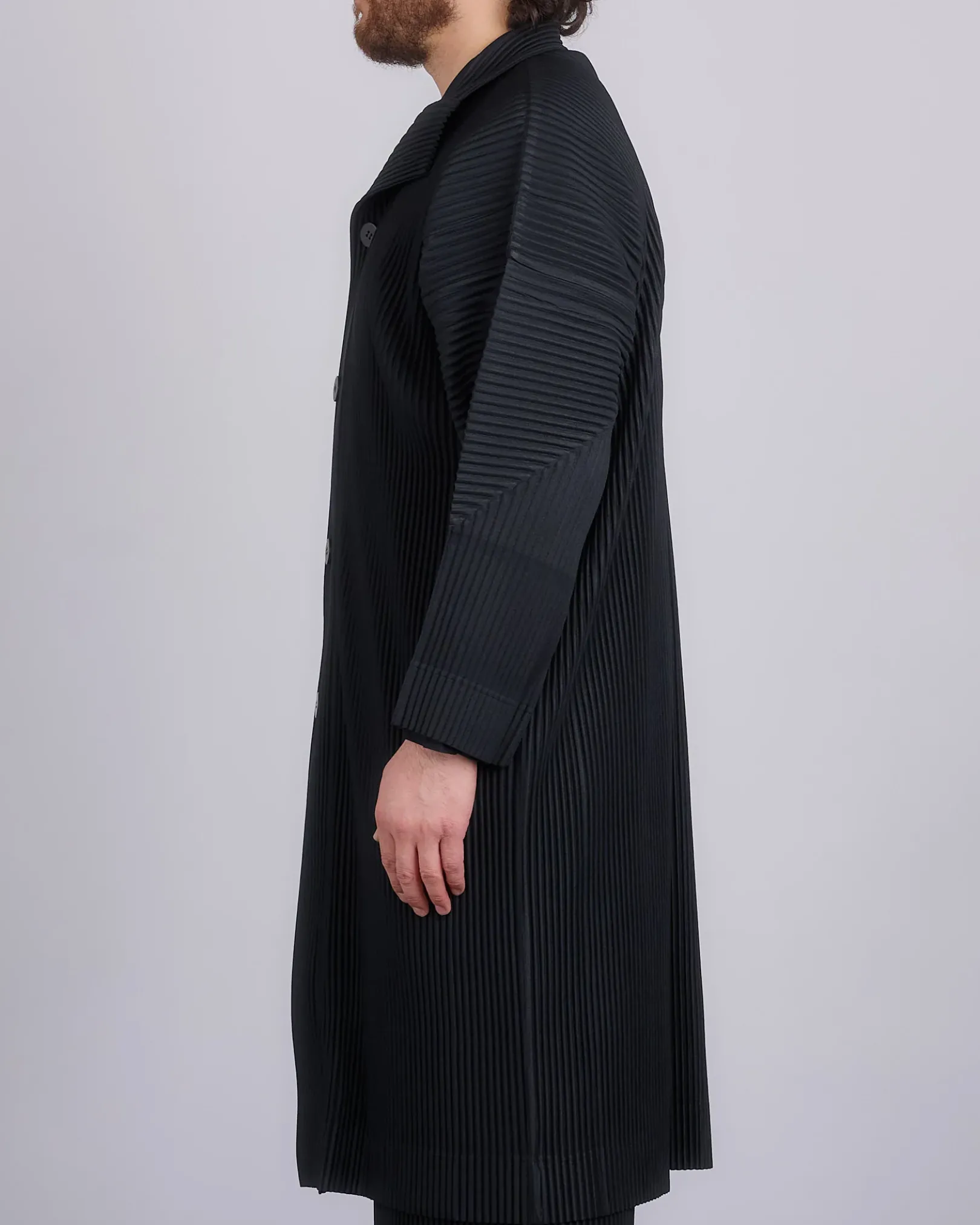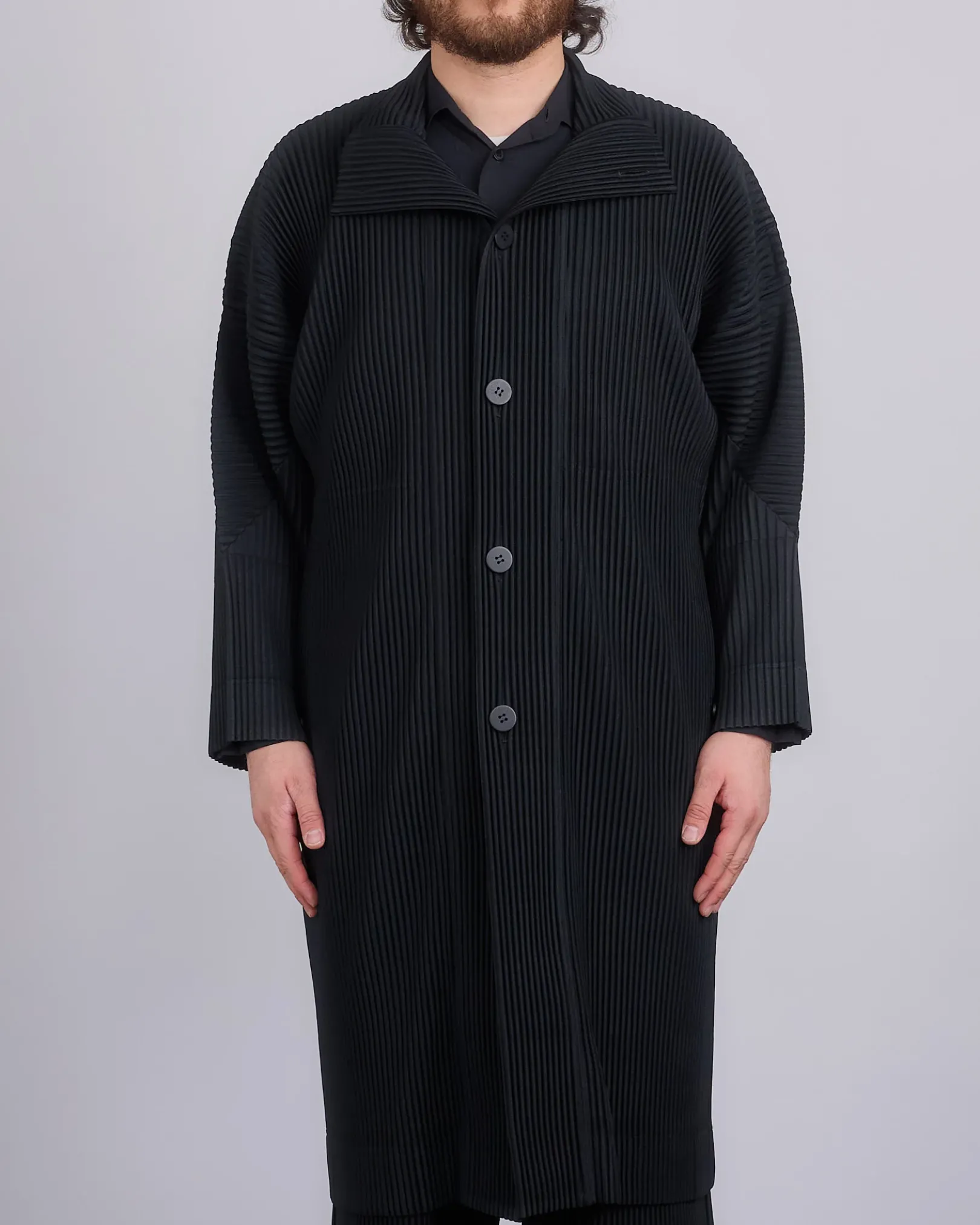 This pleated oversized coat has a high collar, button down closure, and two side pockets.