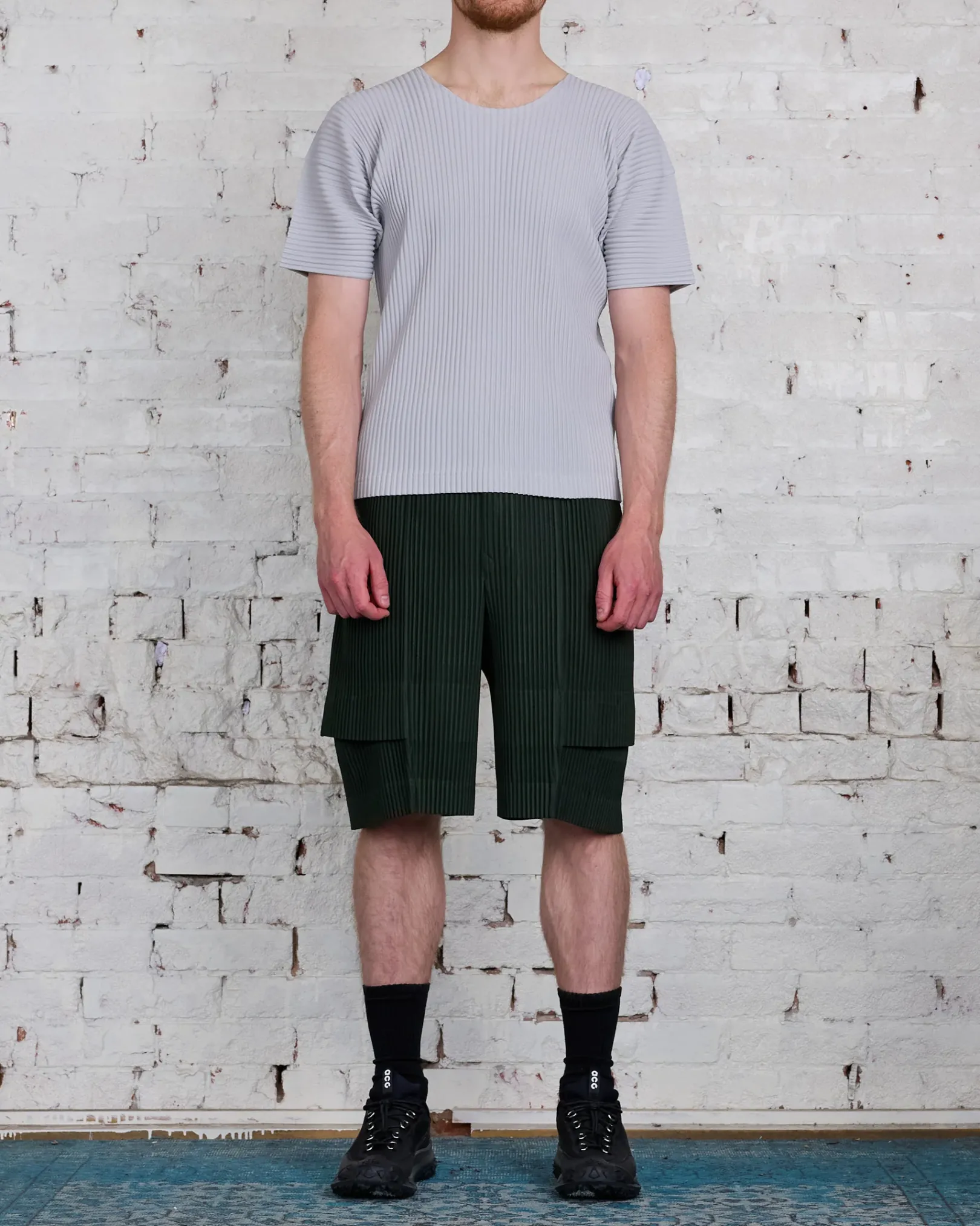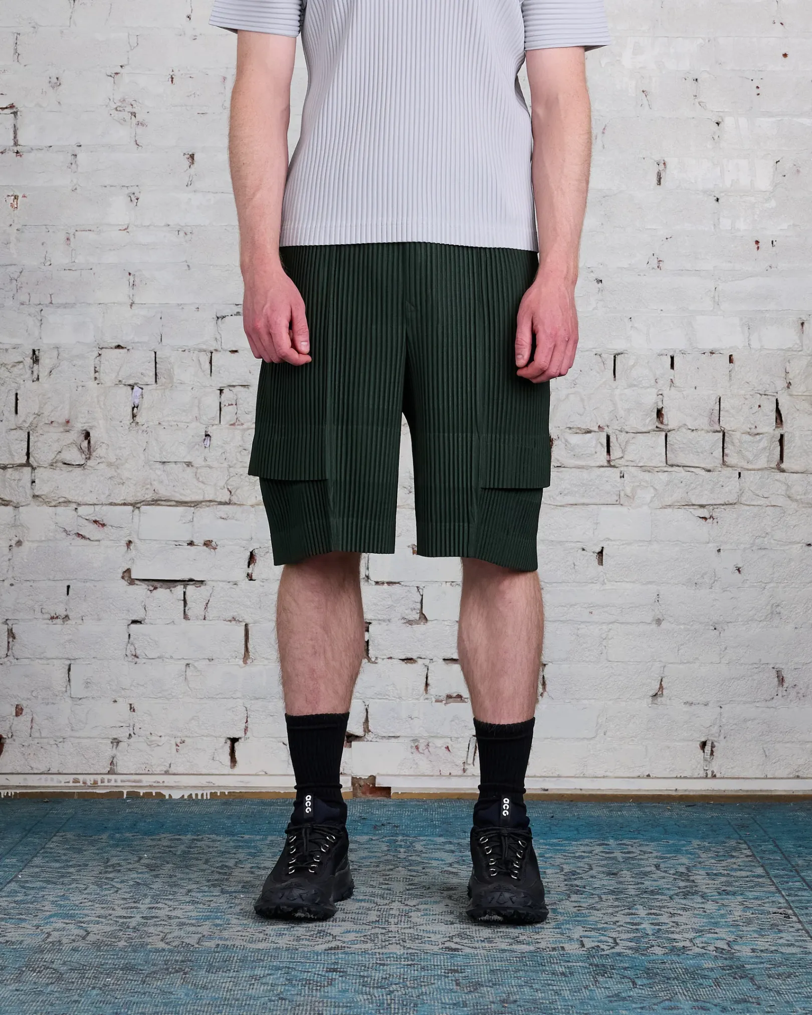 These shorts are made from pleated material with a cargo pants design. They are characterized by their bold tucks. They have pockets on both sides and an inner drawcord. They have a front-opening buttoned fly.