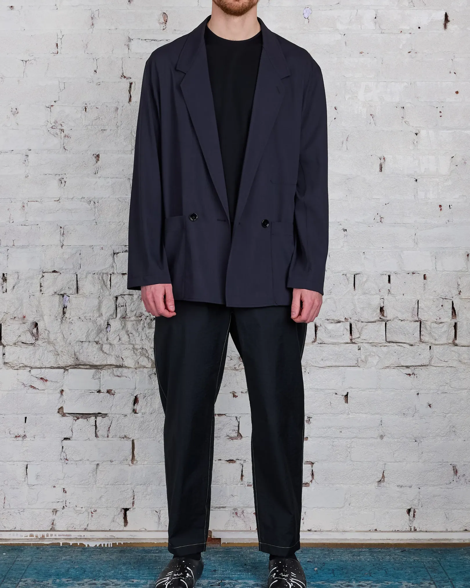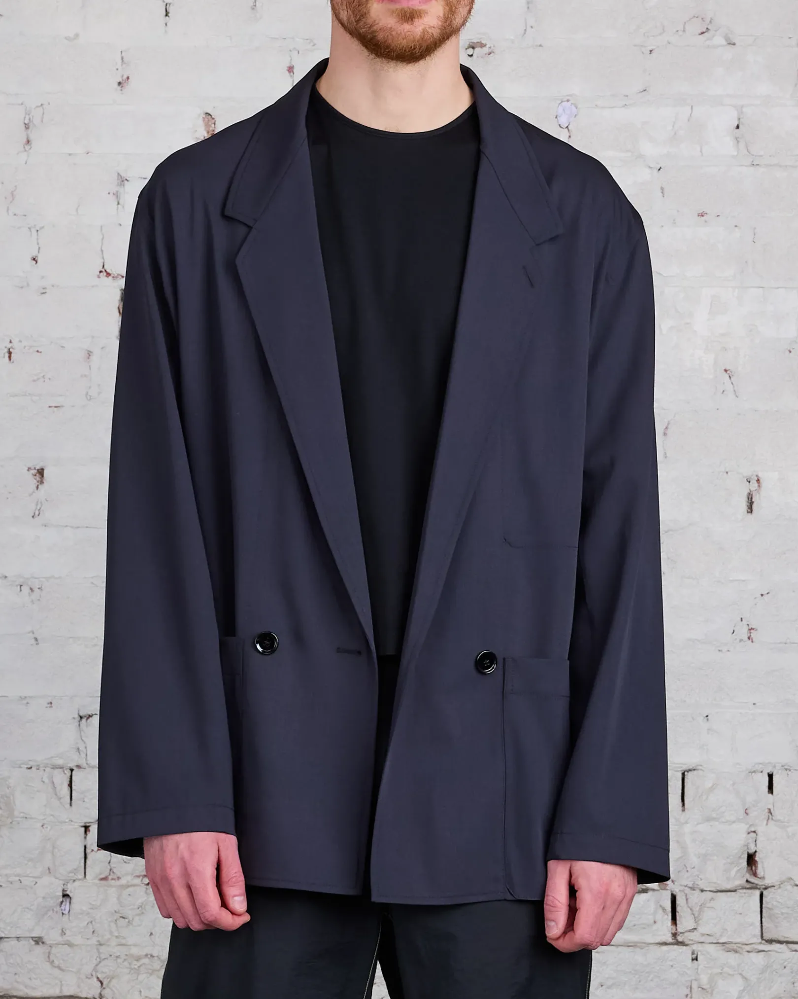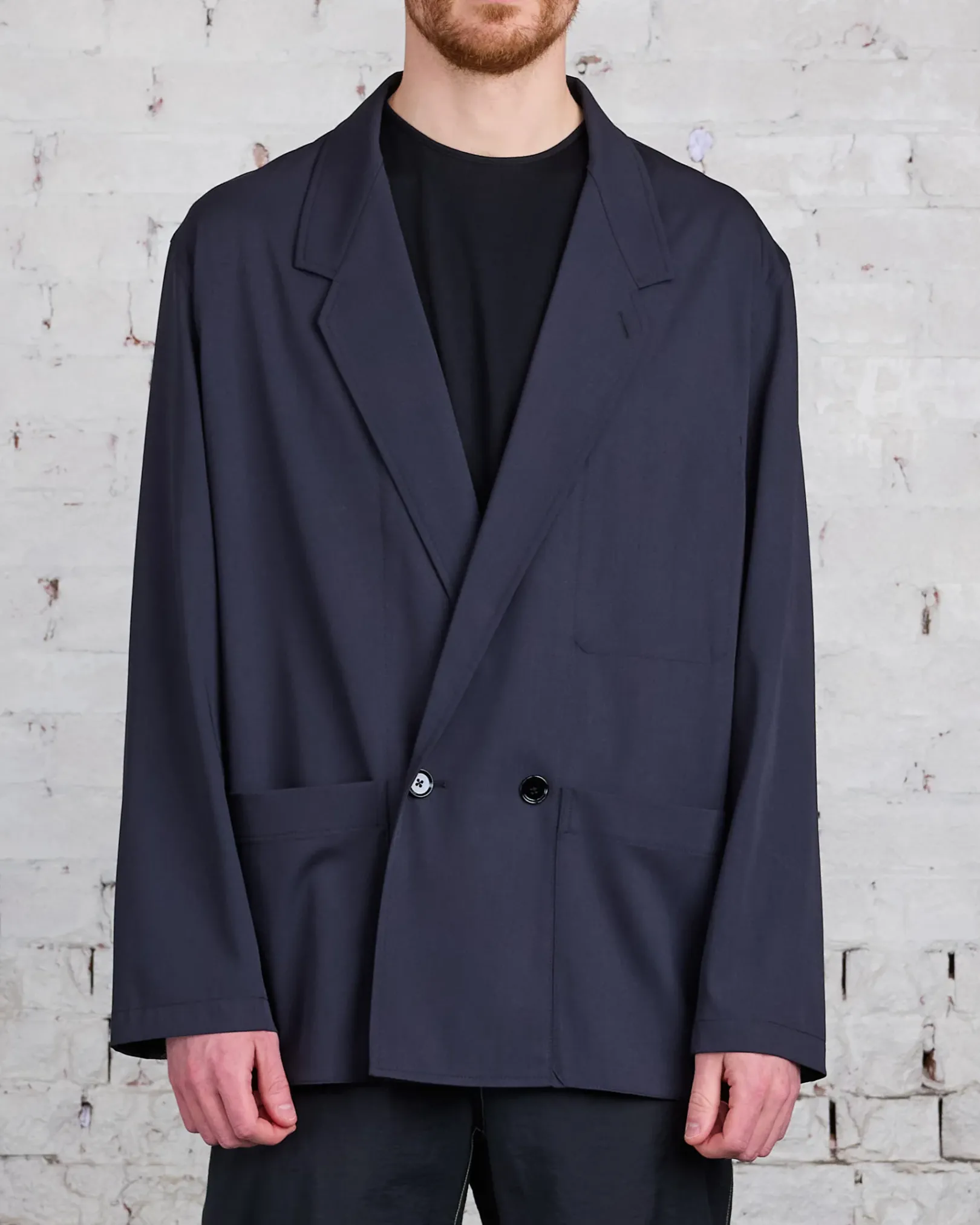 This jacket is a workwear interpretation of the Double Breasted Jacket, a staple of LEMAIRE’s wardrobe. It is made of poly-wool woven into a mélange twill, with a dense yet supple hand for fluid tailoring. The fit is relaxed and deconstructed, with a two buttons double-breasted closure that can also be fastened on its interior using a buttoned strap. It features a convertible lapel and two patch pockets on the front.