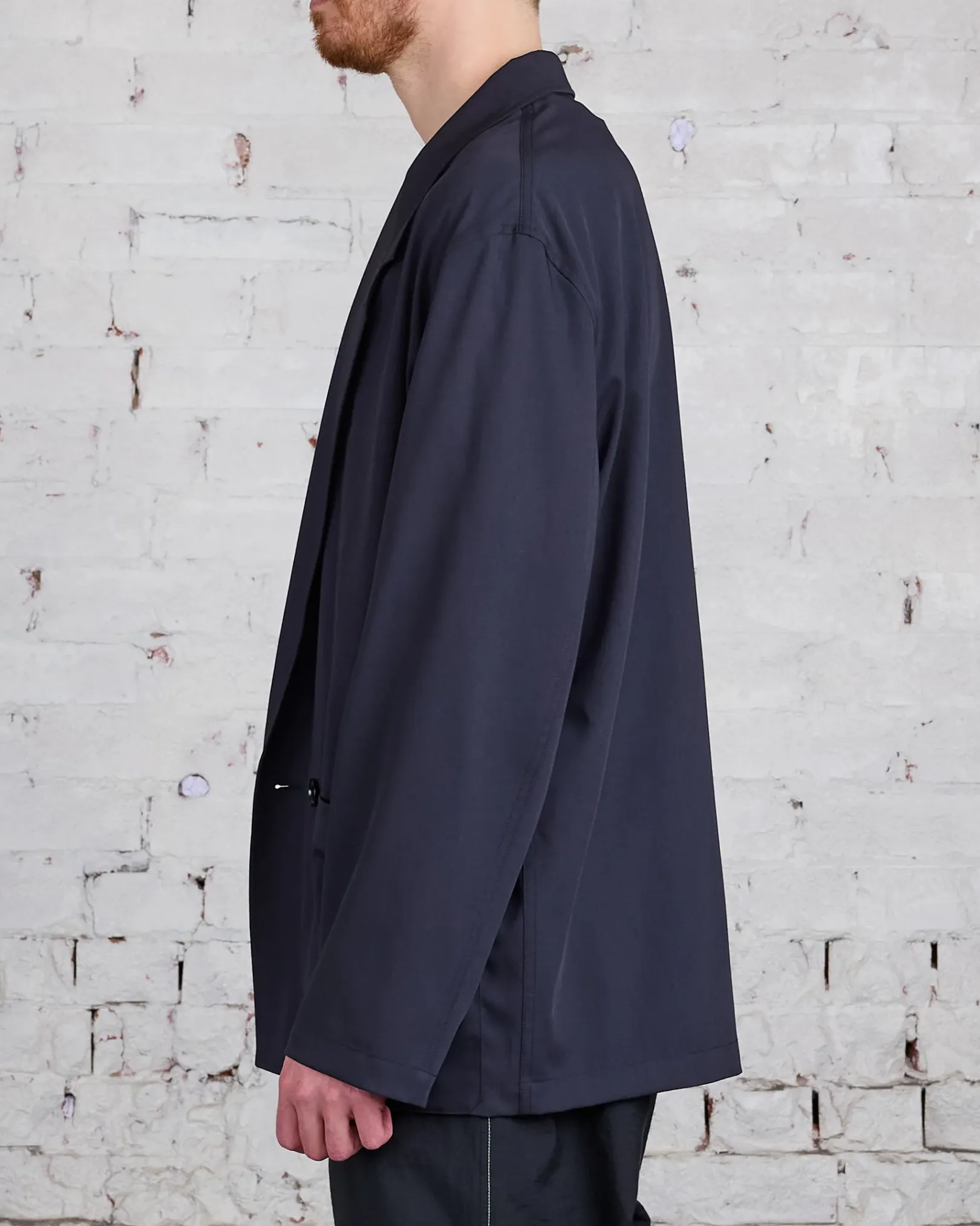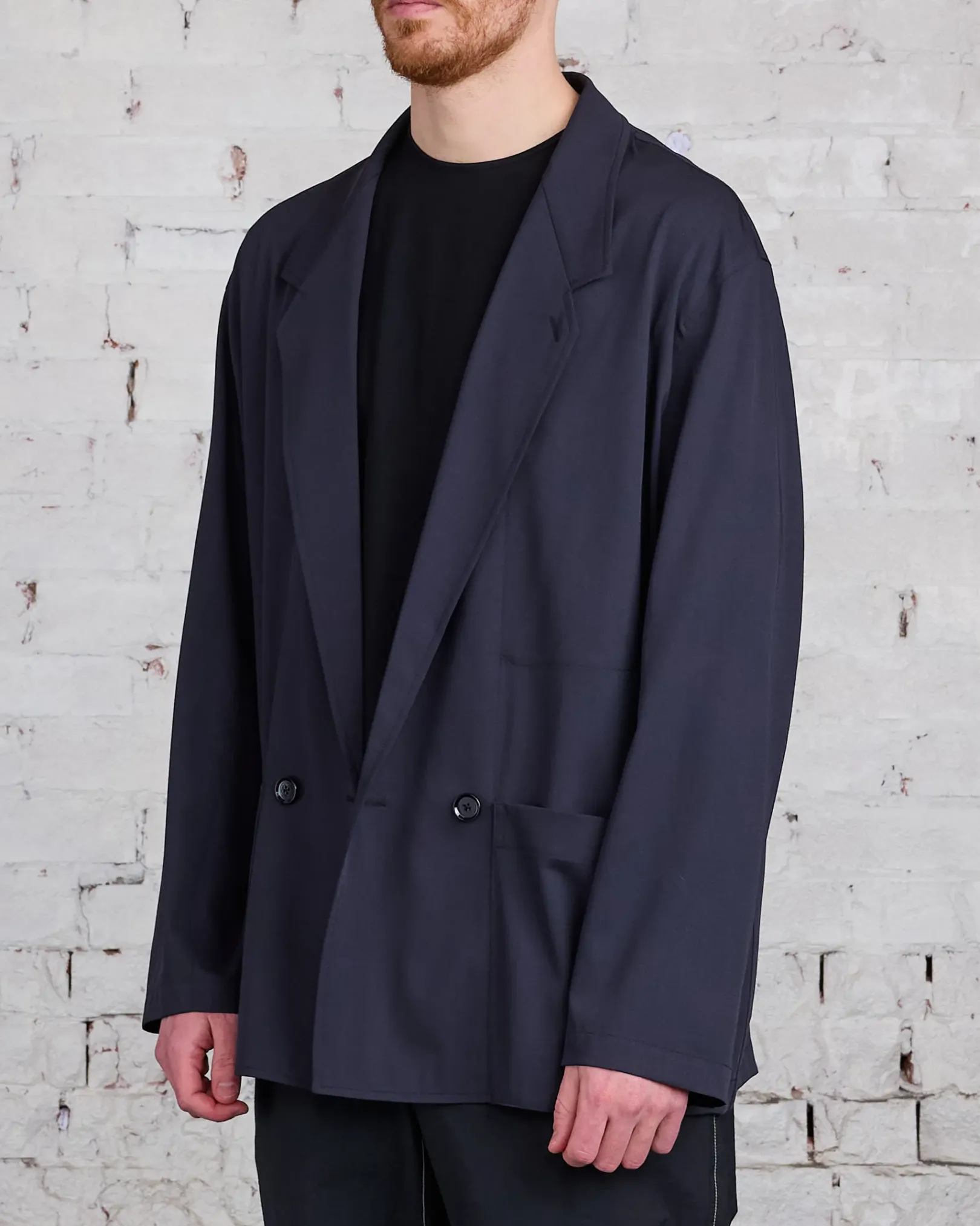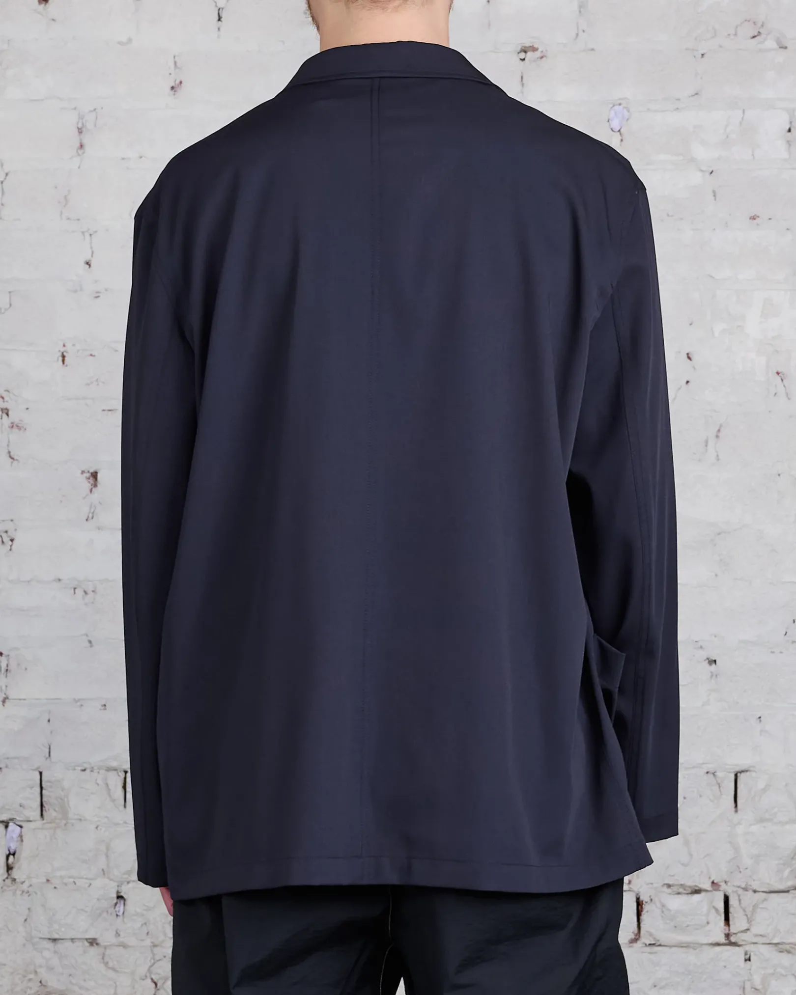 This jacket is a workwear interpretation of the Double Breasted Jacket, a staple of LEMAIRE’s wardrobe. It is made of poly-wool woven into a mélange twill, with a dense yet supple hand for fluid tailoring. The fit is relaxed and deconstructed, with a two buttons double-breasted closure that can also be fastened on its interior using a buttoned strap. It features a convertible lapel and two patch pockets on the front.