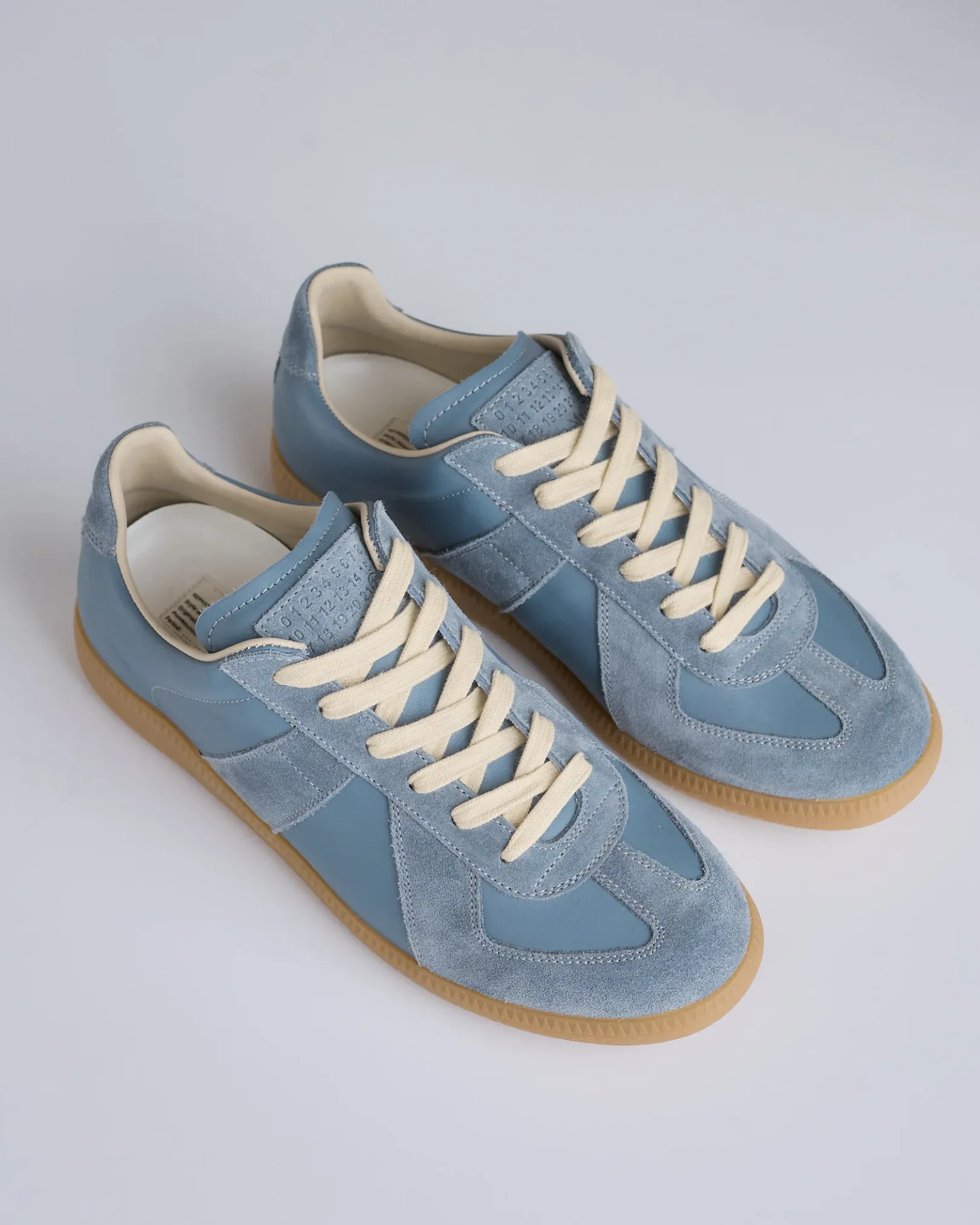 The Replica sneakers in nappa leather and suede with a honey sole. The Maison’s iconic Replica sneakers are inspired by Austrian sports shoes from the seventies. Details on the Replica pairs are continually reworked in line with the season’s inspirations.