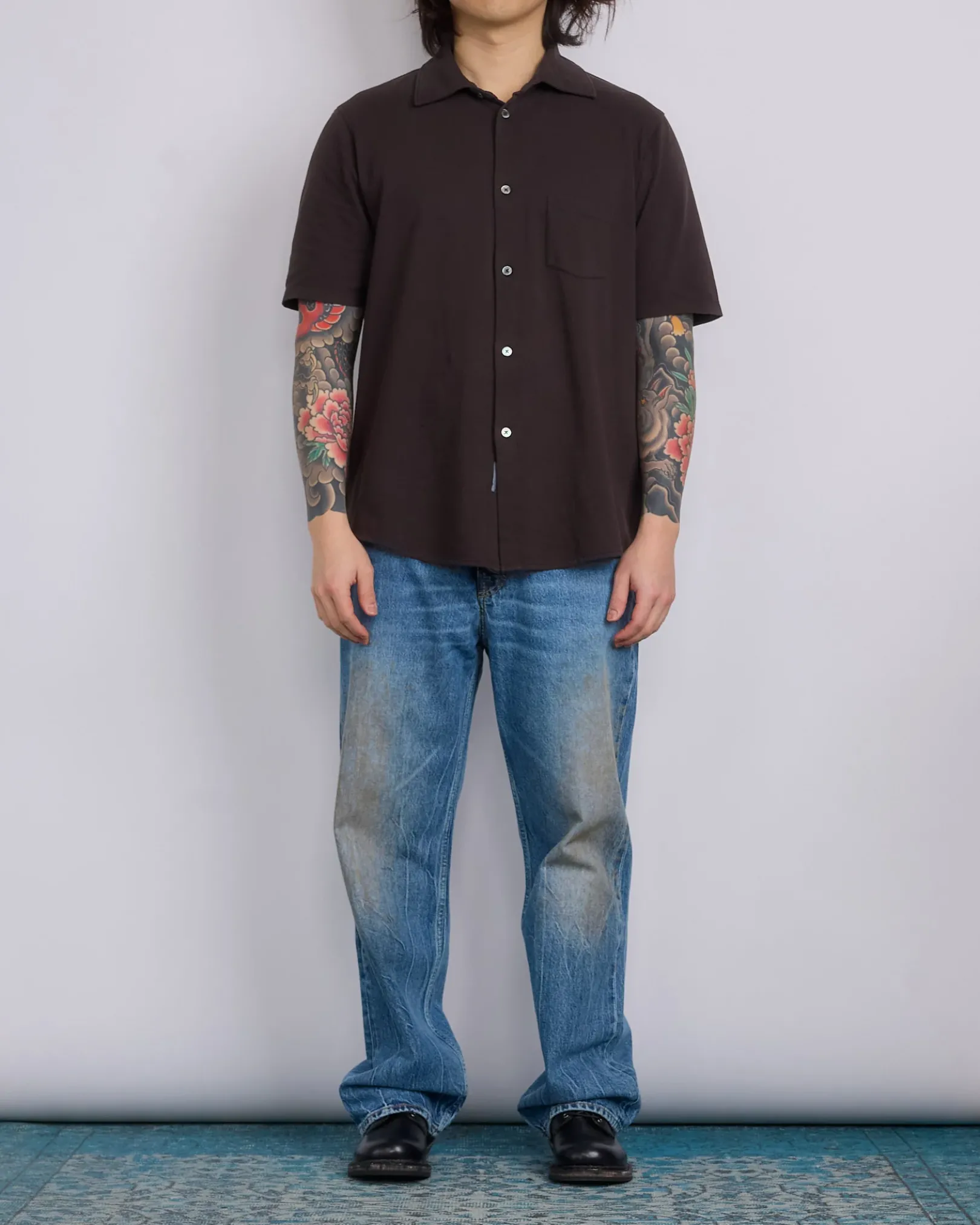 Our Legacy Analog Shirt in Deep Brown Super Mall Piquet. Produced in a Portuguese piquet weave cotton fabric, the mens Analog Shirt has a relaxed, straight fit, and features , a single patch chest pocket, smoke pearl buttons and a curved hem.