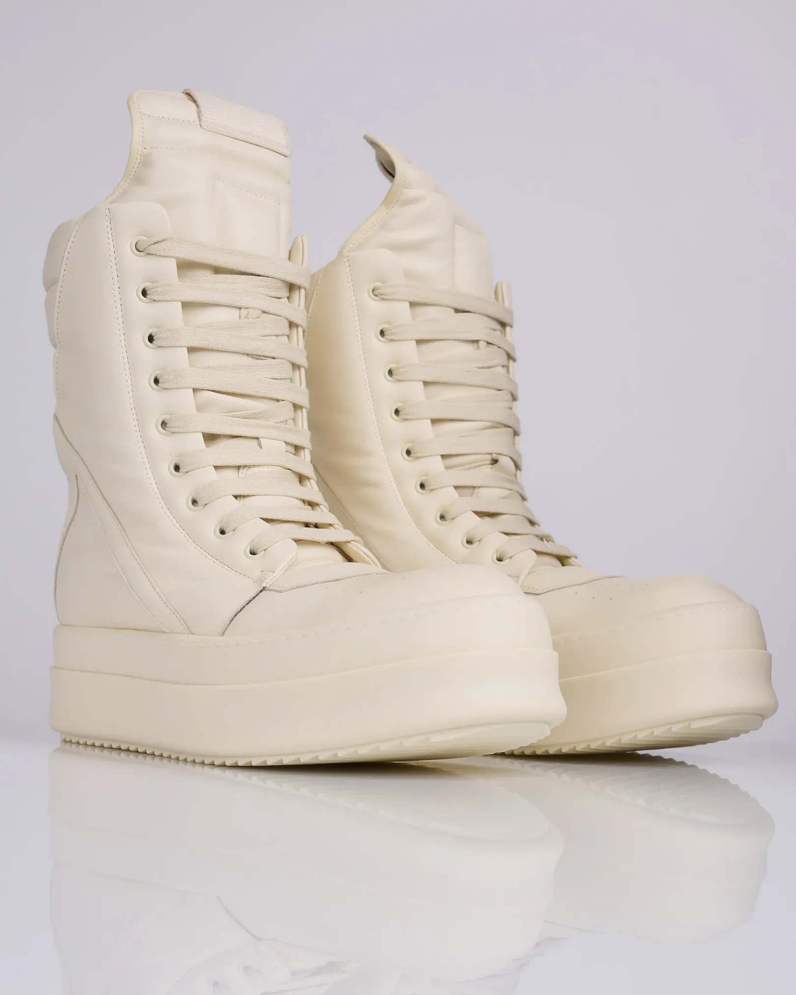 These mega geobasket are mid-calf height. They take Rick’s classic geobasket and blow it tf up to a soft padded mega size. They feature an extended tongue with webbing tab, signature geometric panels and a padded back counter with lines of topstitching. They have nine eyelets, contrast laces, and double height mega bumper shark-toothed soles.
