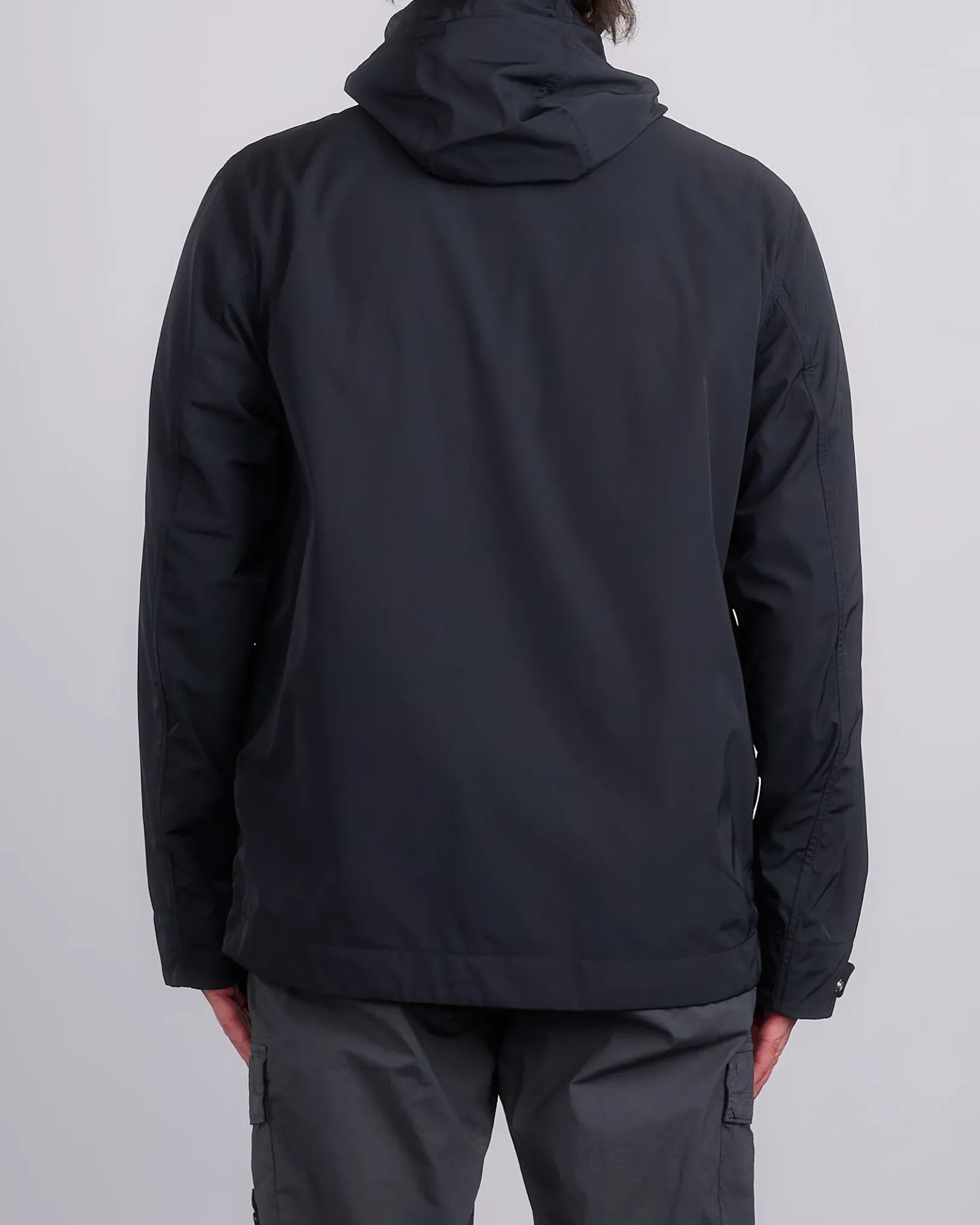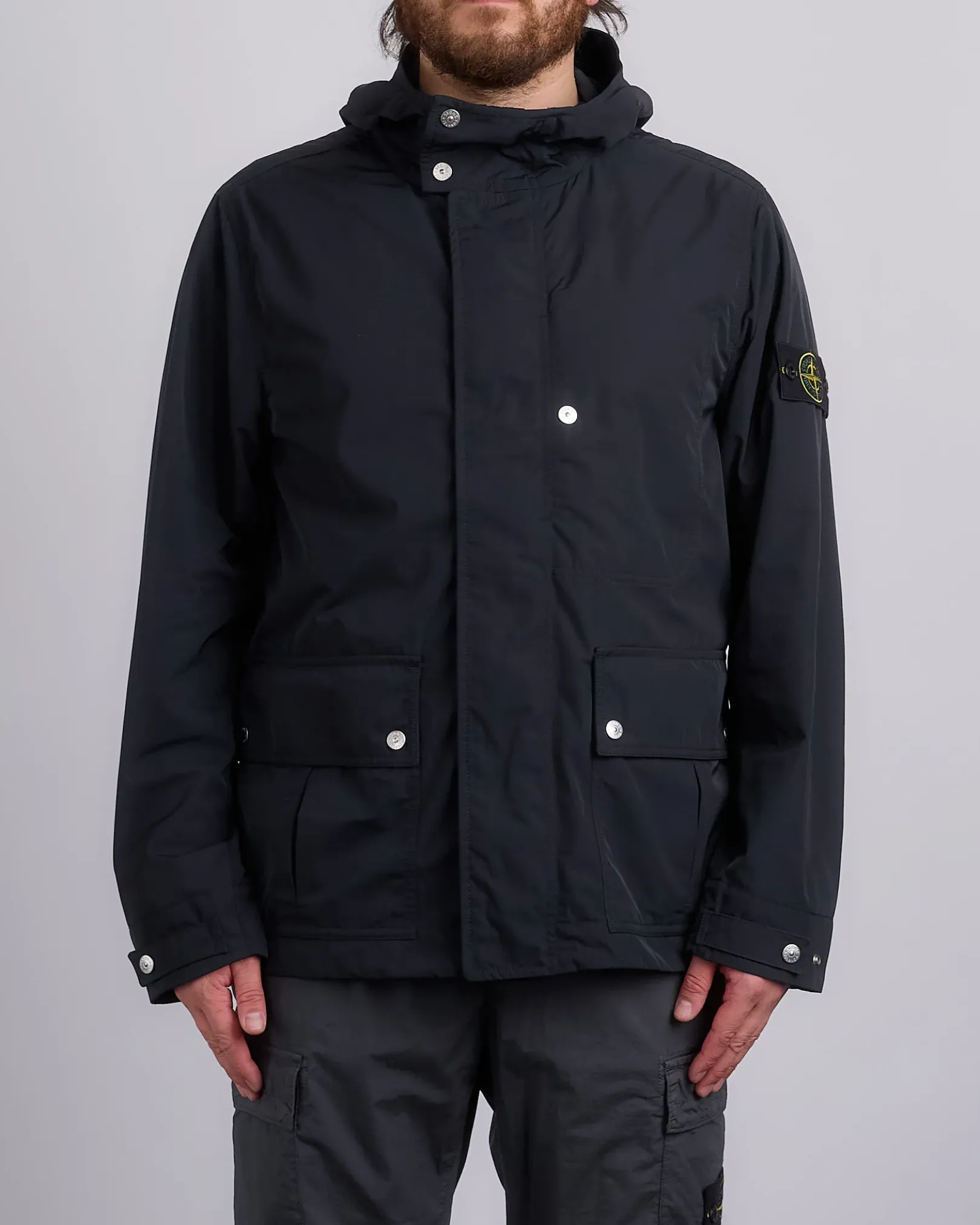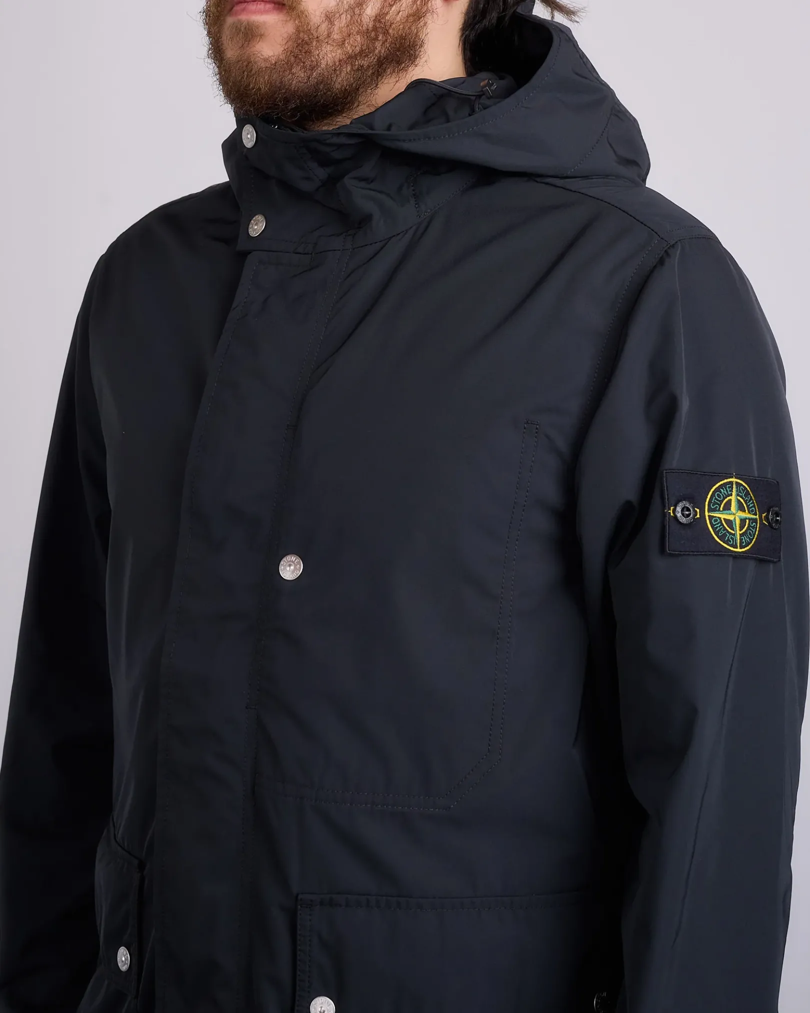 Hood with contour drawstring and front flap with two-snap fastening. Hidden chest pocket on left side with standing entrance inside placket and snap fastening. Bellows hand pockets with flap and snap fastening. Stone Island badge on the left sleeve. Adjustable strap with snap at cuffs and elasticated inner cuffs. Hidden two-way zipper and snap fastening.