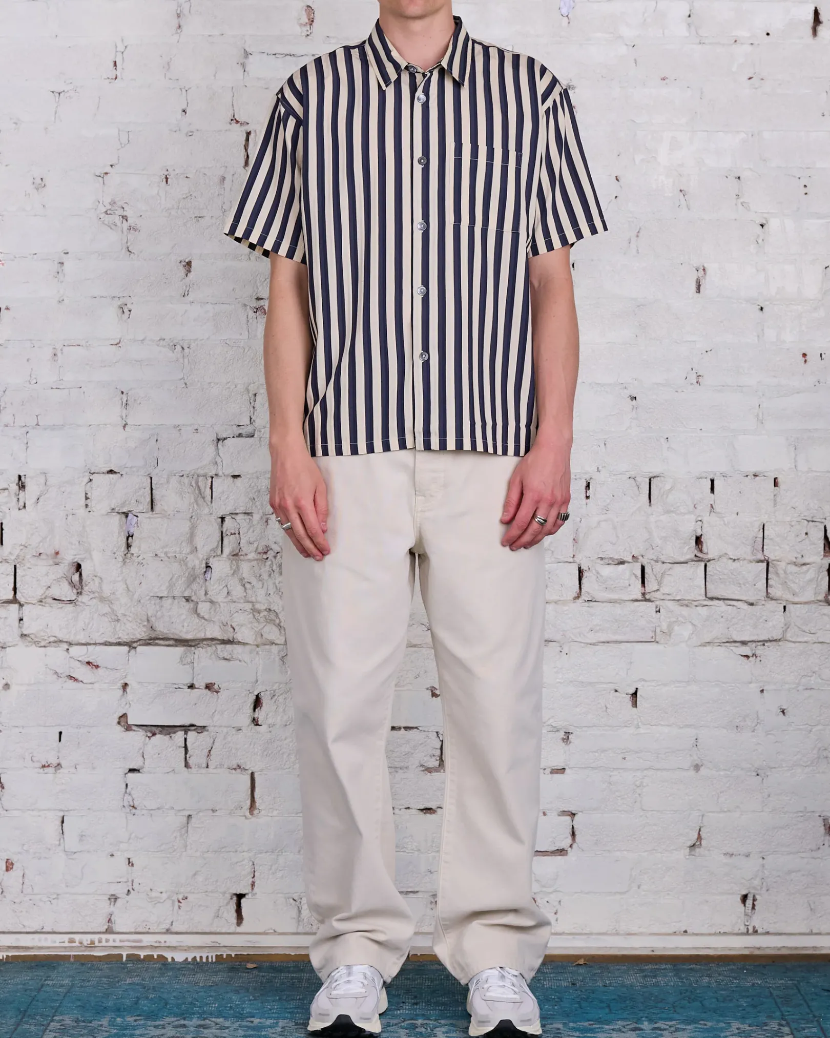Boxy fit shirt in a viscose blend. Features a front button closure and single patch pocket. Stüssy authentic workgear label sewn at the side.