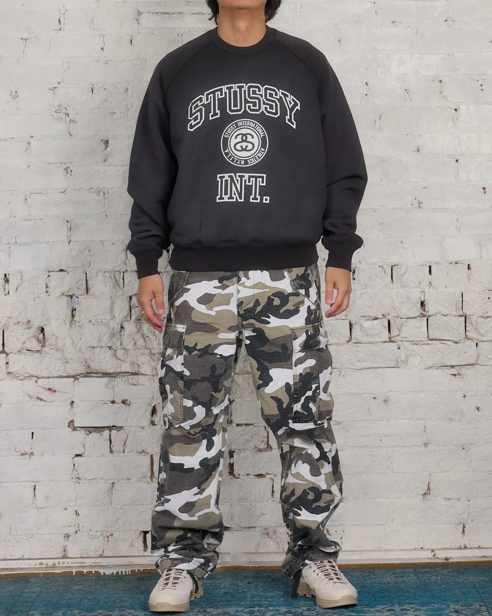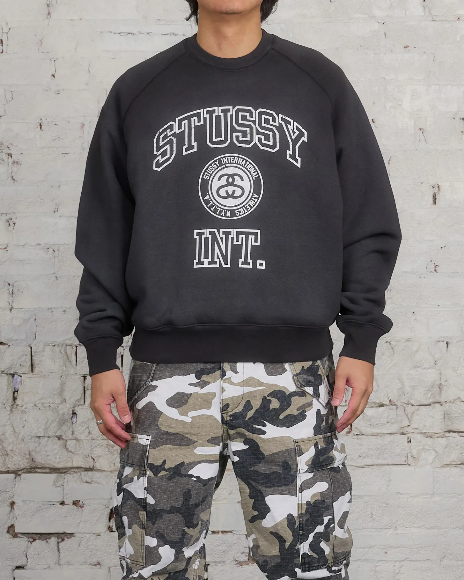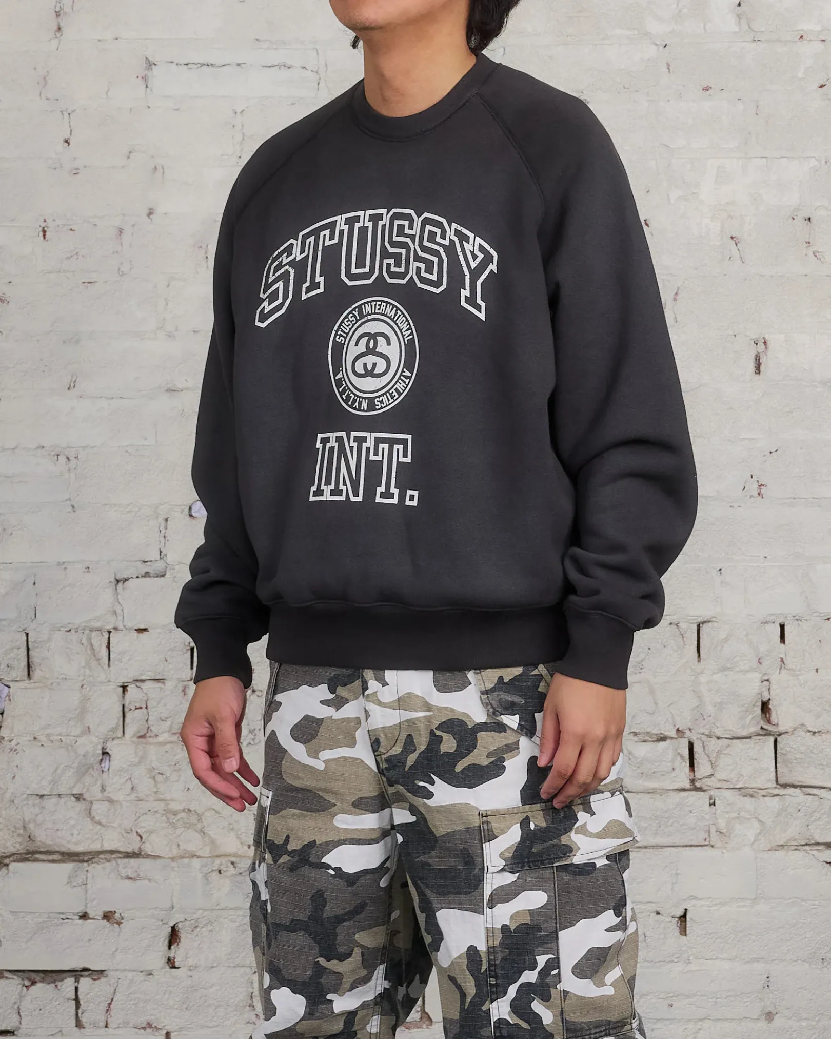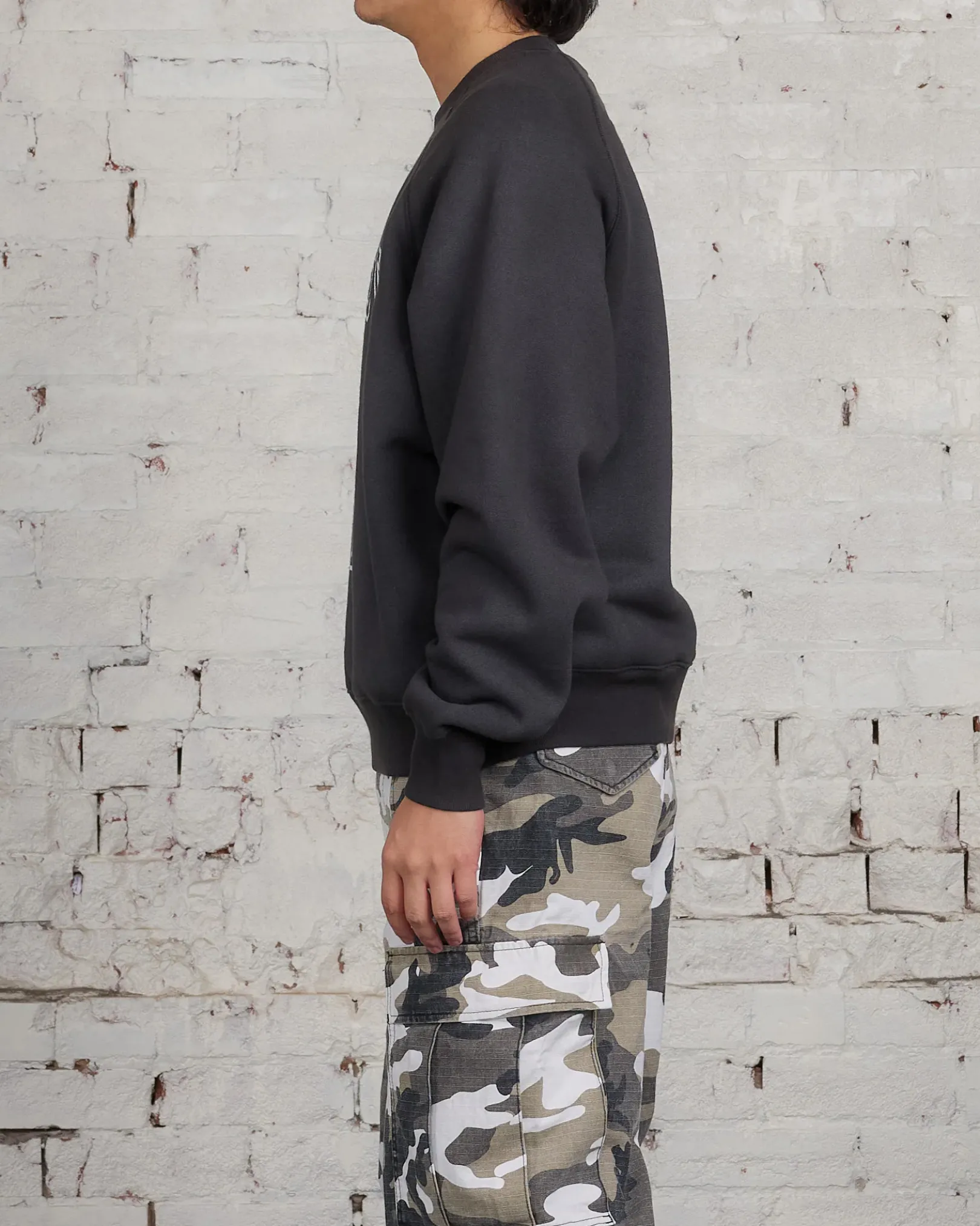 Oversized crewneck sweatshirt in a heavy 15.8oz cotton blend fleece. Features overlock topstitching and Stüssy varsity artwork screenprinted at the front.
