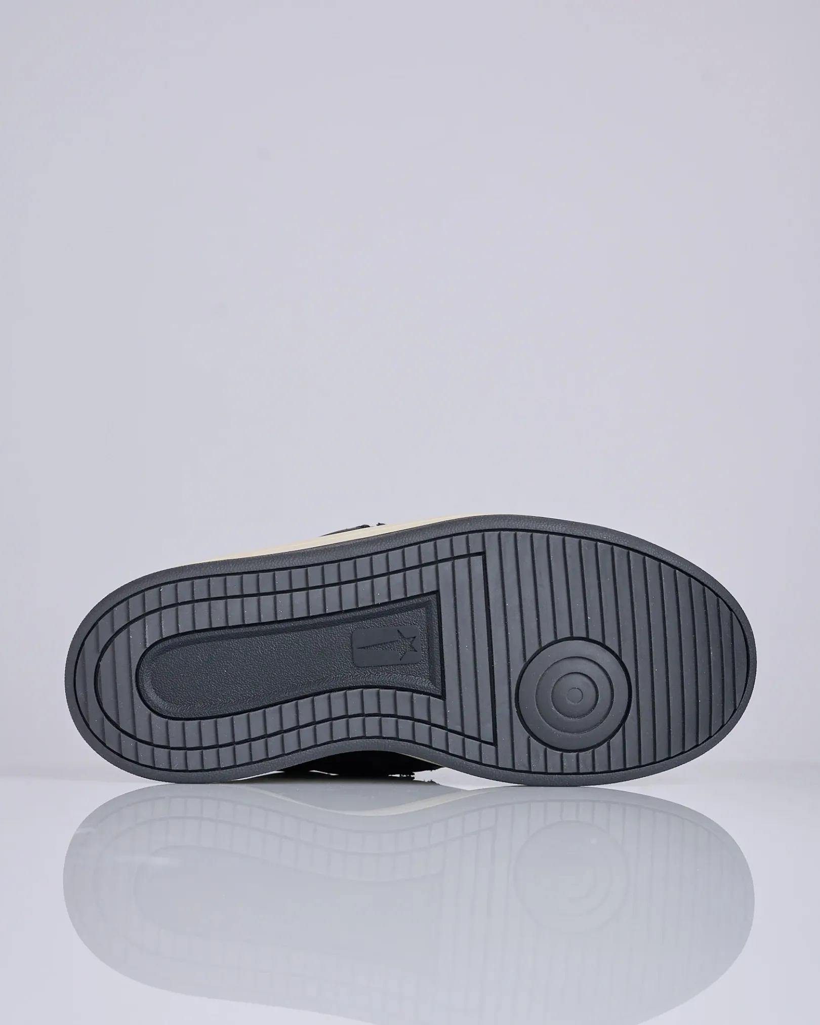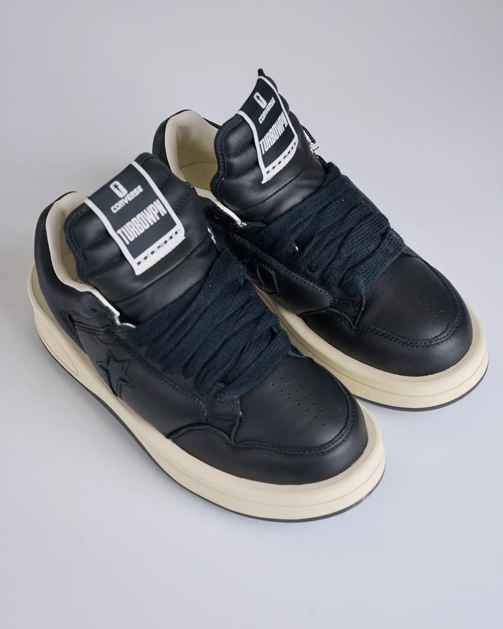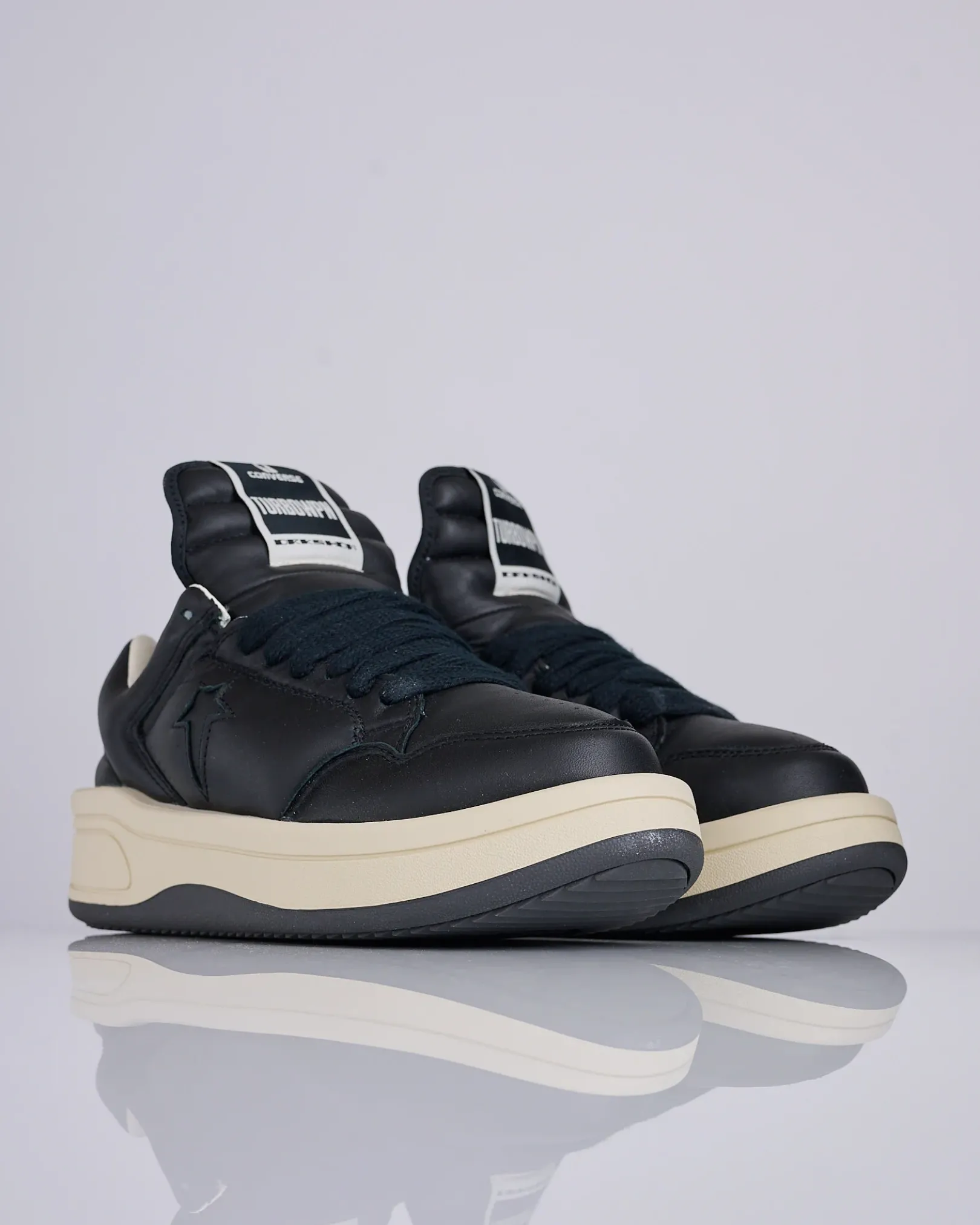 Rick Owens reimagines a Converse icon once again with the TURBOWPN Ox, a low-top evolution of the original TURBOWPN. Distorting and exaggerating classic basketball elements through his signature DRKSHDW aesthetic, the shoe features bold paneled leather uppers, an oversized tongue, and thickened sole for a striking, sculptural silhouette. Each pair is finished with custom DRKSHDW branding—delivering a distinctly Rick Owens take on timeless Converse heritage.