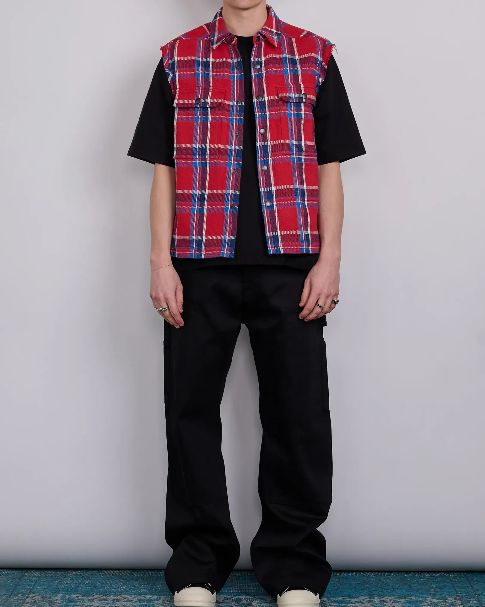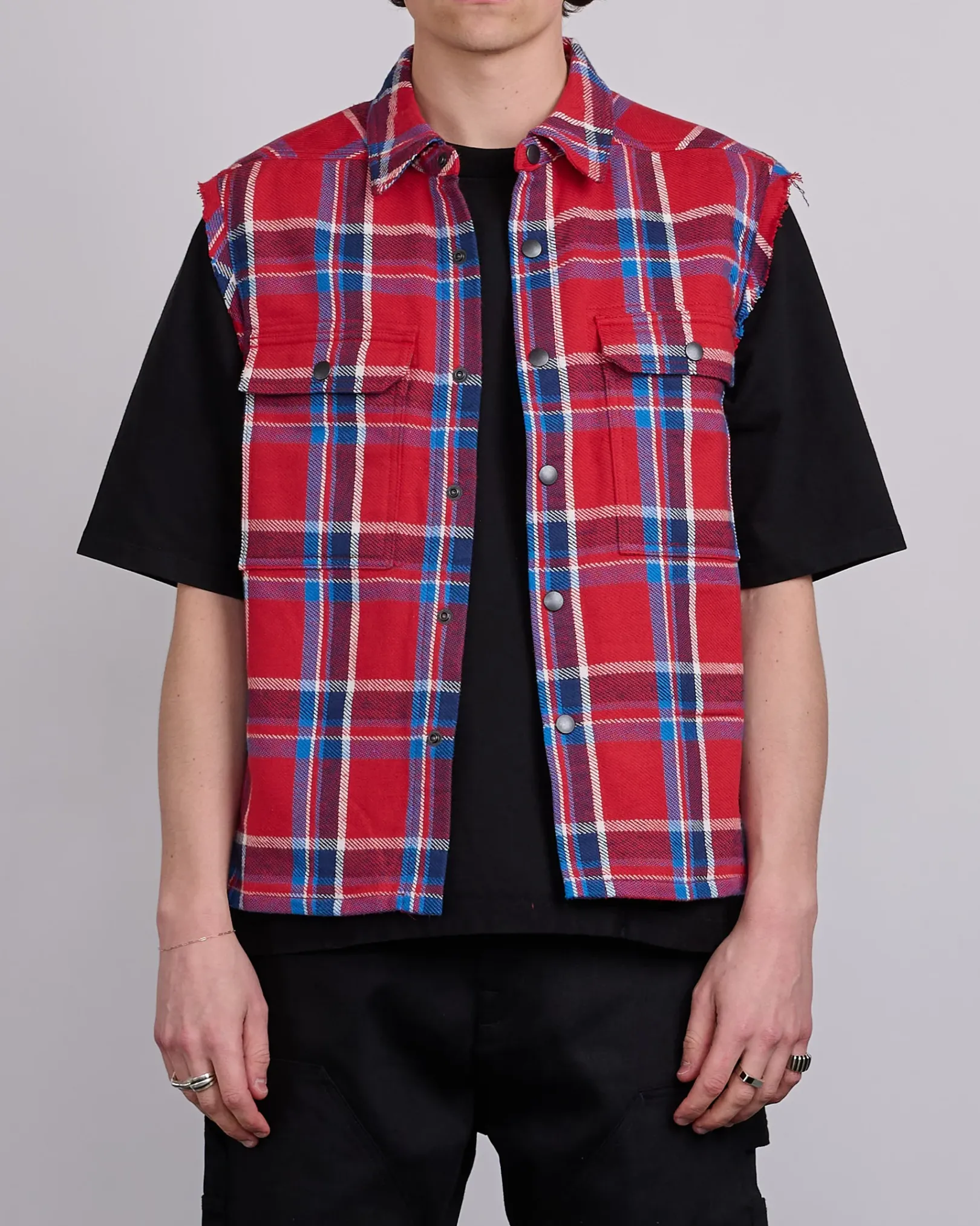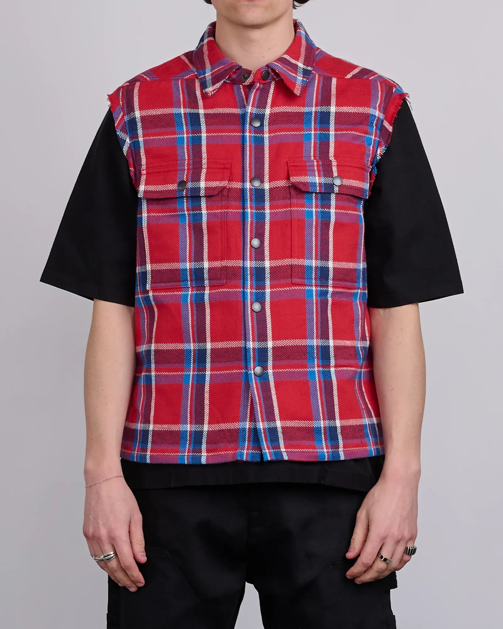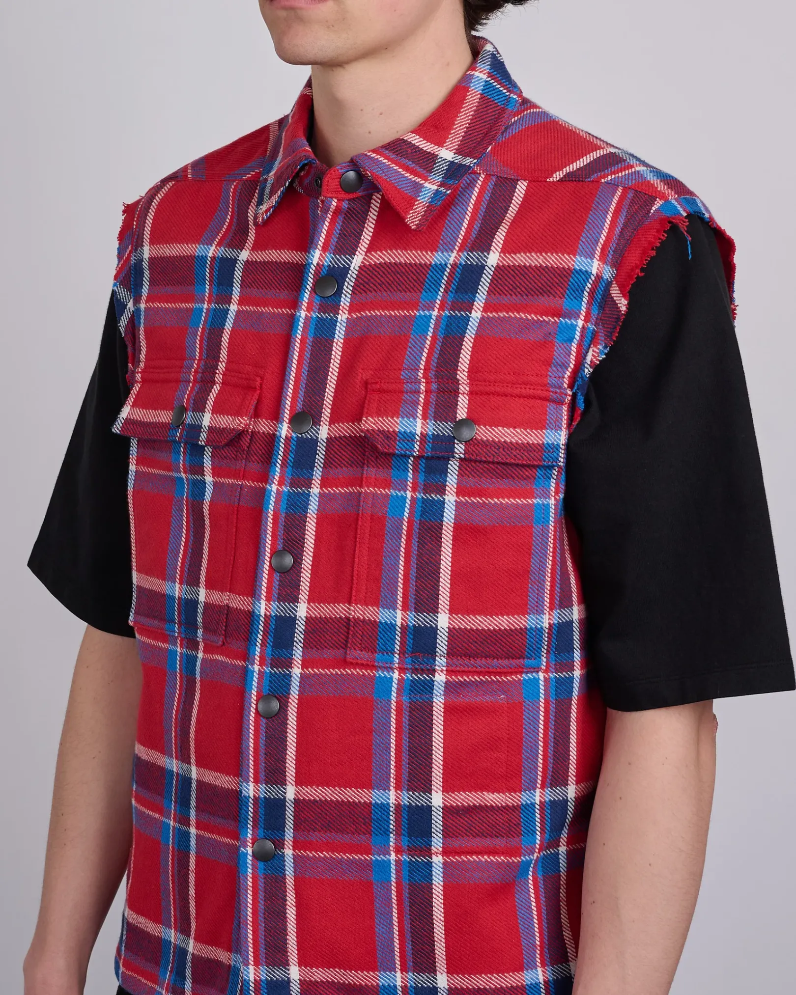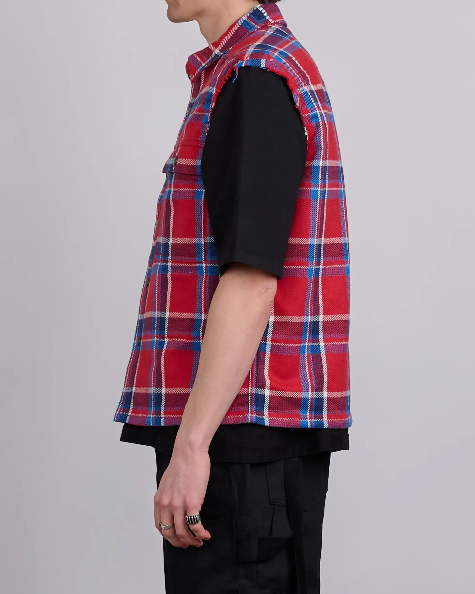 DRKSHDW SS25 HOLLYWOOD sleeveless cropped outershirt in red plaid brushed cotton plaid