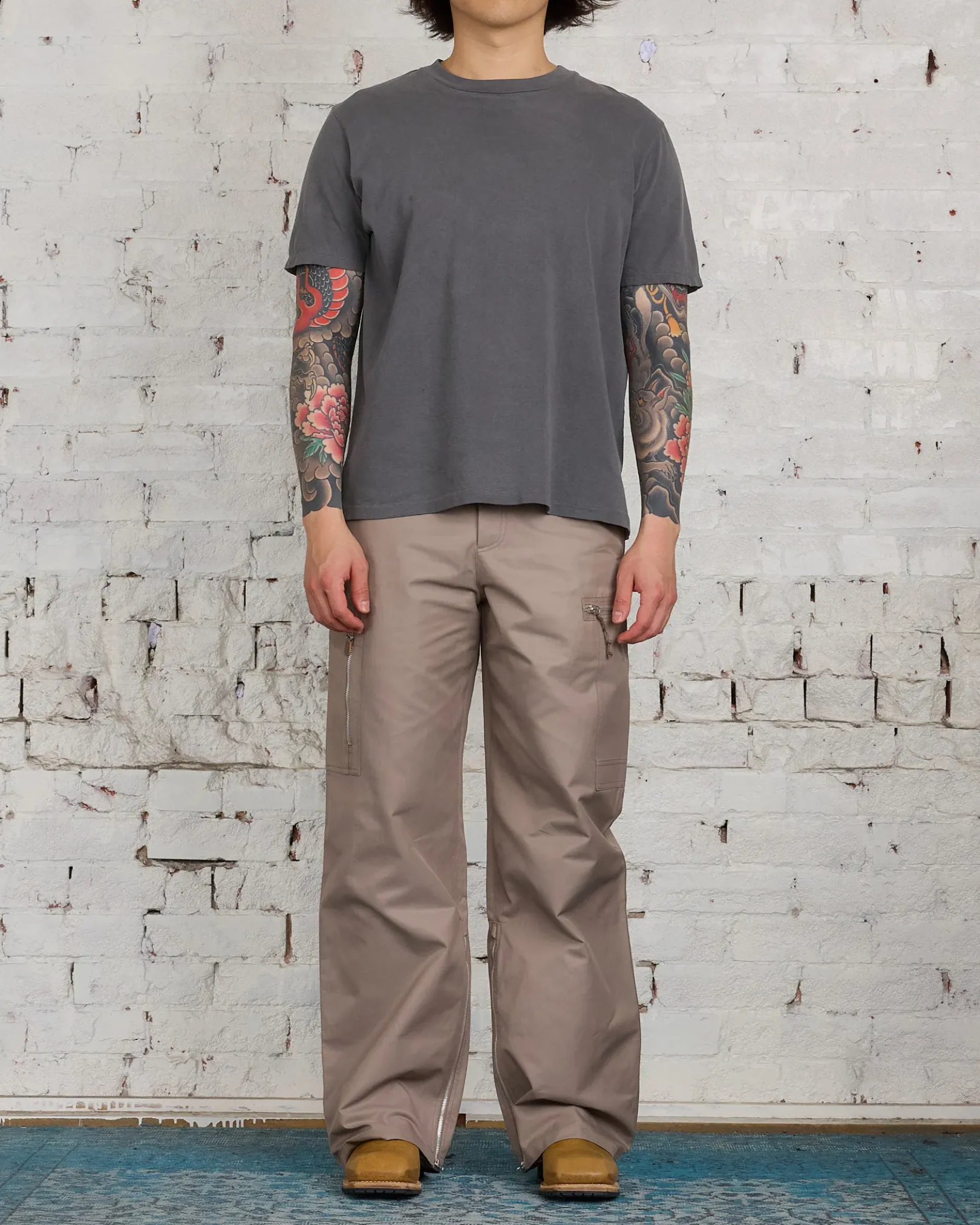 Tactical Cargo in Pebble High Twist Twill. Produced in an Italian cotton and viscose blend high twist twill fabric, the mens Tactical Cargo pants have a relaxed, straight cut and features patch side pockets, gusseted inseam with zip closure and a single back pocket.