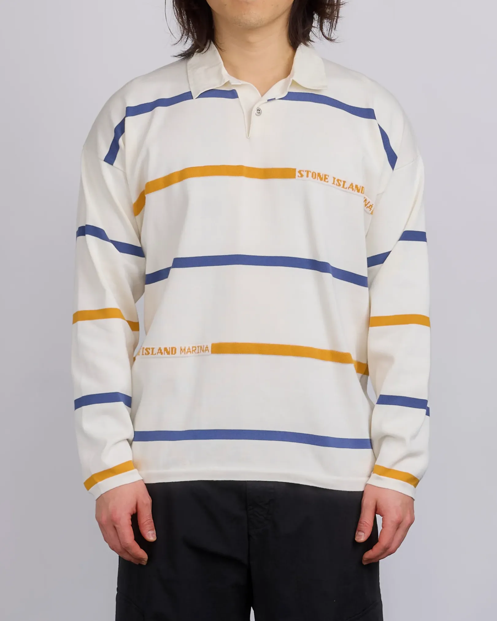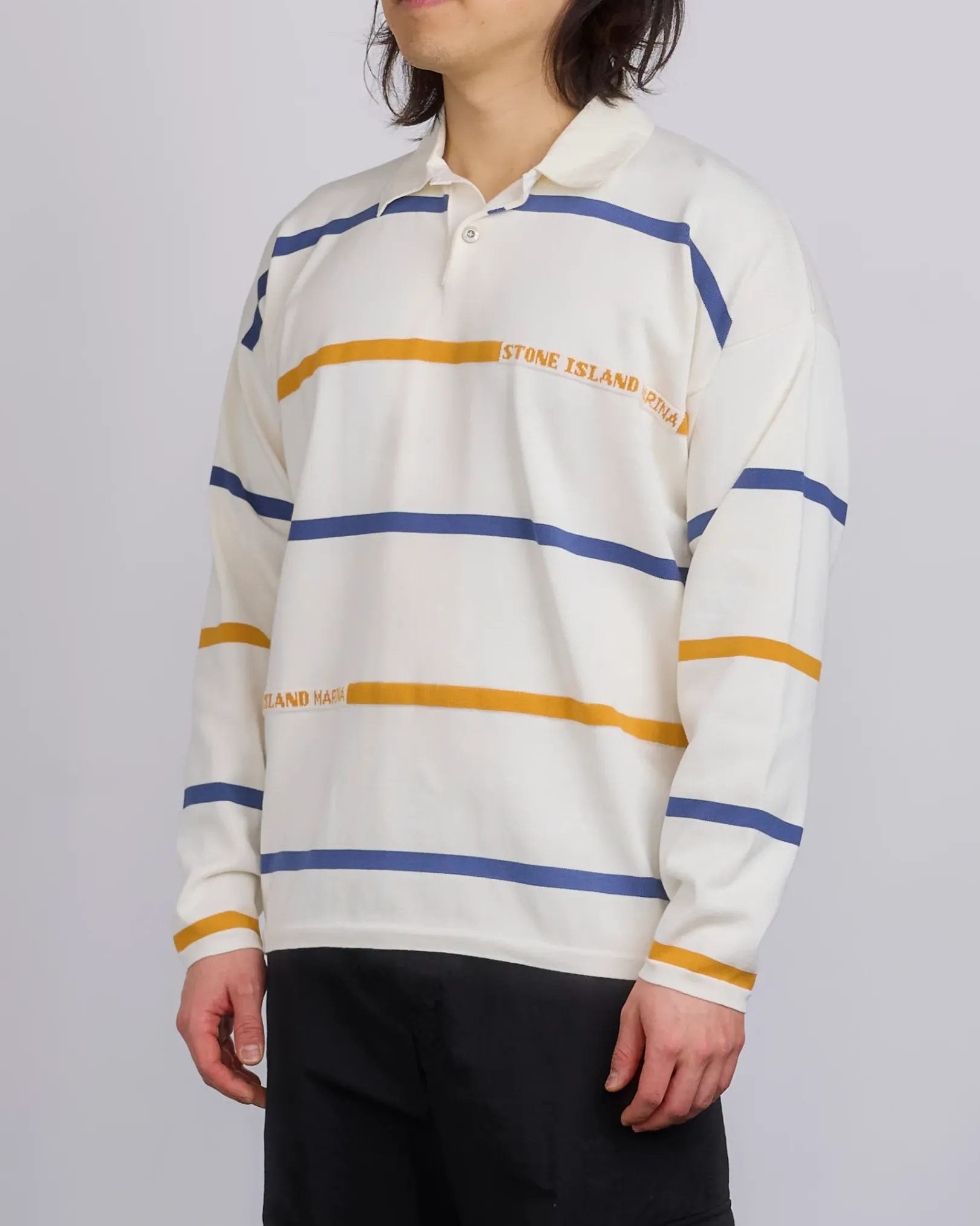 Cotton canvas collar on herringbone cotton tape. Single button fastening at the neck. Drop shoulders. Two of the stripes on the front and back feature a jacquard construction with Stone Island Marina lettering. Flat cuffs and bottom band. Oversized fit.