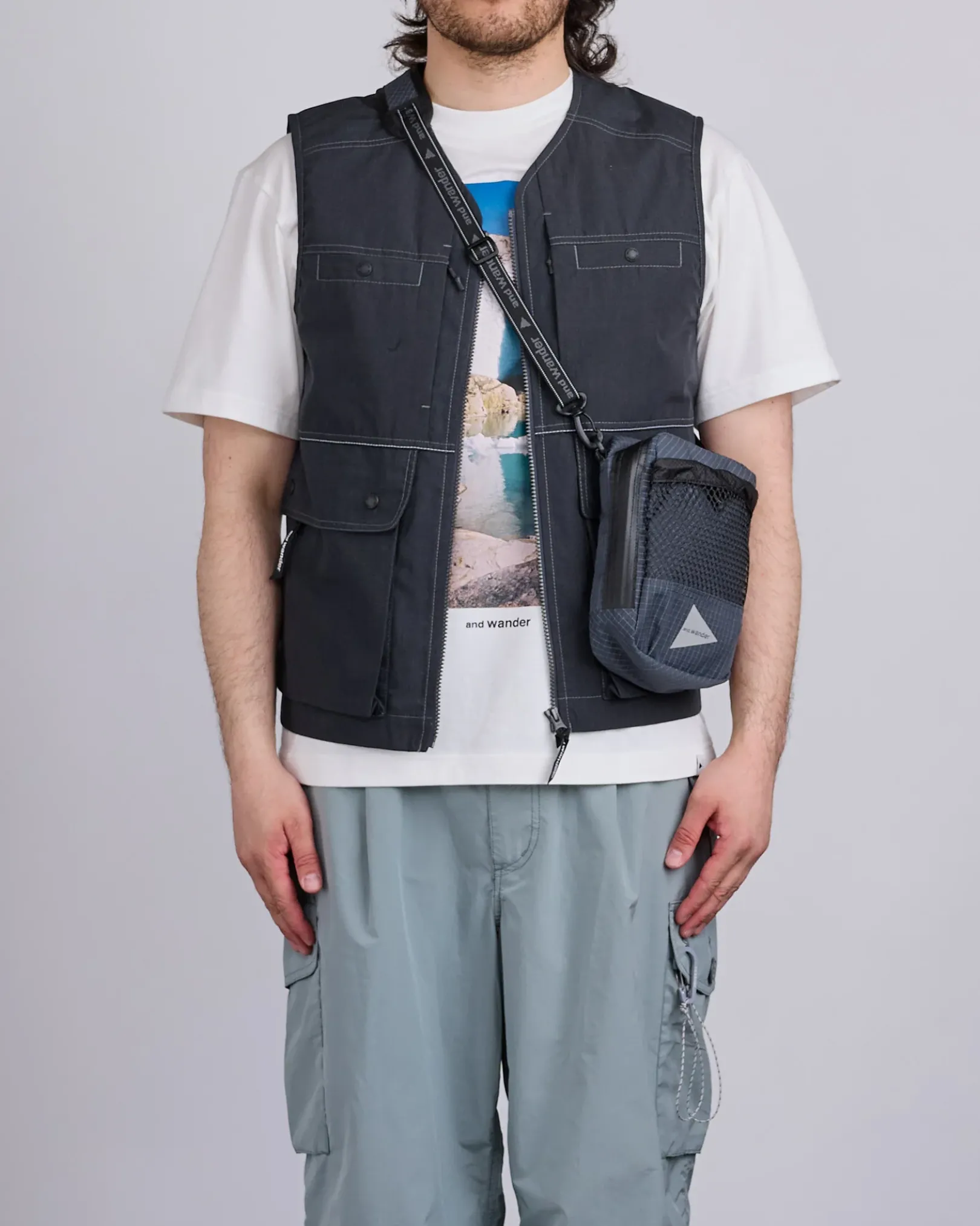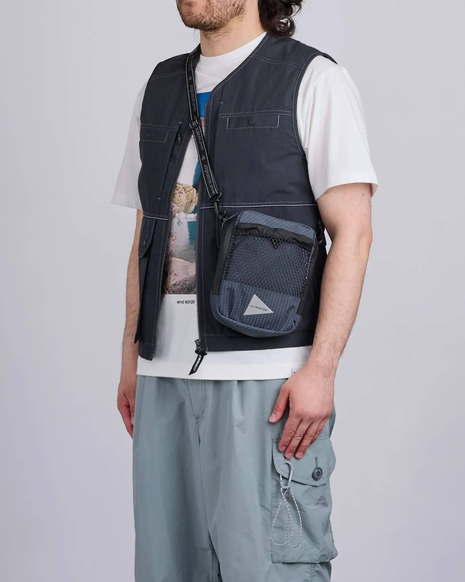 The Reflective Rip Shoulder Pouch from and wander is a compact, highly functional side bag crafted from ECOPAK fabric—a durable, water-repellent material with a 20,000 mm water pressure resistance and low environmental impact. Reinforced with silicone-coated CORDURA nylon by INVISTA, it offers excellent abrasion resistance for daily or outdoor use. Features include a mesh front pocket, main zip compartment, and an adjustable crossbody strap for easy carrying.