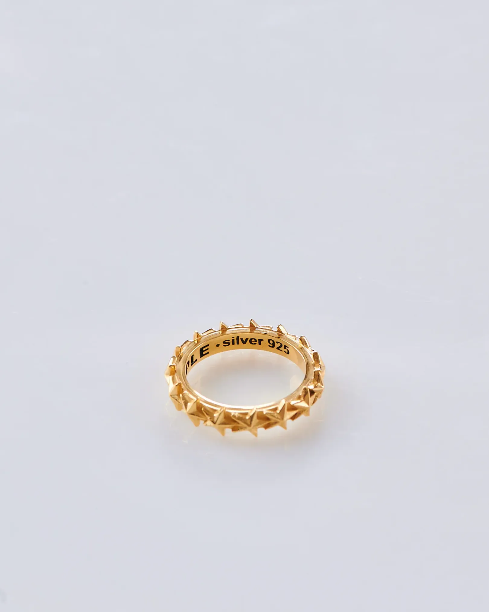 Silver 925 base with 14K gold dip finish. The Star Ring features a 3D star pattern band. Black tinting accents the polished silver to give the ring depth. Hallmarking and MAPLE logo inside.