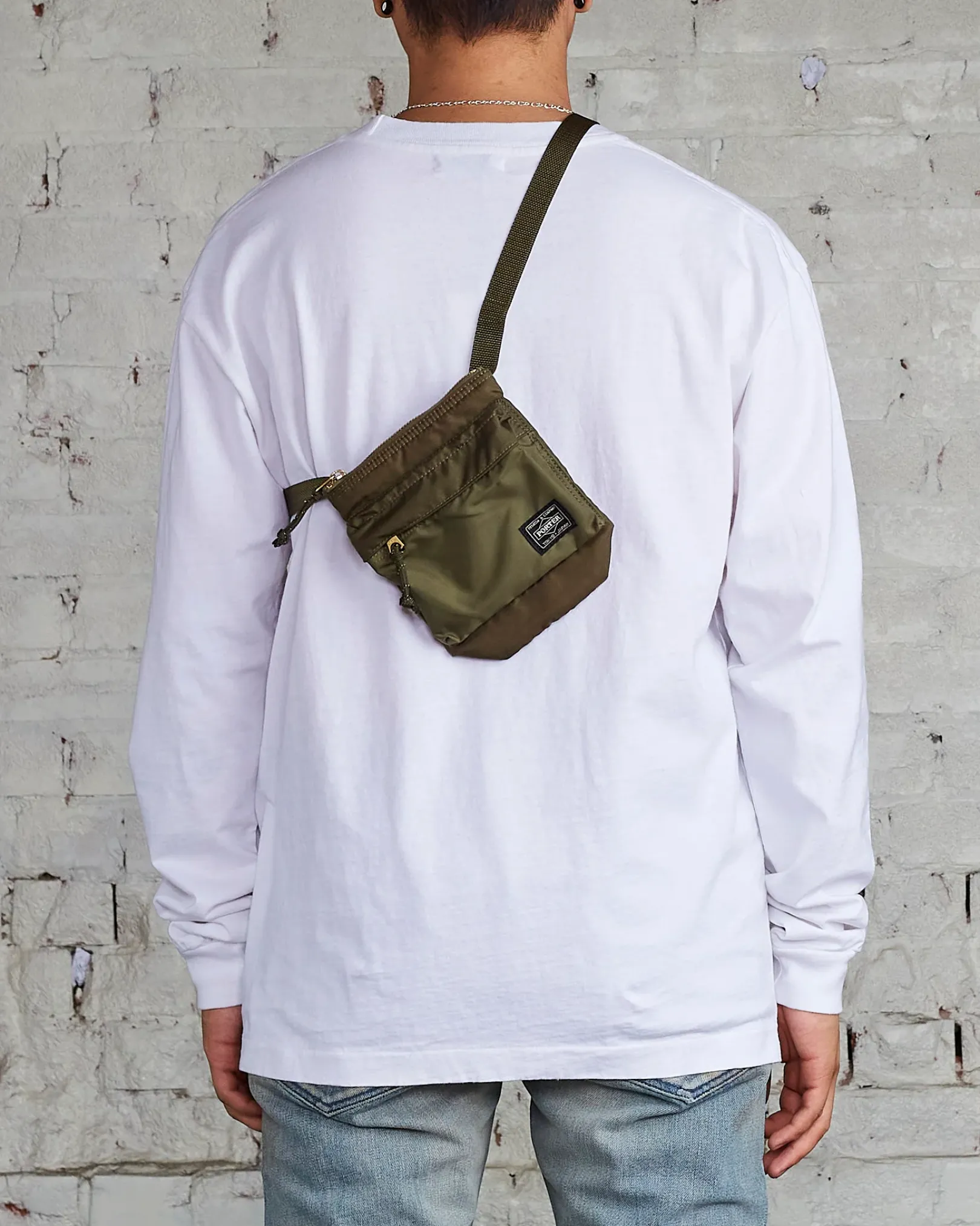 PORTER FORCE Shoulder Pouch in Olive drab. Inspired by military-style goods, this series highlights the unique color variations found by chance in the fabric. Made with durable 210 denier 6 nylon, originally used for rubber boats, this bag offers functional design with an interior key clip, front pocket, zip closure, and interior divider.