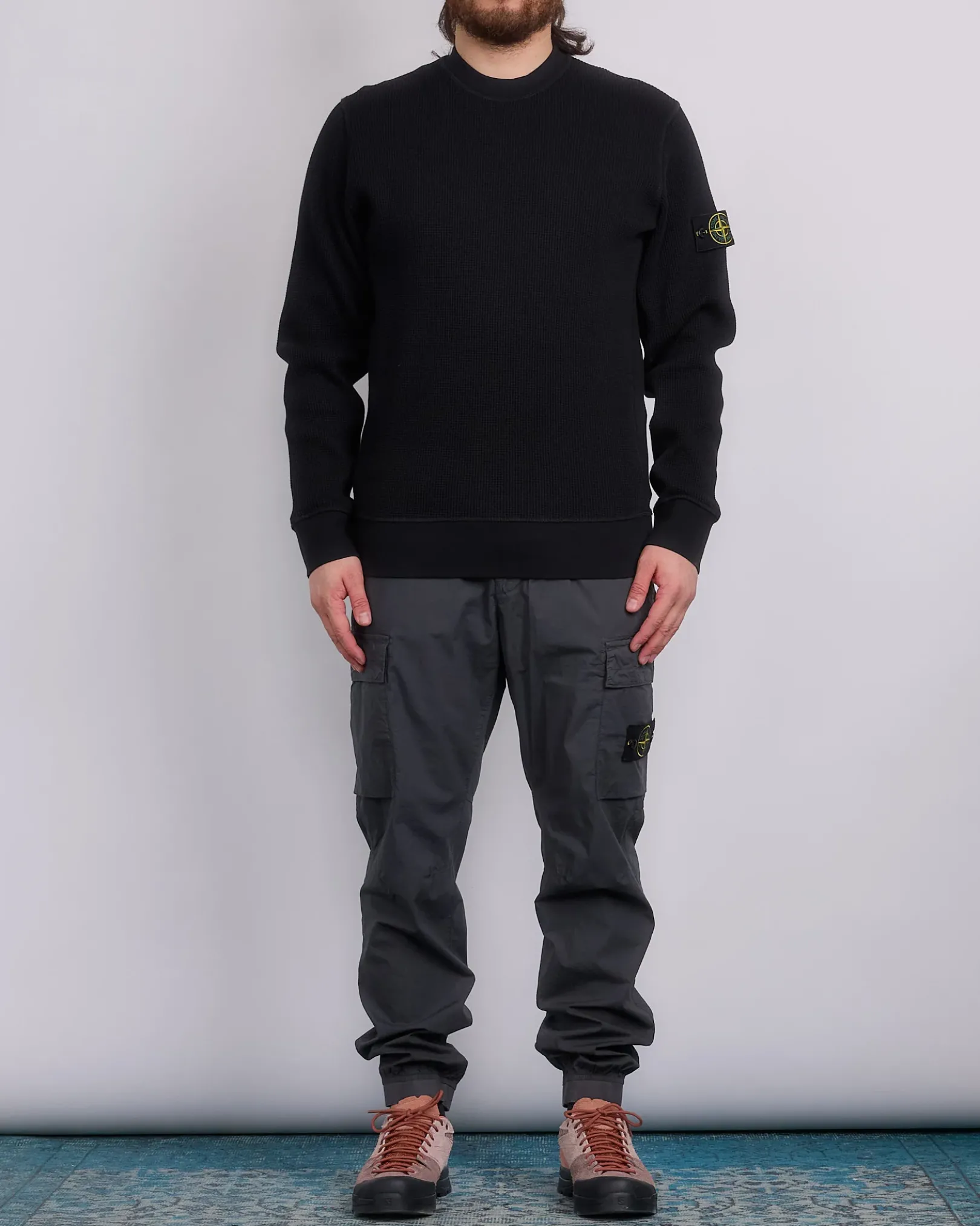 Standing hand pockets with hidden zipper fastening. One slit back pocket with hidden snap fastening. Bellows pocket on legs with flap and hidden snap fastening; left pocket features the Stone Island badge. Elasticated tape on leg bottoms. Elasticated waistband with inner drawstring. Zipper fly. Regular tapered fit.