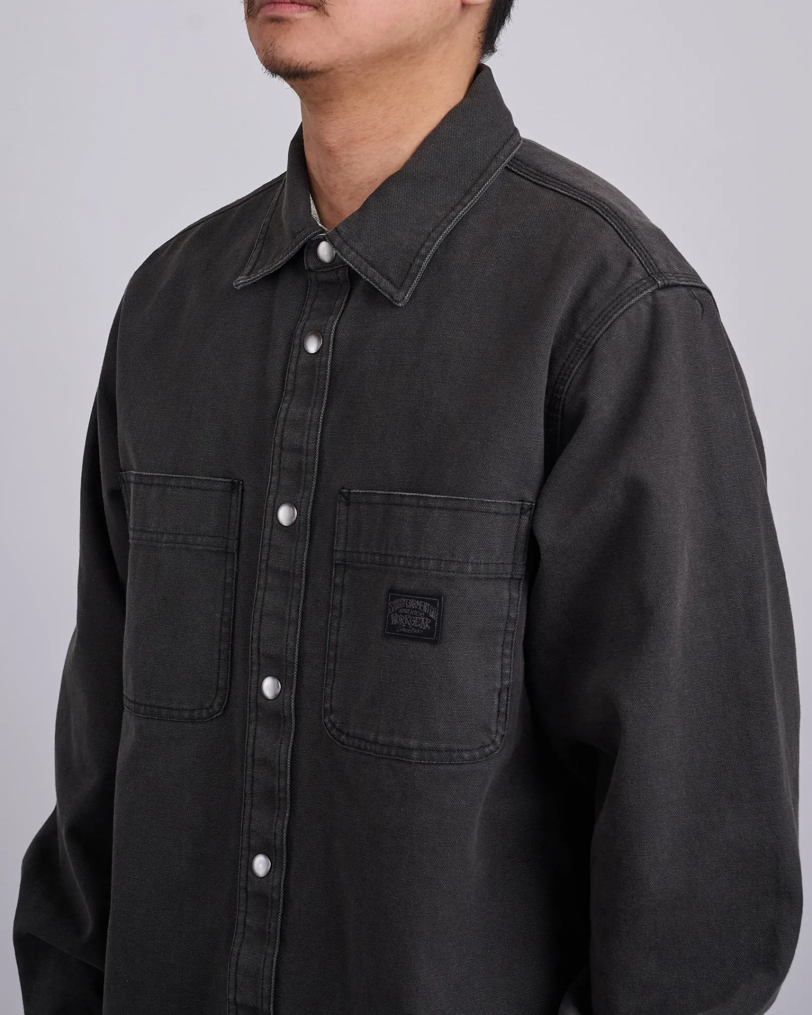 Relaxed fit shirt jacket in stonewashed cotton canvas with a plaid lining. Features patch pockets and snaps at the placket and cuffs. Stüssy authentic workgear label sewn at left pocket.