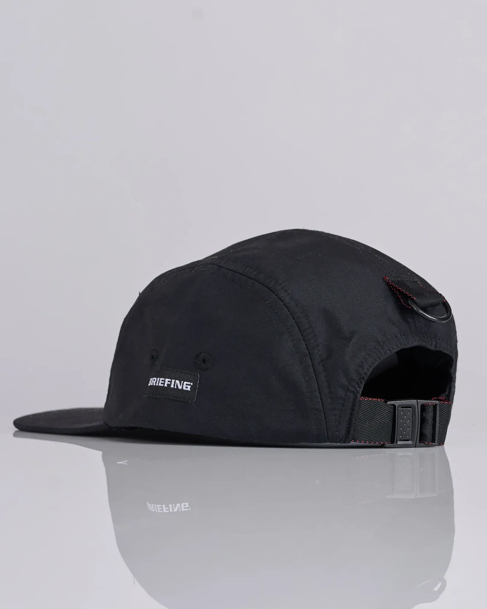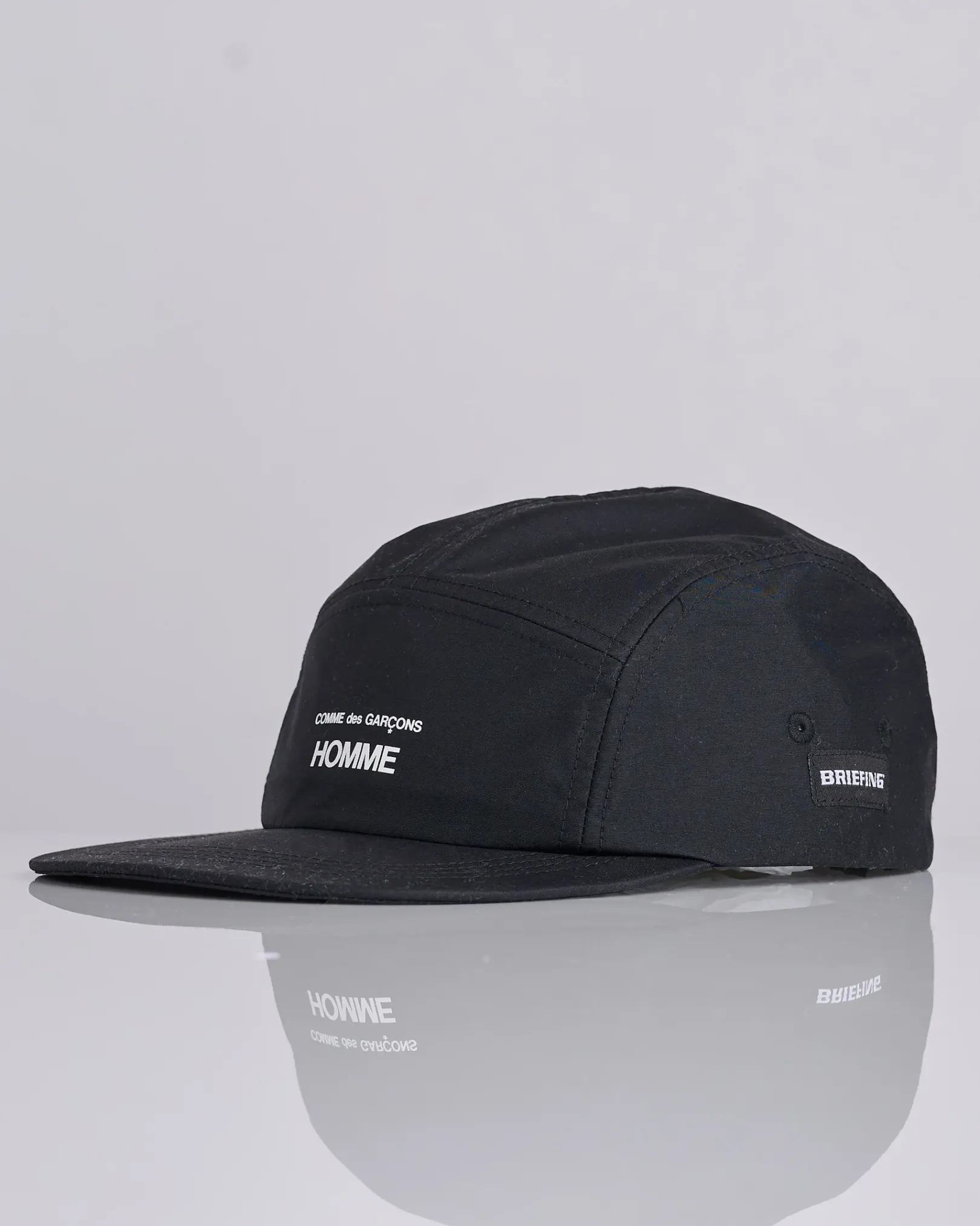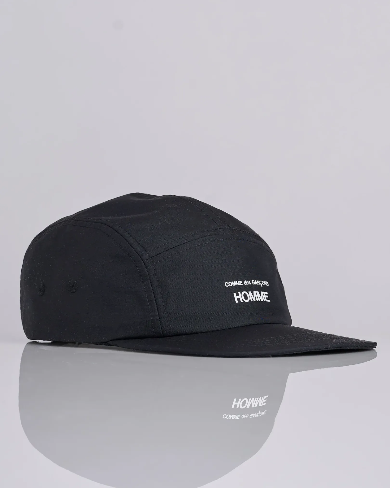 This 5-panel cap from COMME des GARÇONS HOMME is crafted from 100% nylon, offering durability and a sleek finish. Featuring the iconic printed CDG logo on the front, embroidered eyelets for added ventilation, and a D-ring pull on the rear for an adjustable fit.