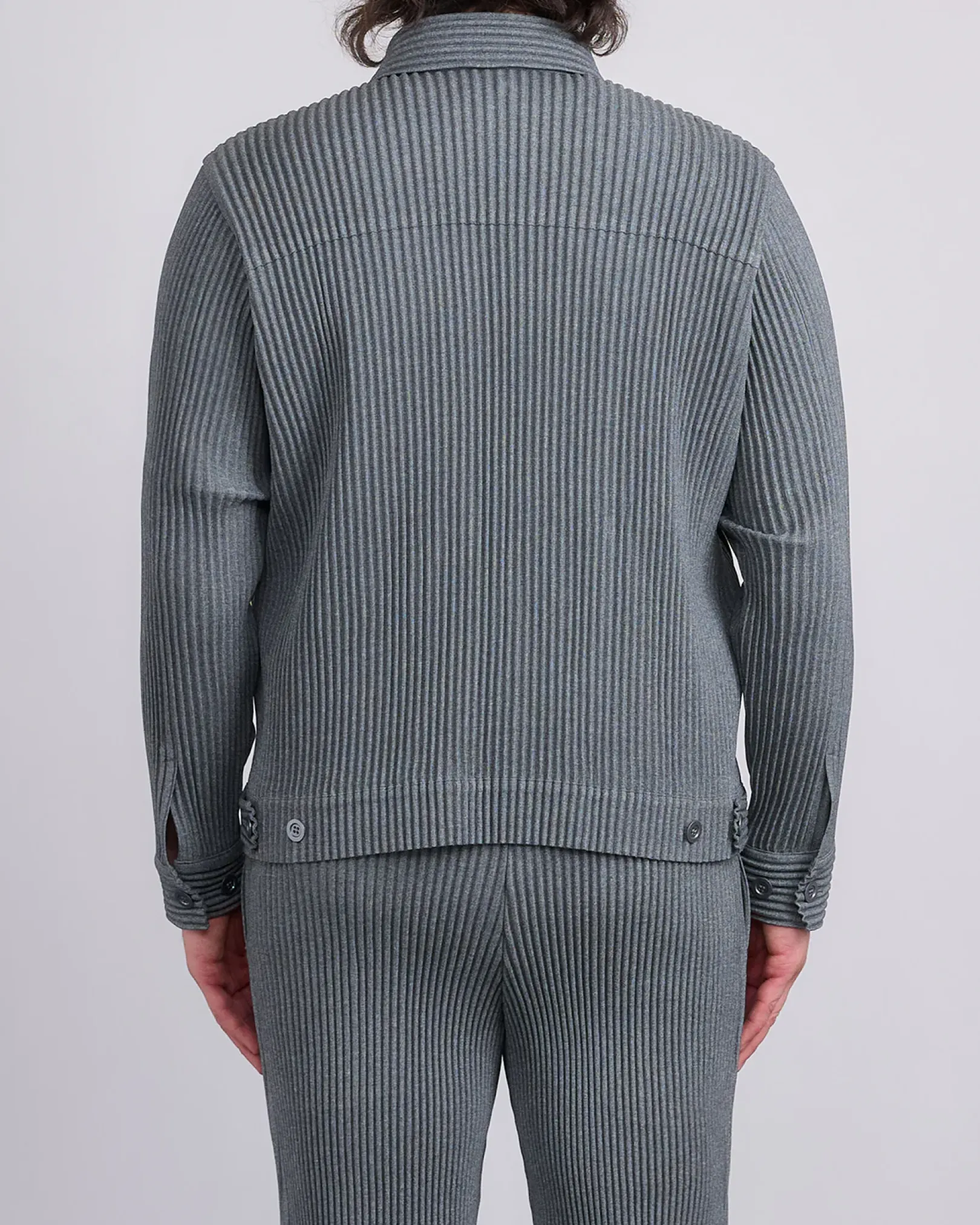 This trucker-style pleated jacket in Gray has chest pockets, side pockets and button fastenings.