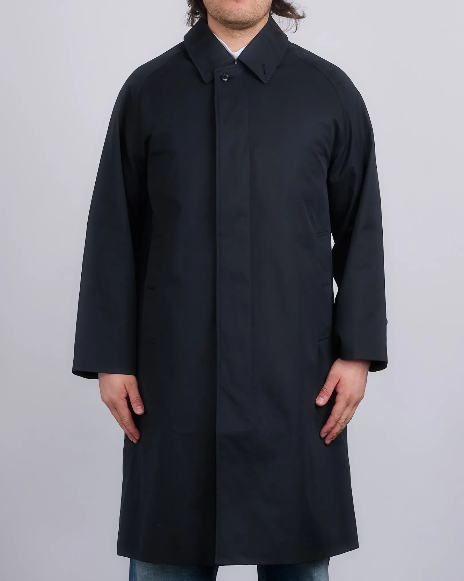 The nanamica Balmacaan Coat is a refined outerwear piece designed with a relaxed A-line silhouette, blending classic tailoring with modern performance. Crafted from 2-layer ePE GORE-TEX fabric, it features a non-fluorine waterproof and breathable membrane with a water-repellent finish, ensuring protection from the elements while maintaining environmental consciousness. The outer fabric is nanamica’s original yarn-dyed cotton gabardine, while the interior is lined with a house check pattern organic cotton and COOLMAX® blend for added comfort. Voluminous single raglan sleeves enhance mobility, while fully seam-taped construction and highly waterproof GORE-TEX pocket linings reinforce its durability.