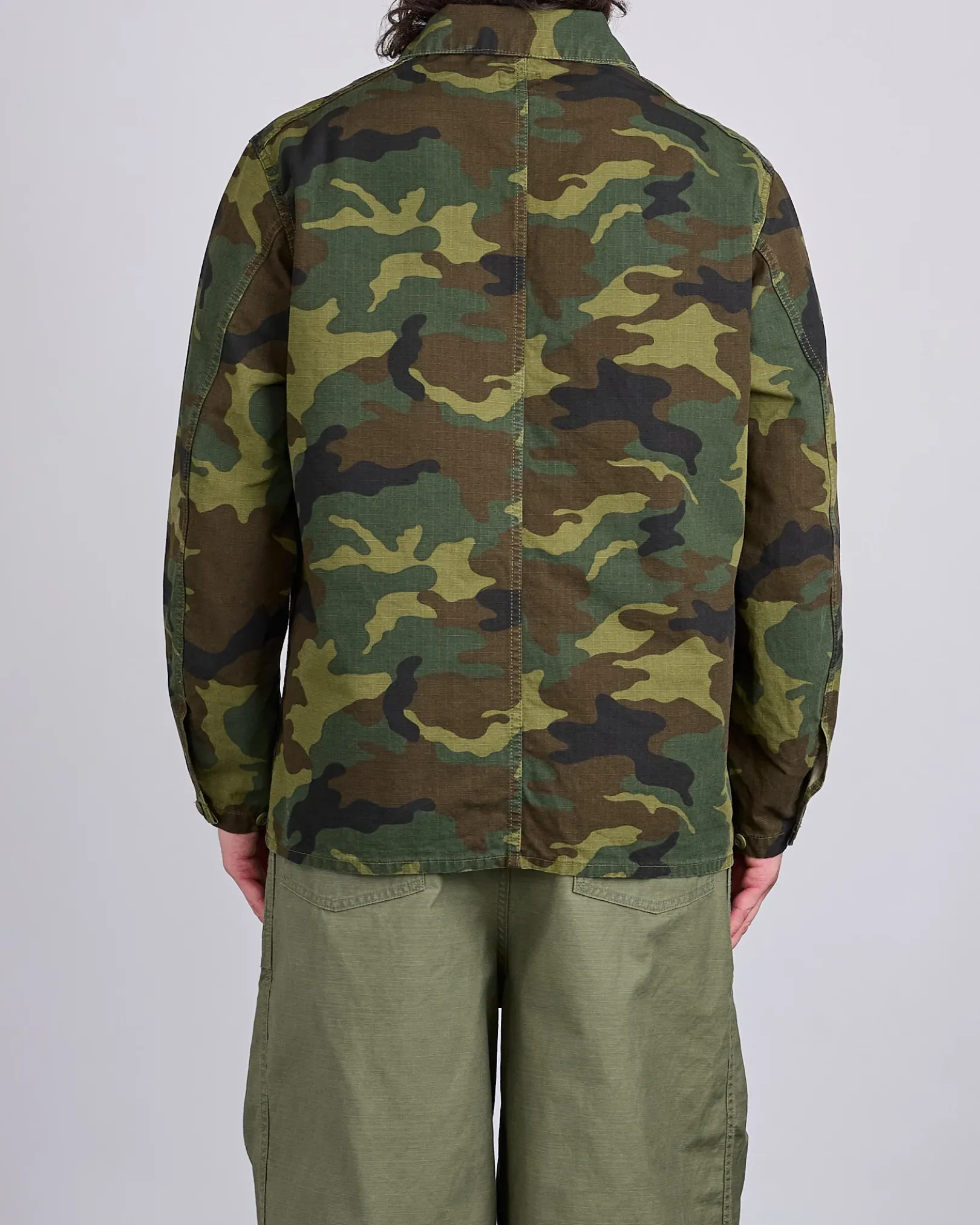 The D.N. Coverall Jacket in Woodland Camo by NEEDLES channels military-inspired workwear through a refined, Japanese lens. Cut from durable cotton ripstop with a relaxed, boxy fit, it features a spread collar, patch pockets, button front closure, and adjustable cuffs. A subtle embroidered logo at the chest adds signature detailing. Unlined for lightweight layering and made in Japan for uncompromising quality.