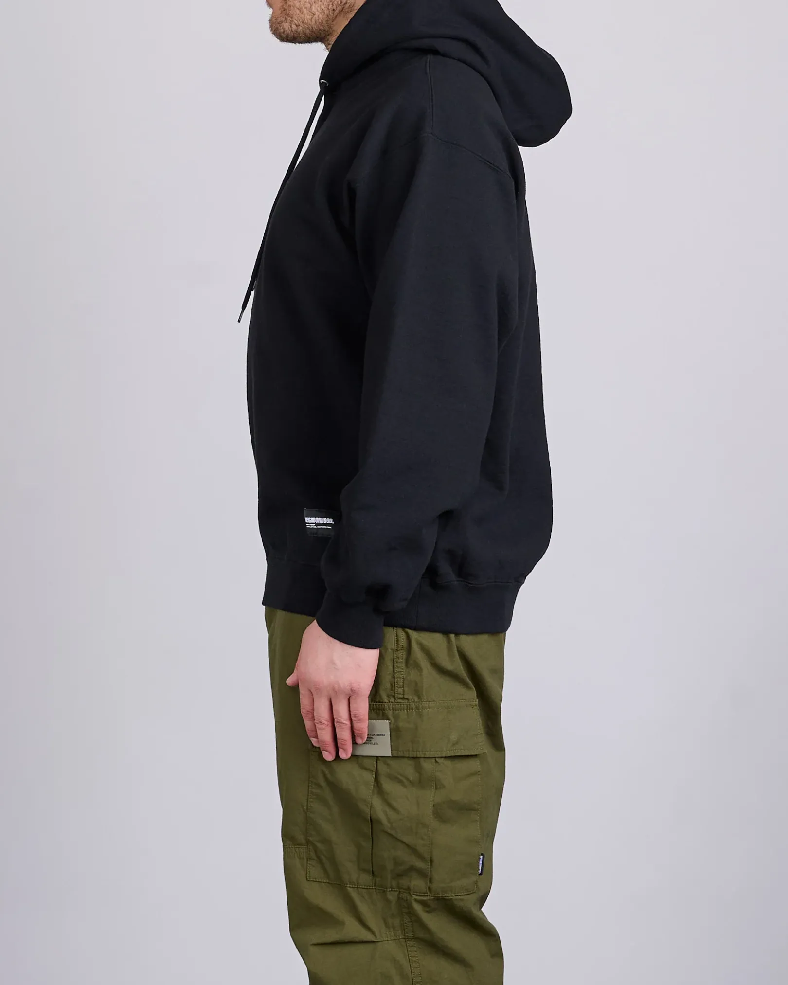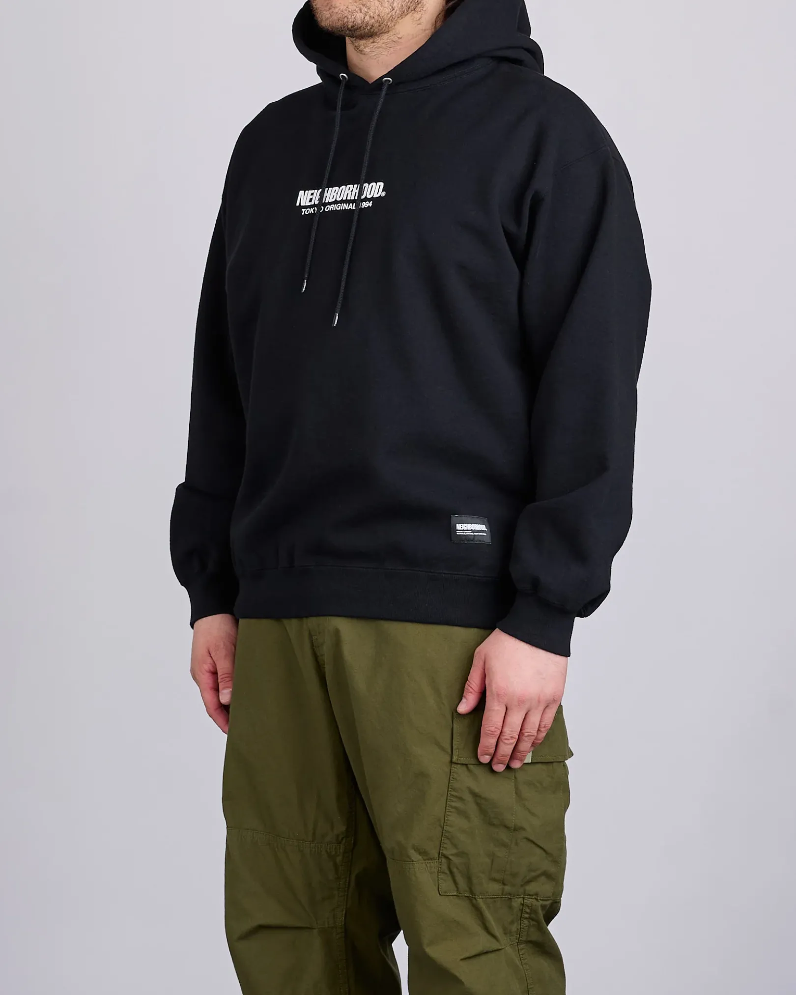 This pullover hoodie from Neighborhood is crafted from heavyweight U.S. cotton-backed fabric, offering structure and comfort. Featuring a printed front logo, original cell-tip drawcords, and a clip tag at the side seam, it’s designed with a relaxed fit and drop shoulders for a timeless streetwear silhouette.