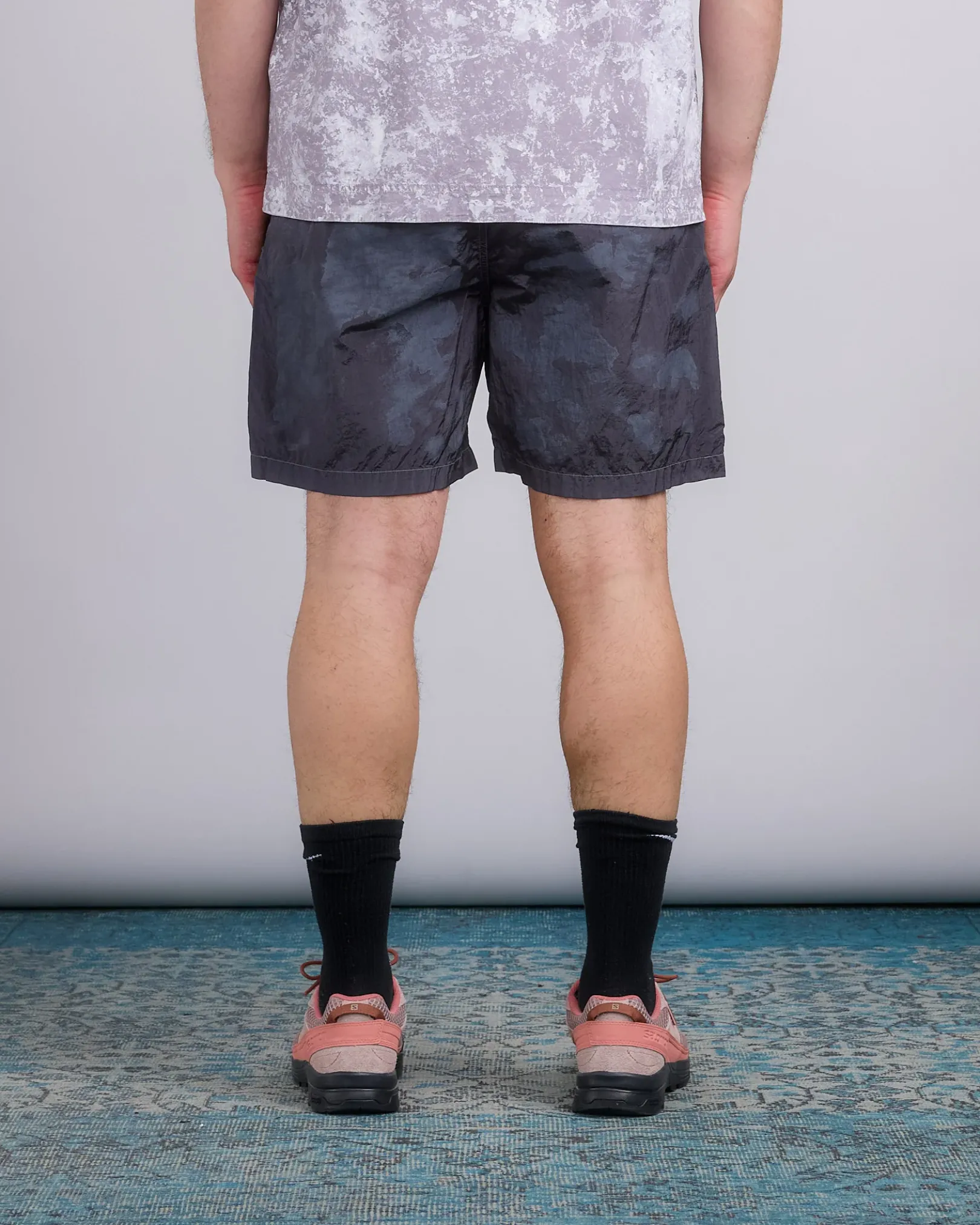 Mid-length swim shorts made in a new responsible Stone Island iridescent Nylon Metal fabric. The evolution of this iconic fabric sees the use of ECONYL® regenerated yarns: the life-ended nylon, pre- and post-consumer, is recycled with a complex depolymerization process to create this fiber that features the same intrinsic characteristics of nylon from fossil raw material. The finished piece then undergoes an elaborate double-dye procedure.