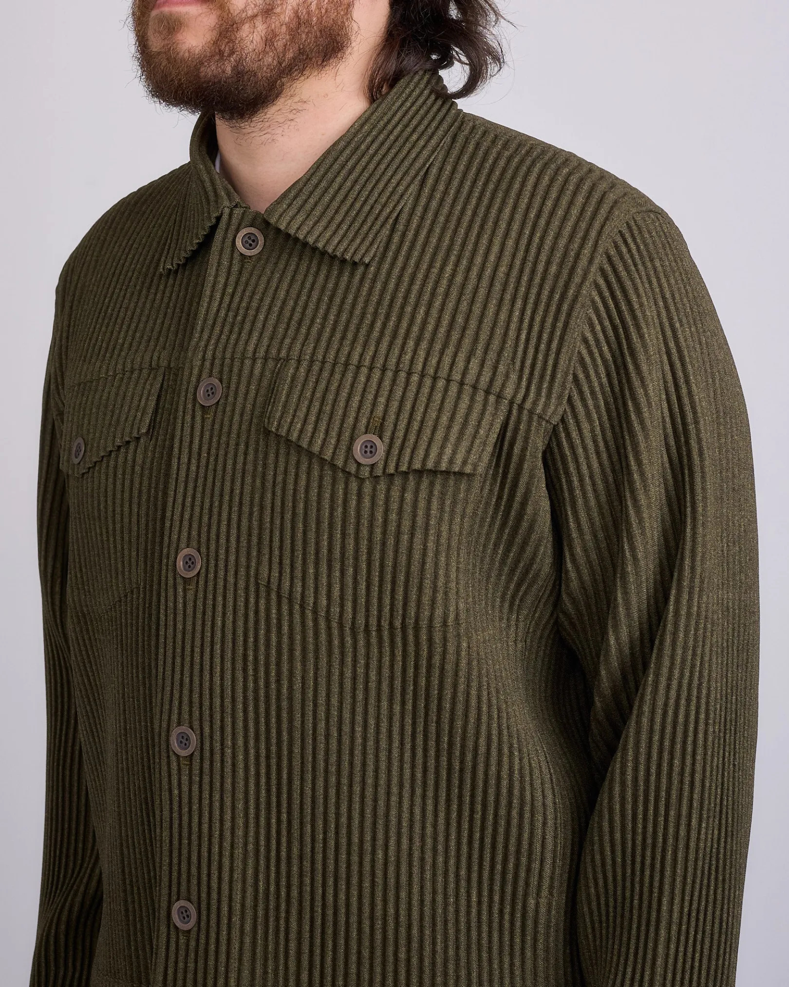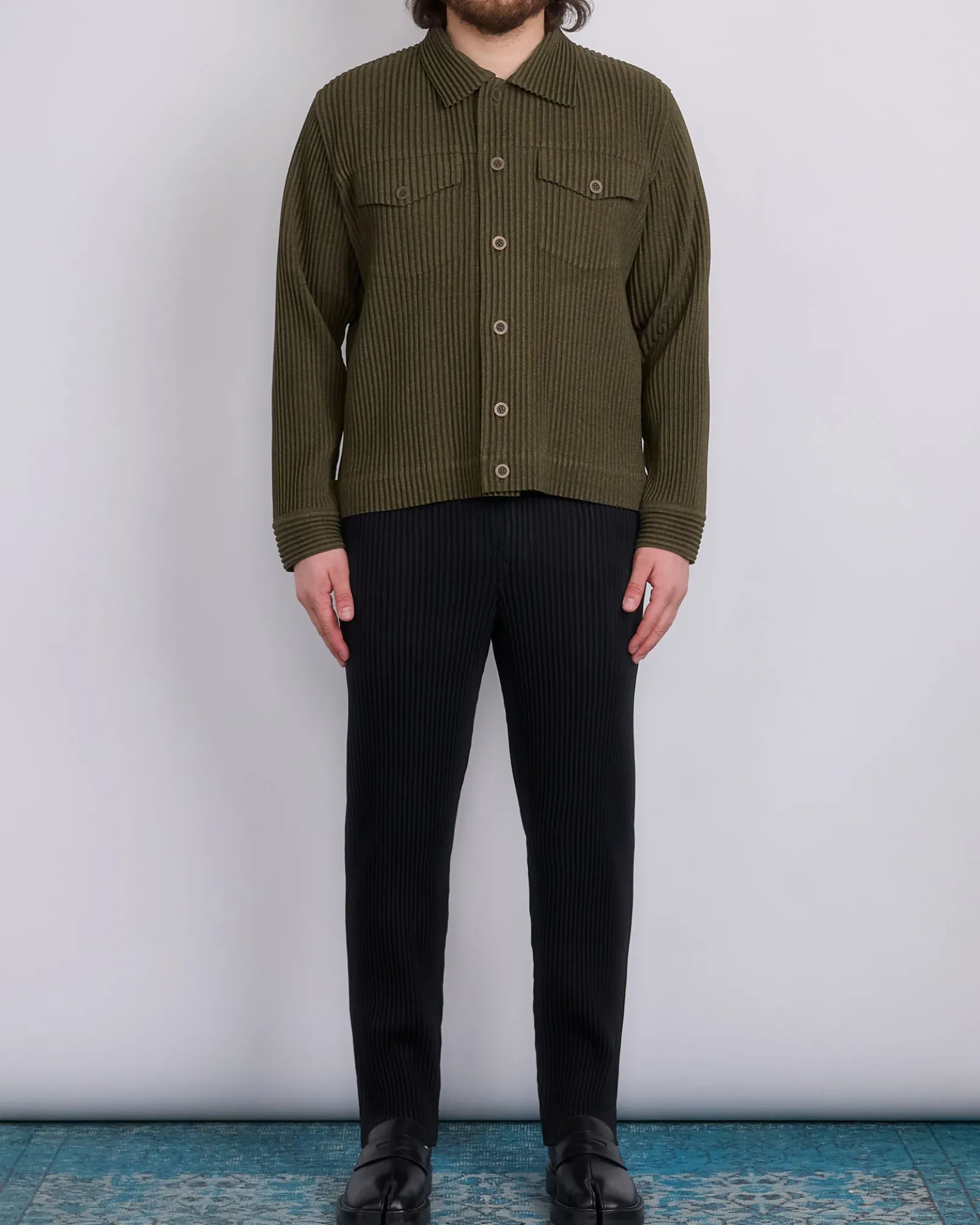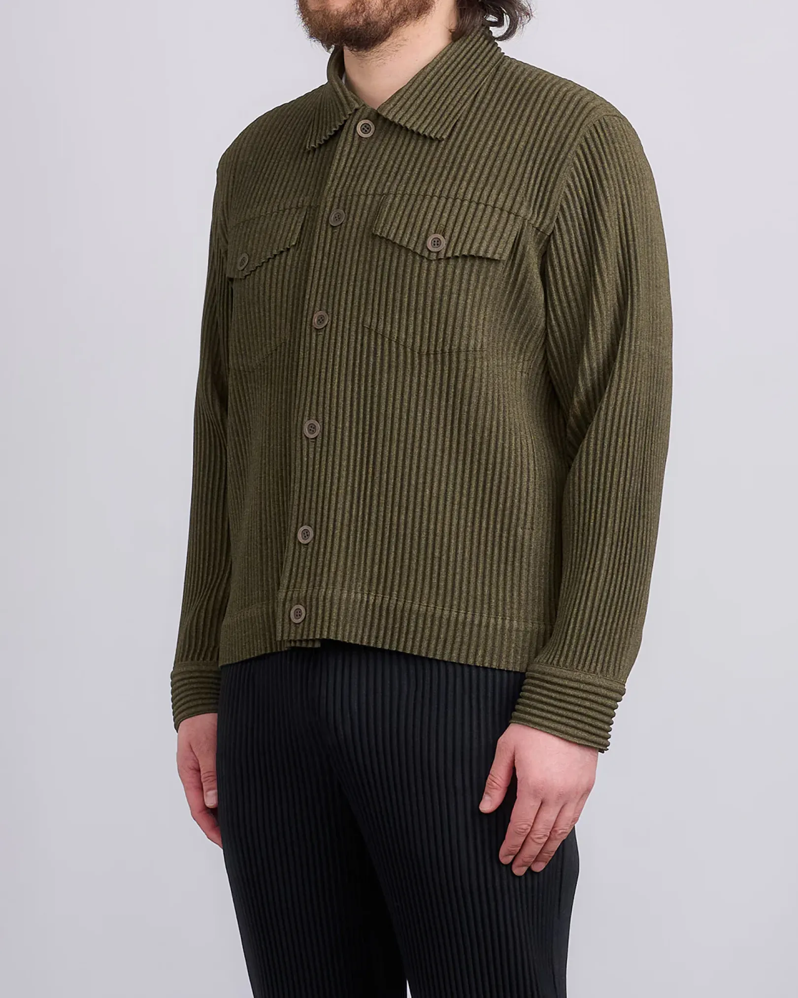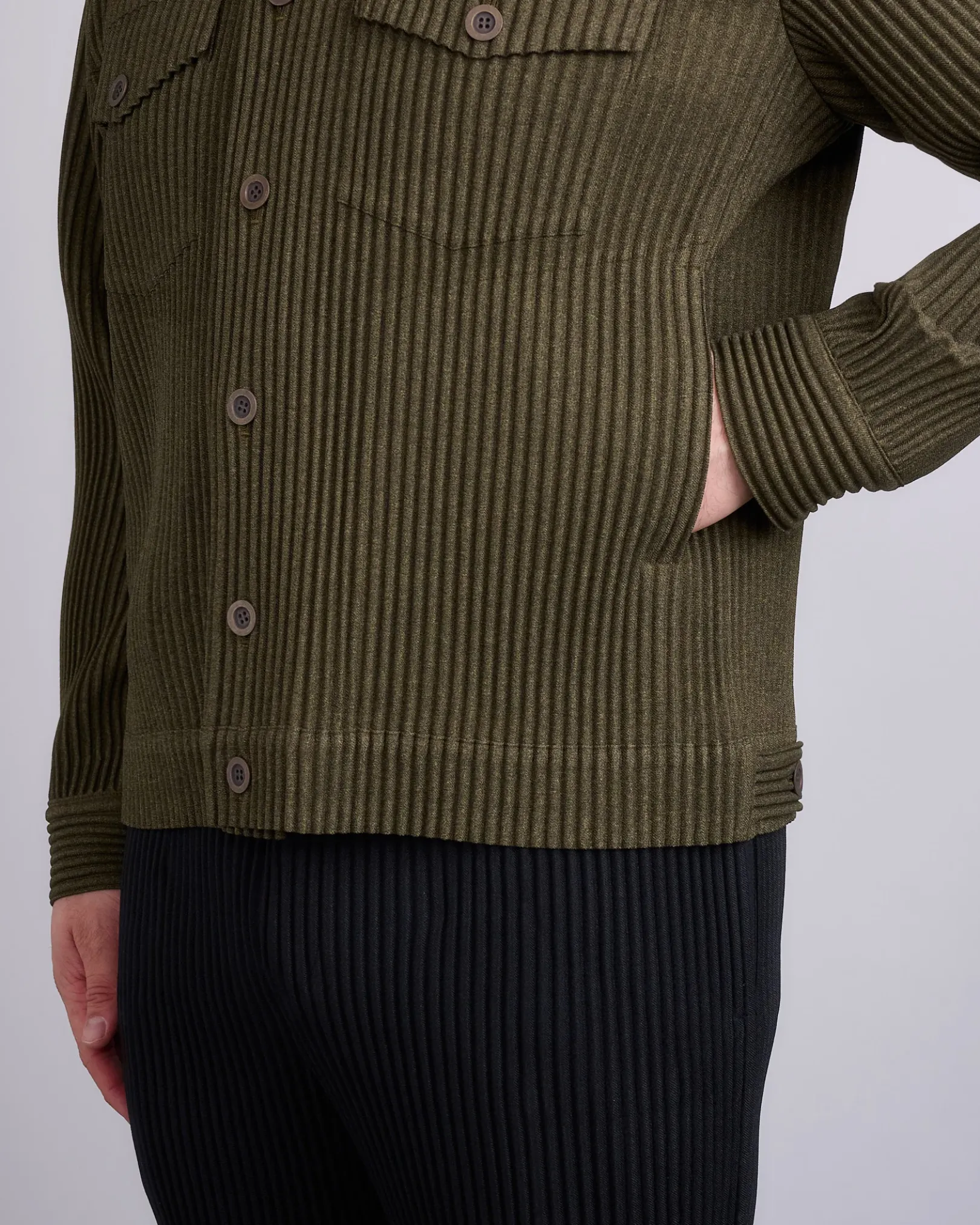 This trucker-style pleated jacket in khaki has chest pockets, side pockets and button fastenings.