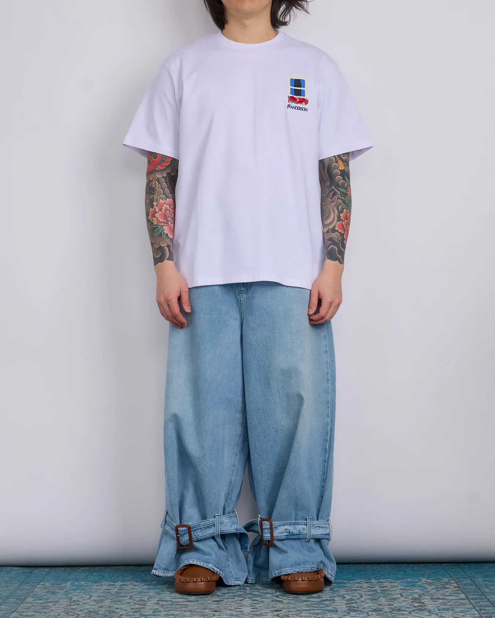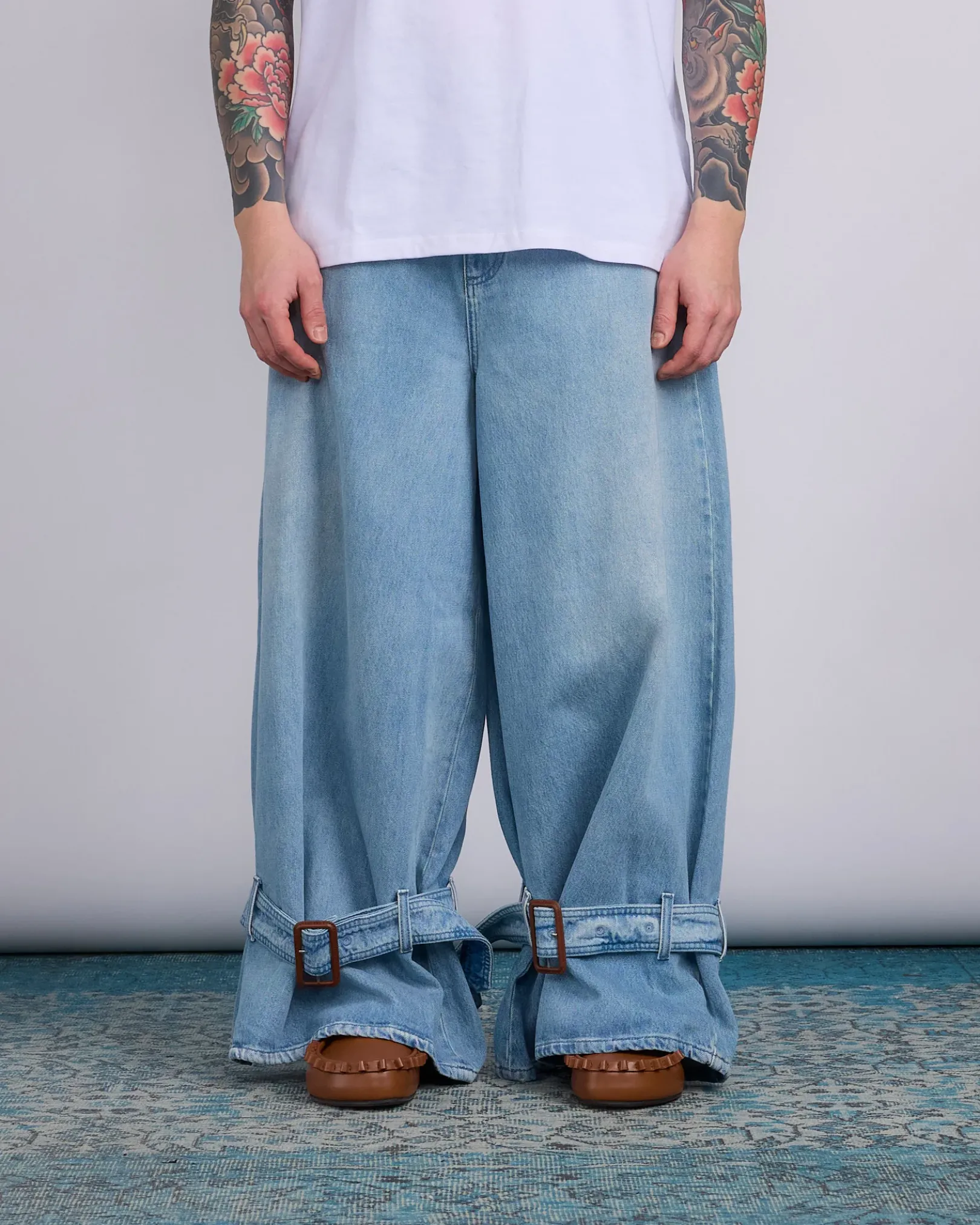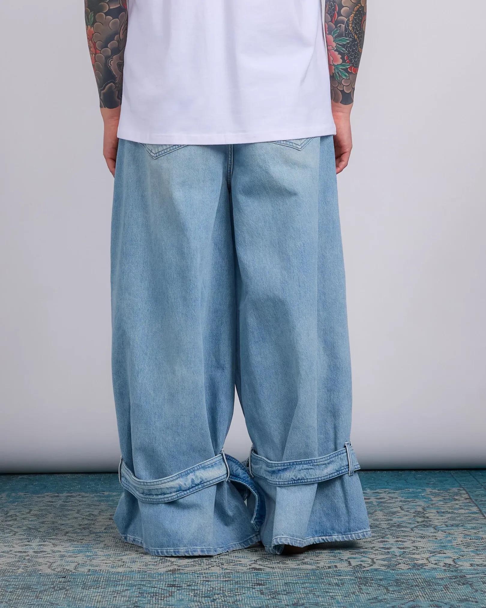 - Wide leg jeans with belted cuff detailing