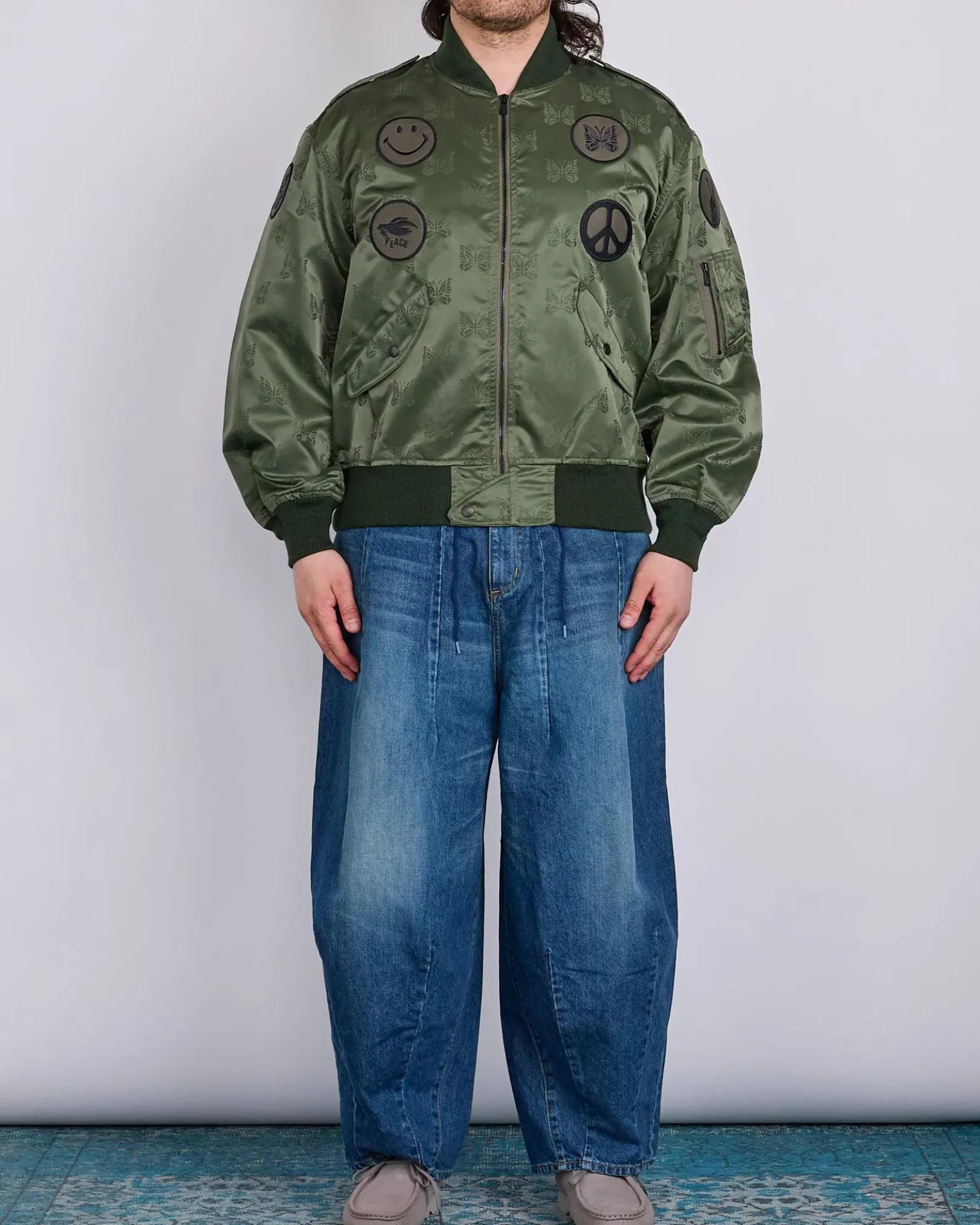 Needles reimagines the classic L2-B flight jacket with its signature aesthetic, incorporating papillon jacquard detailingand an array of embroidered patches throughout. Made from lightweight nylon, the jacket is unlined for a less bulky silhouette—ideal for layering in transitional weather. With a relaxed fit and traditional bomber styling, it’s a standout piece that blends military heritage with the brand’s eclectic, fashion-forward touch.