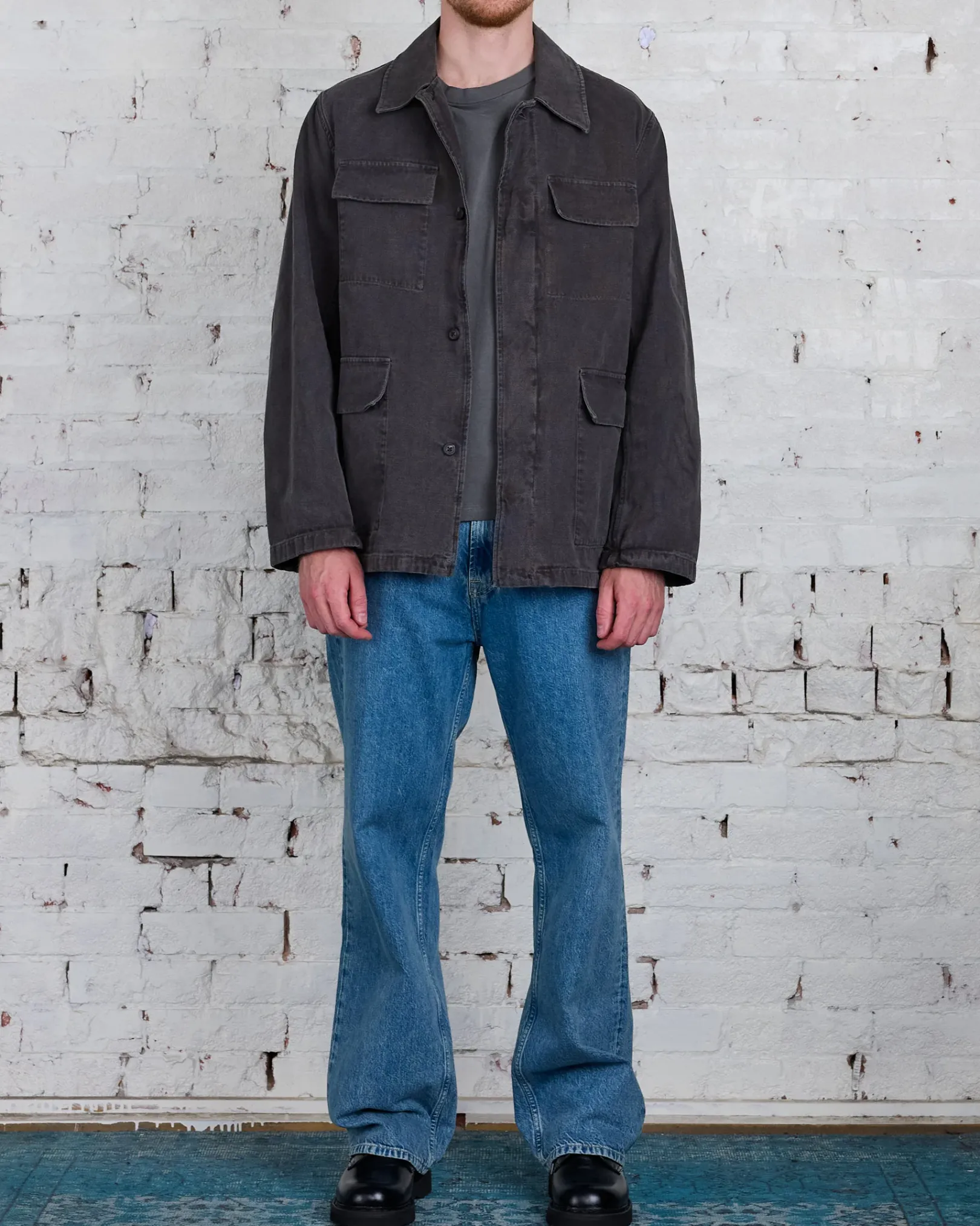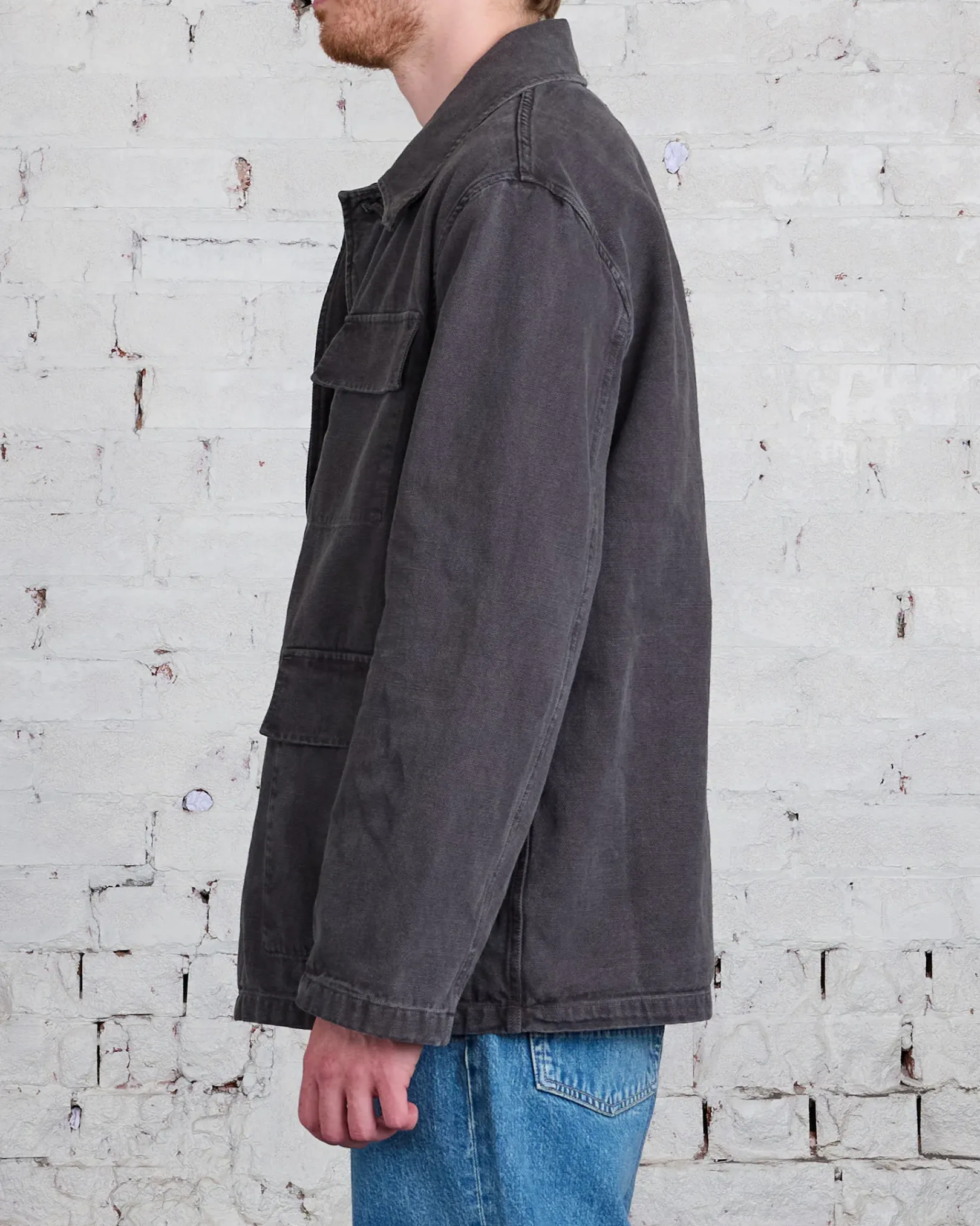 Uniform Jacket in Ash Black Reborn Canvas. Produced in a piece dyed Italian cotton canvas, the mens Uniform Jacket has a relaxed, boxy fit and features four patch pockets, a covered placket and horn buttons.
