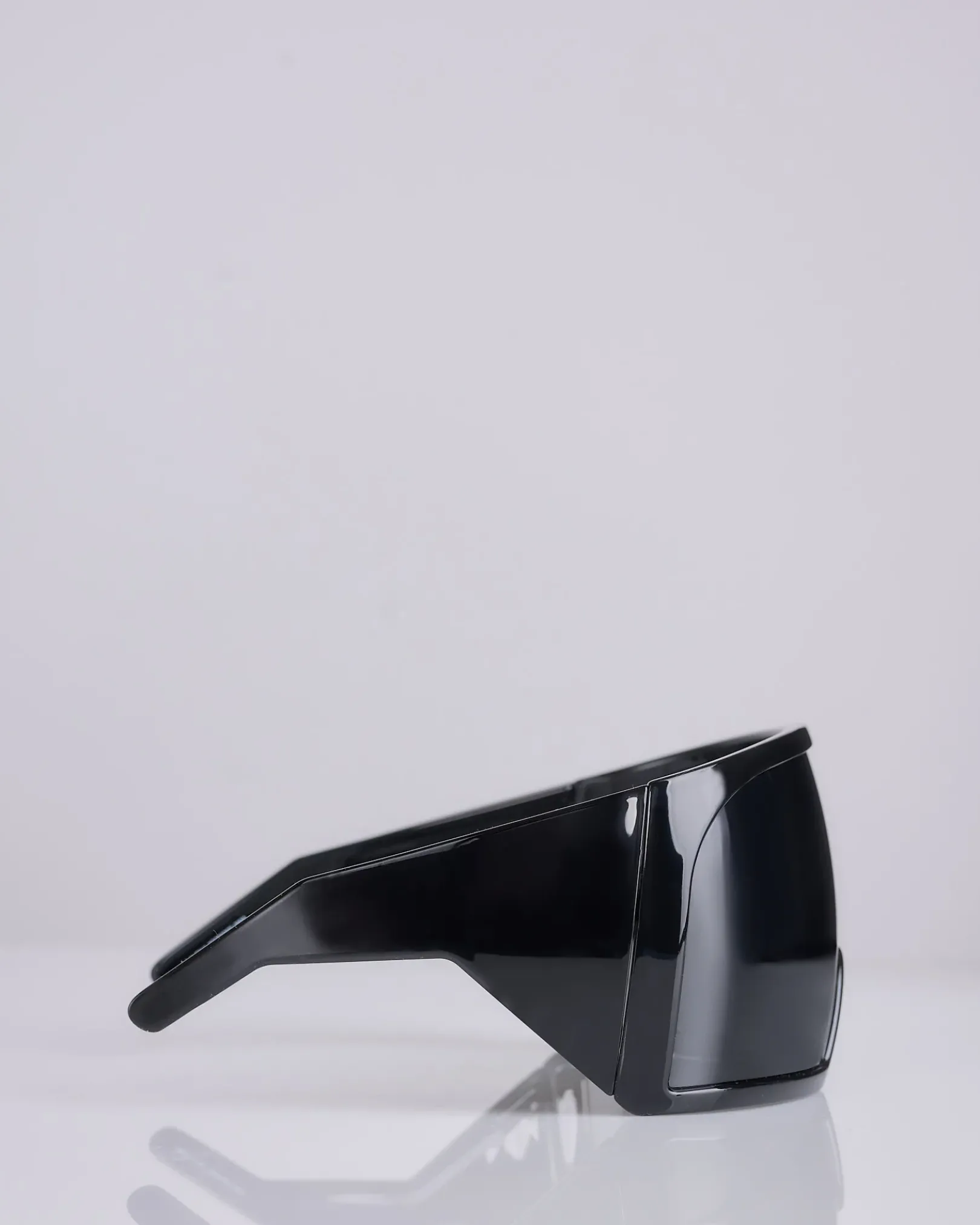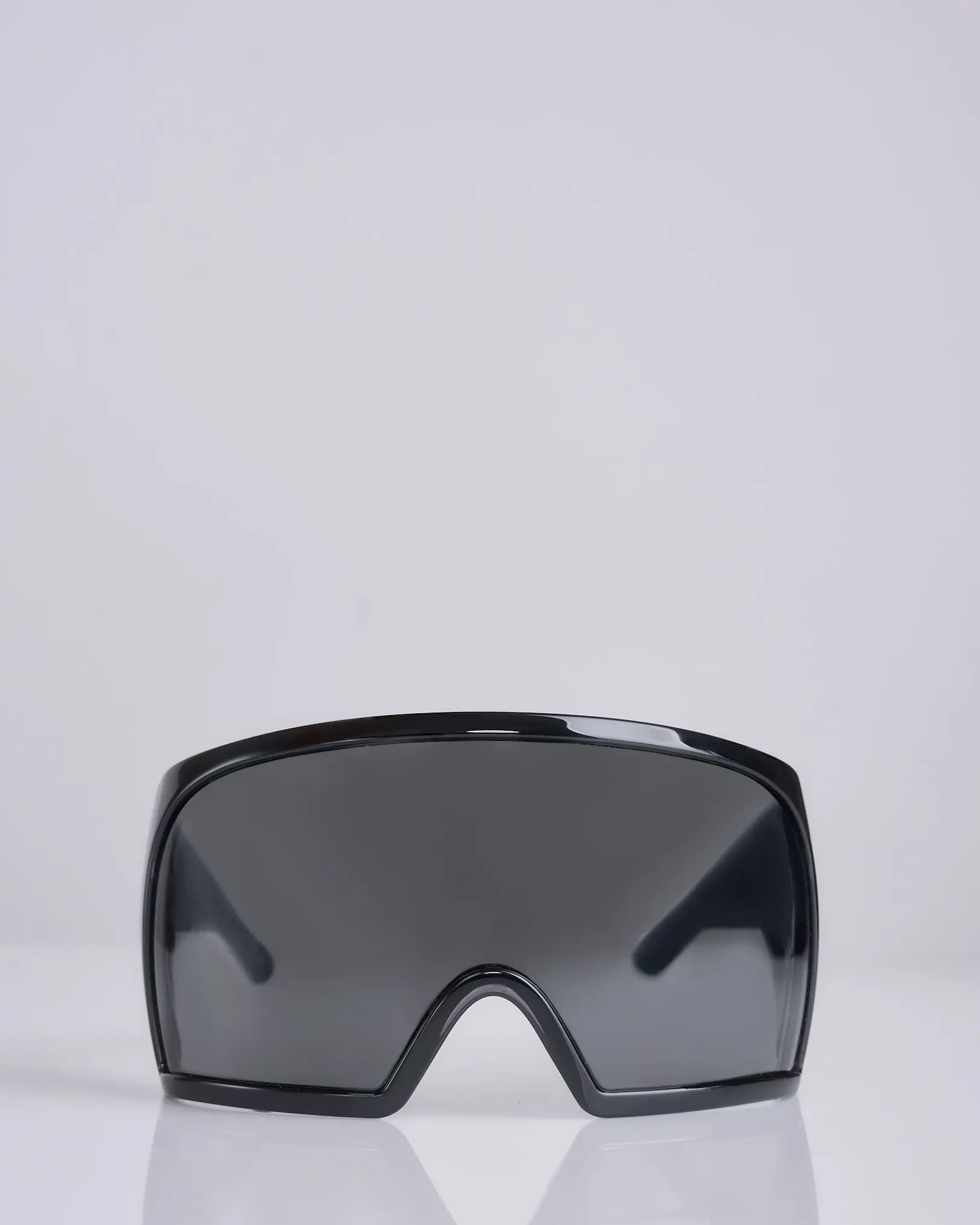 These kriester sunglasses are large curved wrap around frames with a single voluminous curved lens. they have thick angled arms and the Rick Owens logo on the right side.
