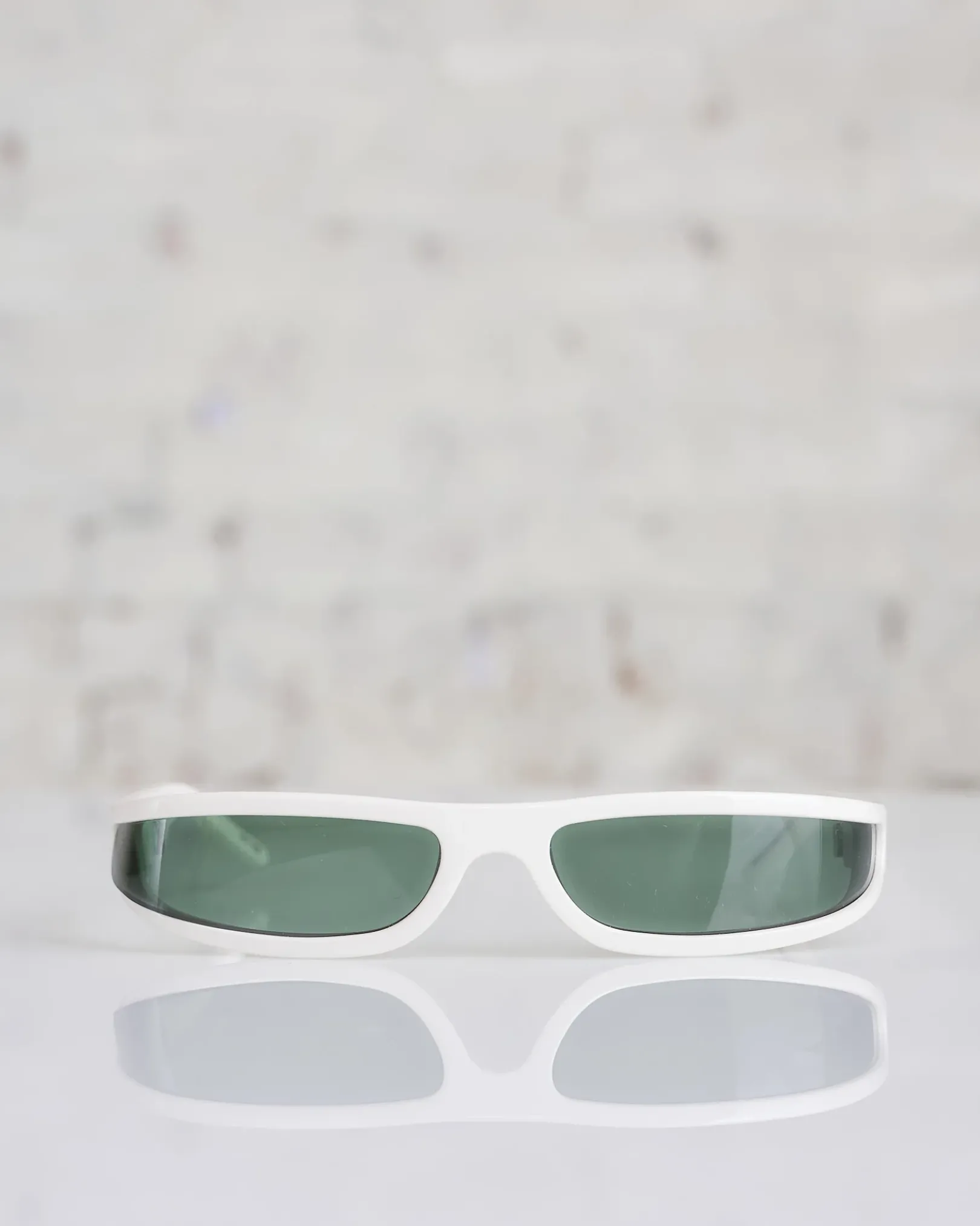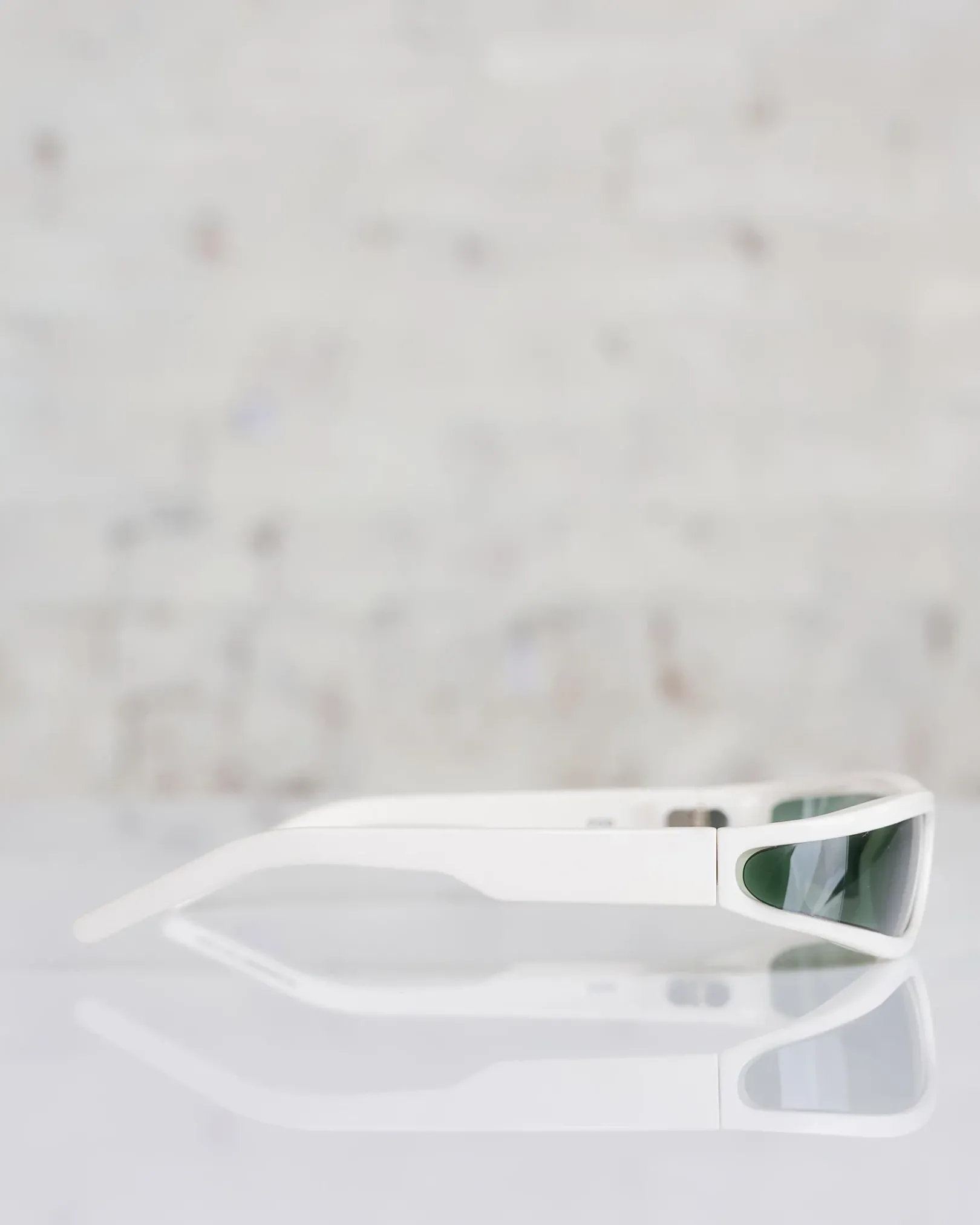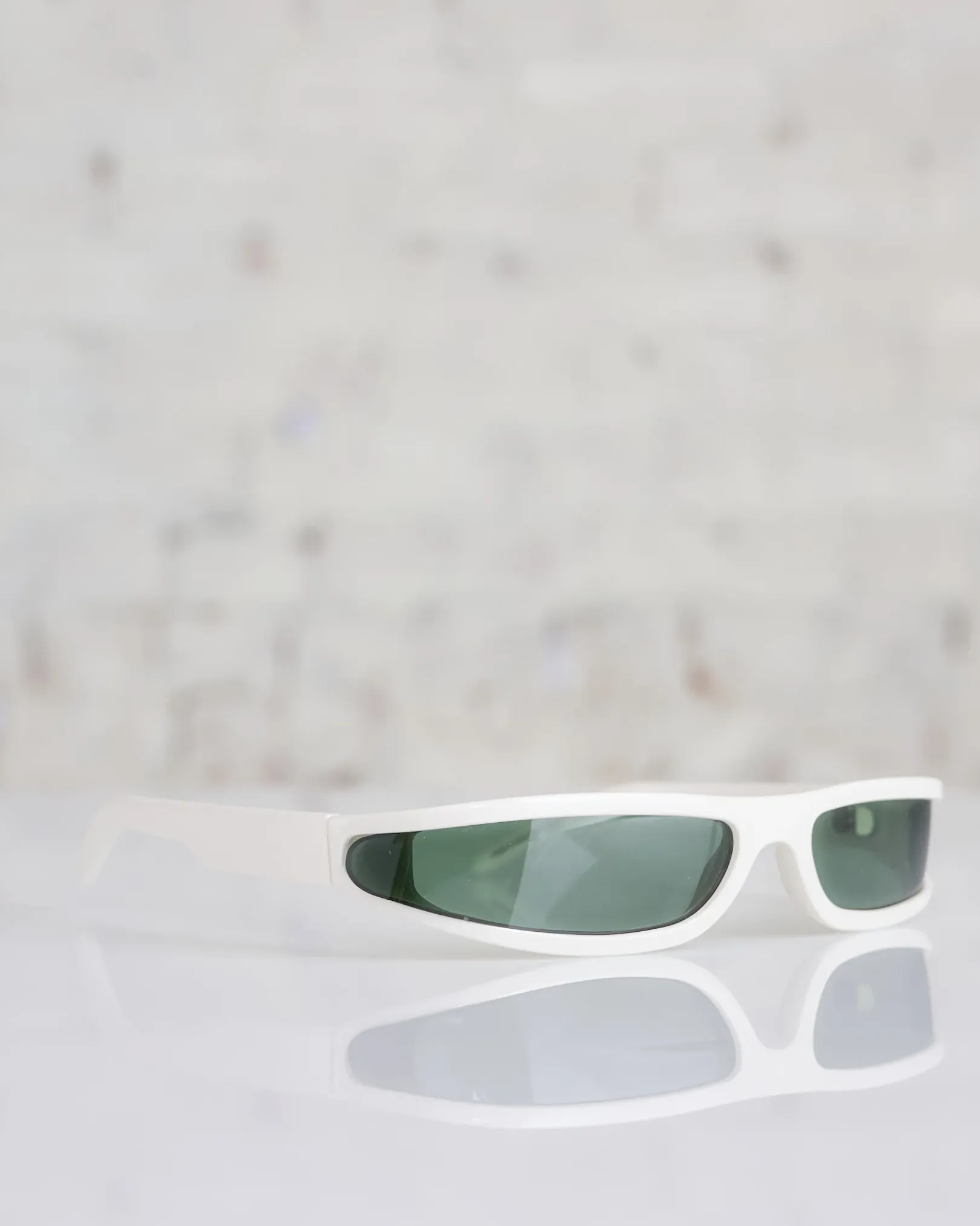 THESE FOG SUNGLASSES ARE SLIM WRAP AROUND FRAME WITH LENS THAT FOLDS AROUND THE TEMPLE. THEY HAVE SLIM ARMS AND RICK OWENS LOGO ON EACH TEMPLE.
