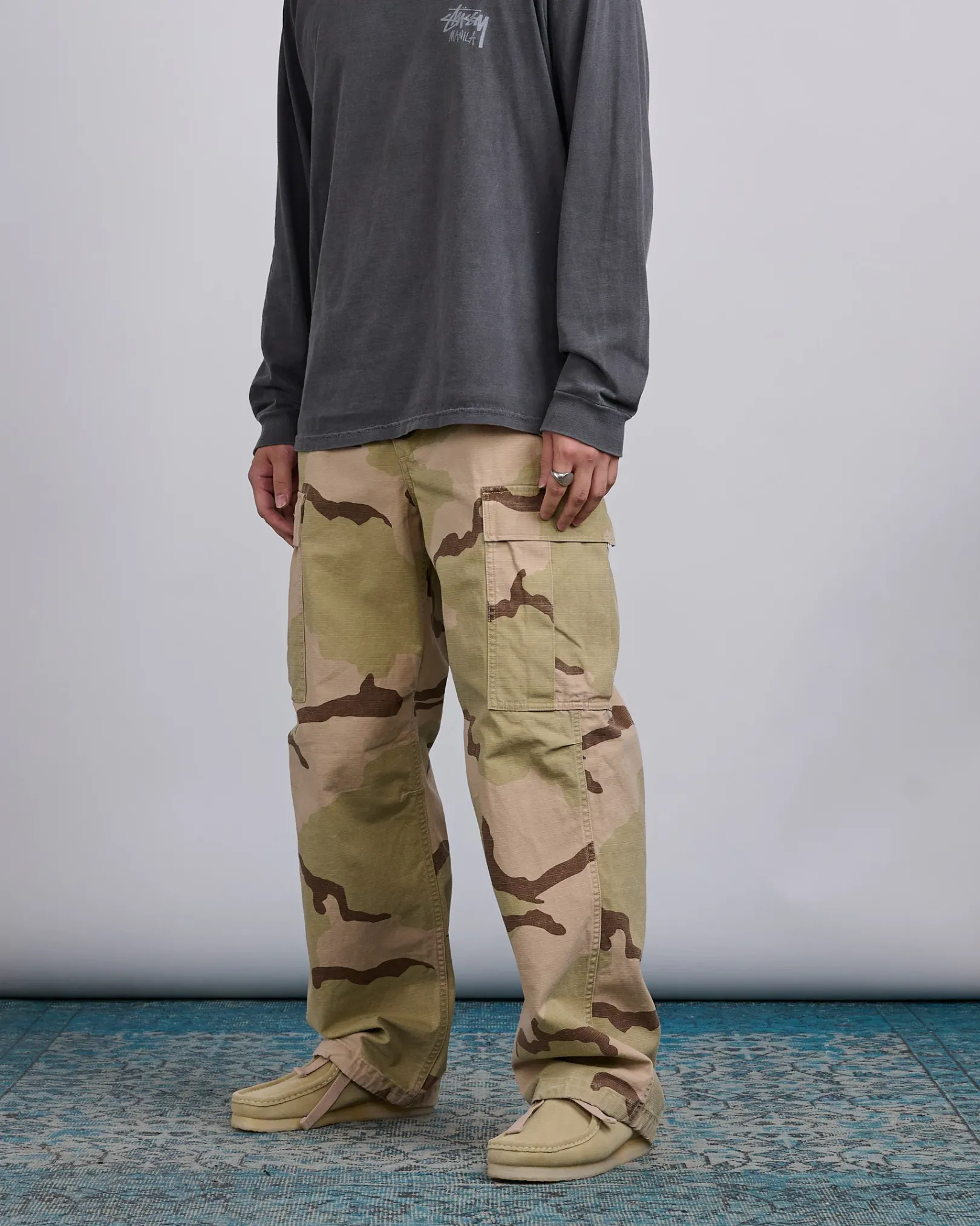 Relaxed fit cargo pant in washed cotton ripstop. Features flap pockets, adjustable waist tabs and flat cotton drawcords at the cuffs. Stüssy stock flag label at rear pocket.