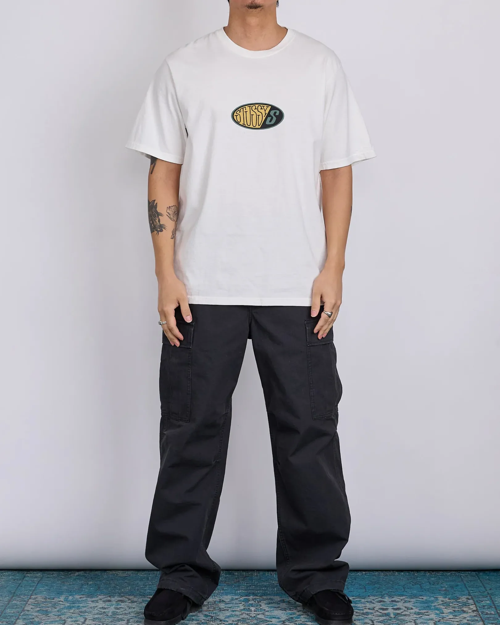 Relaxed fit pigment dyed tee in midweight 220gsm cotton jersey. Front and back graphics screenprinted using water-based ink for a soft hand feel.