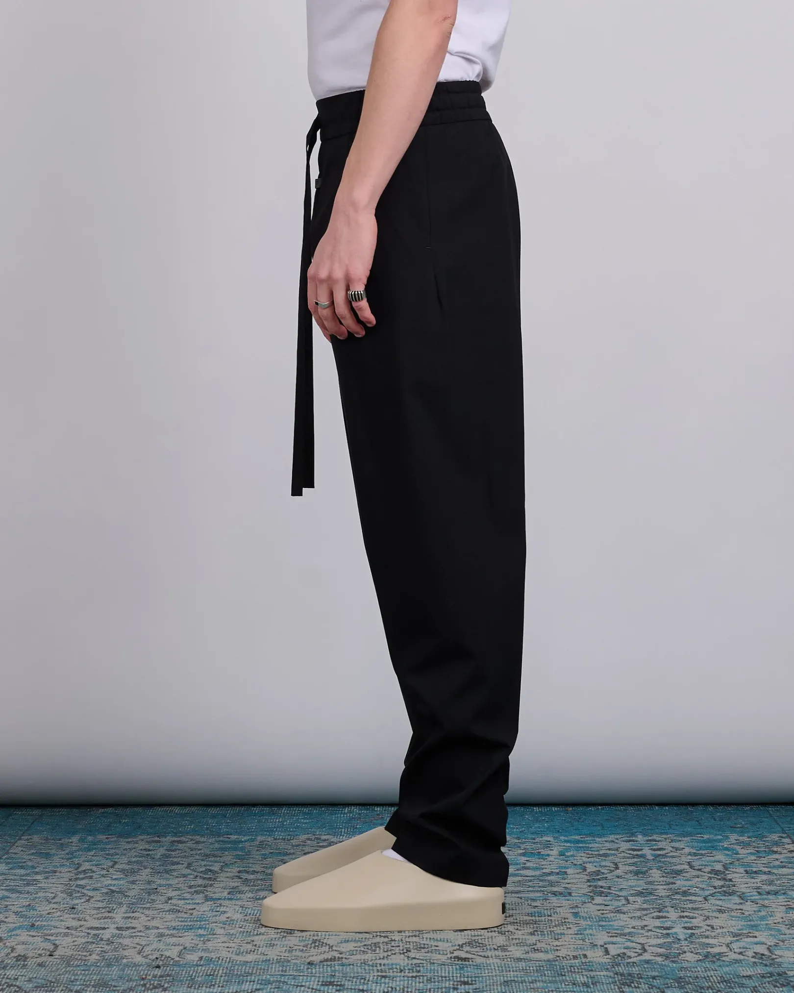 The Drawstring Wide Leg Pant is tailored in Italy from virgin wool-cotton blend for lightweight polished style. Additional features include an encased elastic waistband, self-fabric drawstring, side pockets, and Fear of God label.