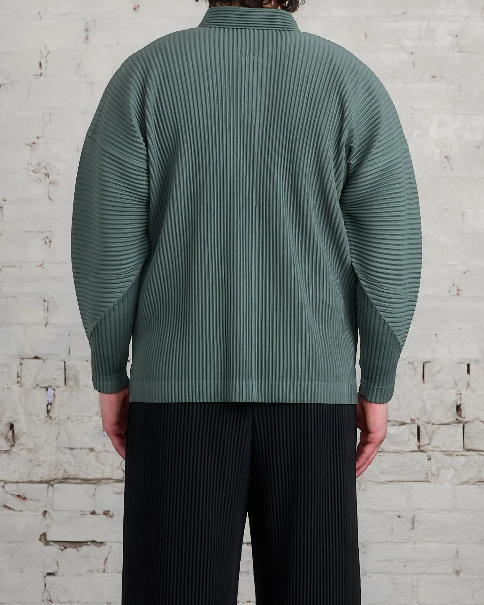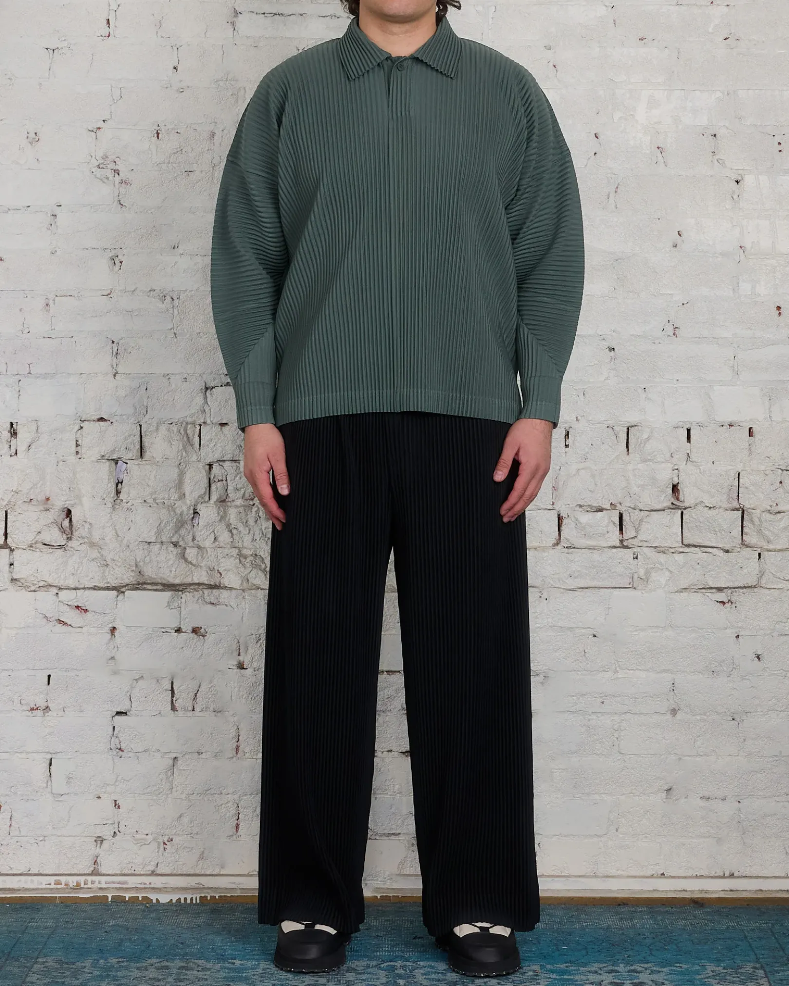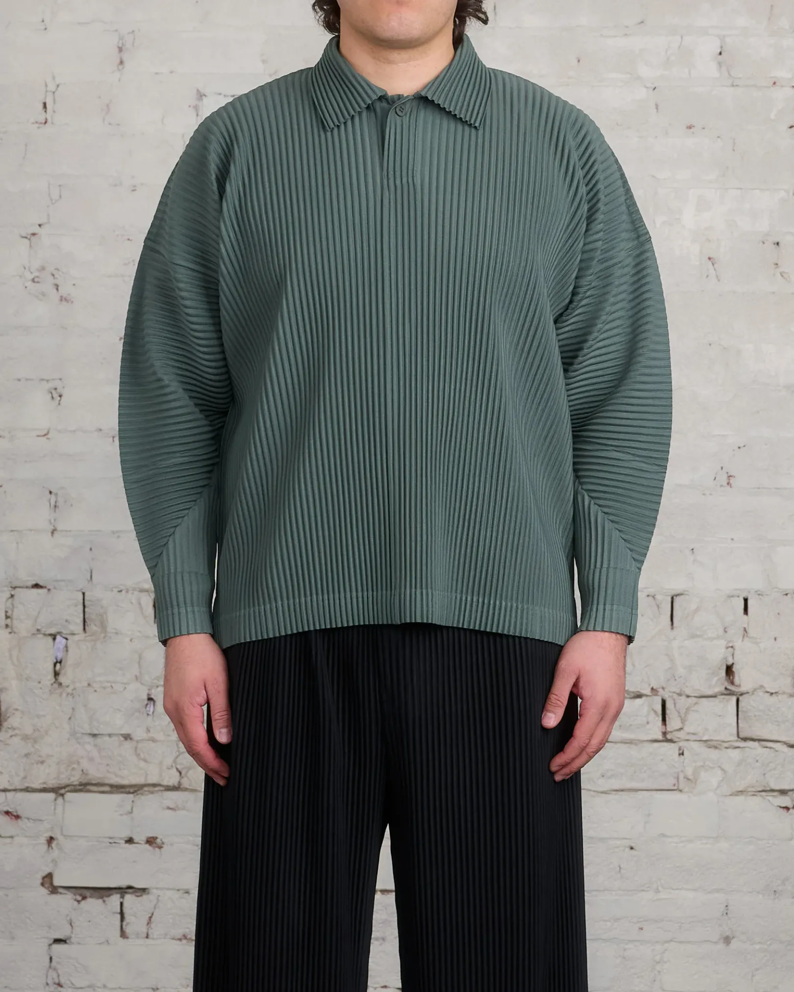This pleated polo shirt has a straight fit and long curved sleeves.