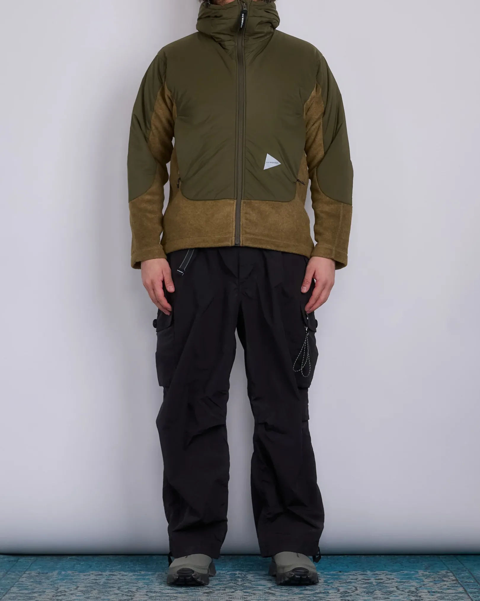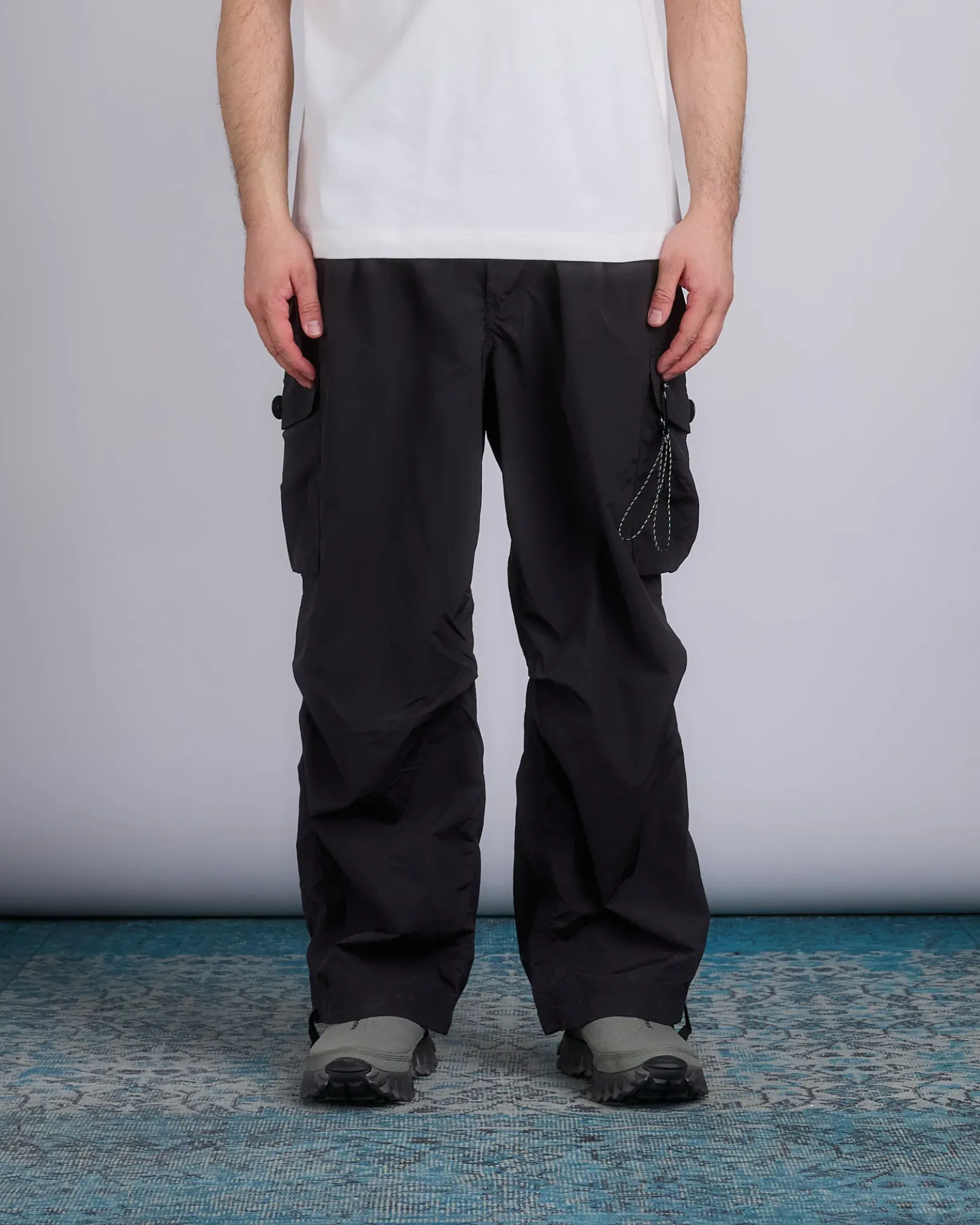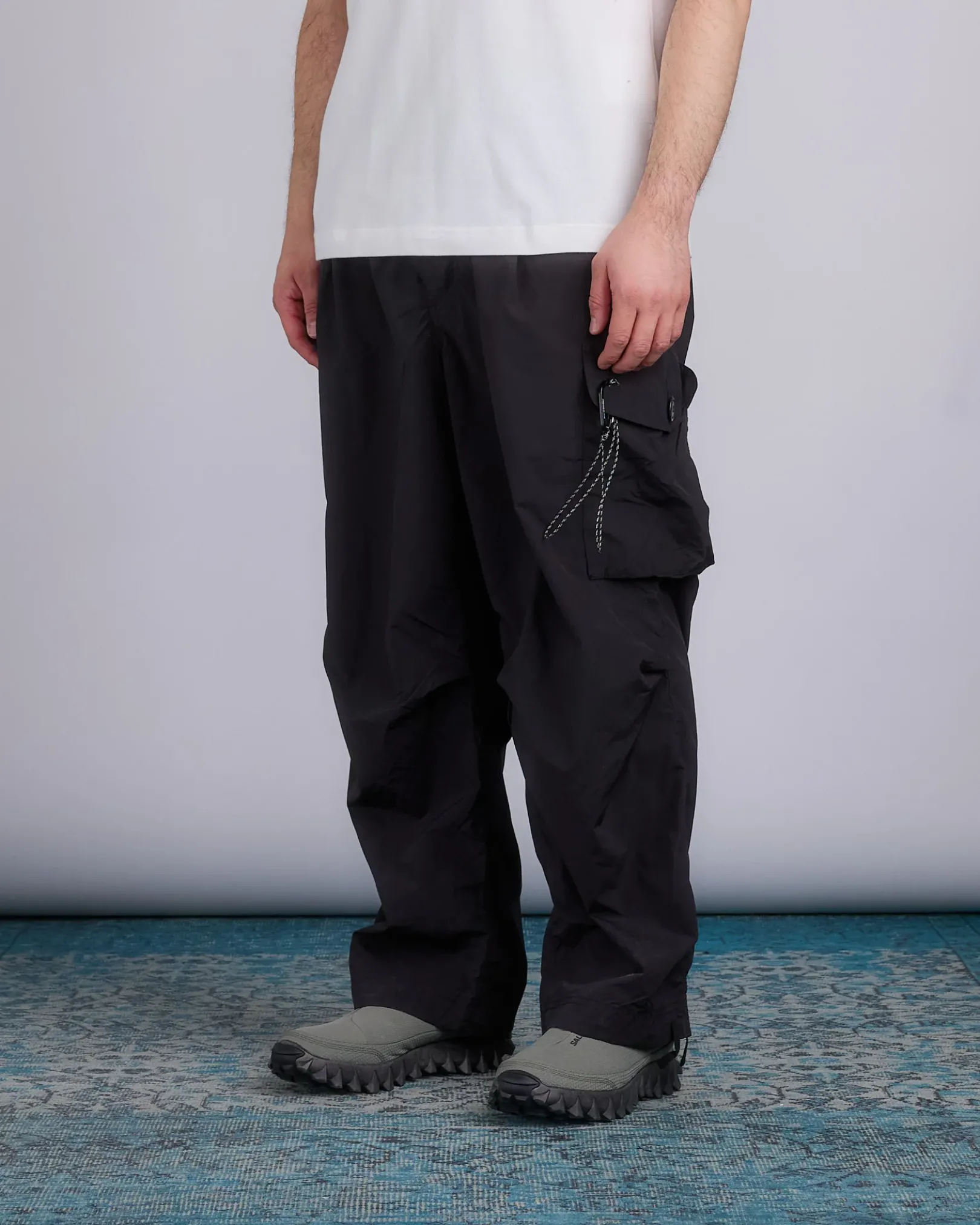 A water-repellent ripstop fabric with a unique elasticity and color due to the use of split yarn. Cargo pants with a loose and wide silhouette.