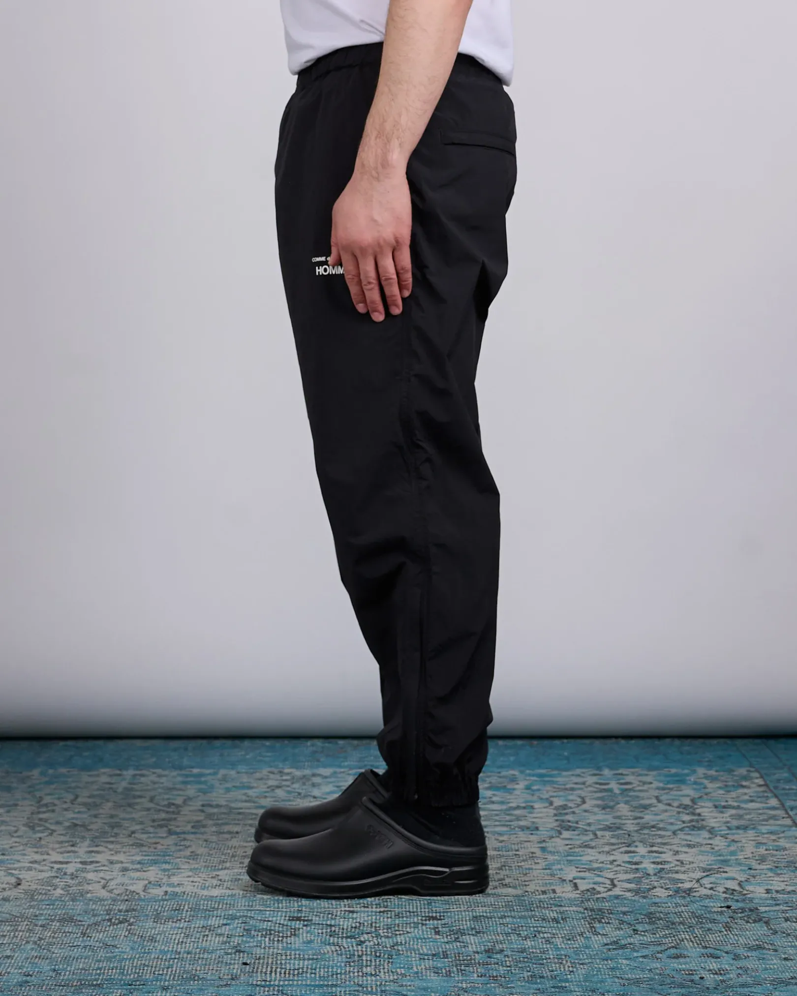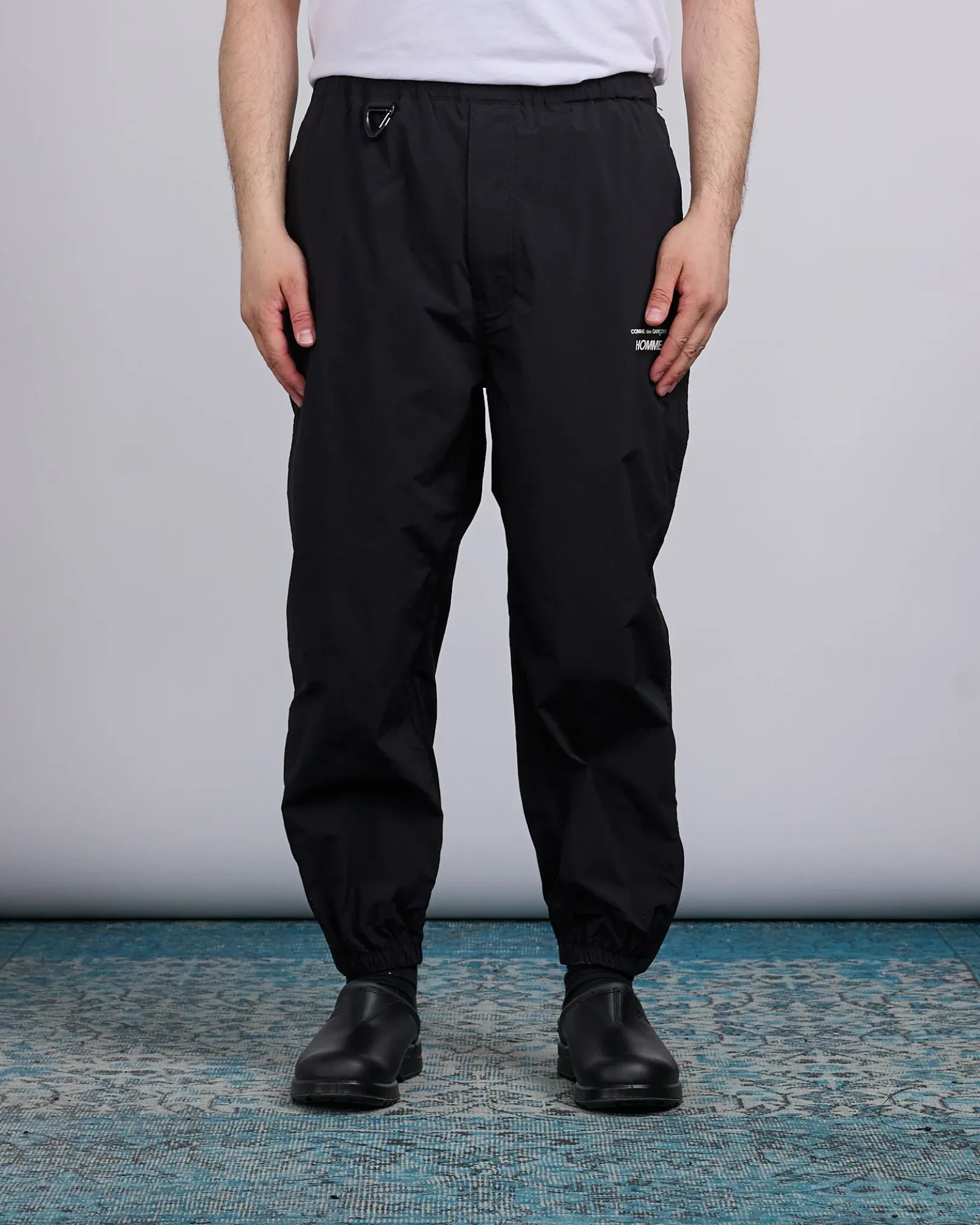 These track pants from COMME des GARÇONS HOMME are made from 100% nylon for durability and comfort. Featuring an adjustable drawstring elasticated waist and elasticated cuffs, they provide a customizable fit. The printed CdGH logo adds a signature touch, while the two side pockets offer convenience. Designed with a relaxed fit, these pants deliver style and ease. Made in Japan.