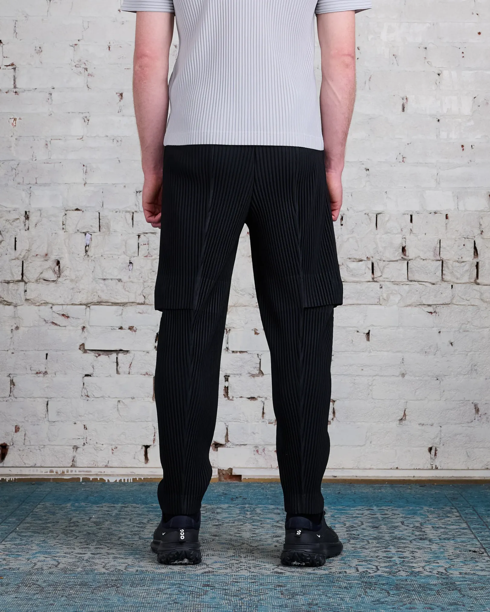These pants are made from pleated material with a cargo pants design. They are characterized by their bold tucks at the knees. They have pockets on both sides and an inner drawcord. They have a front-opening buttoned fly.