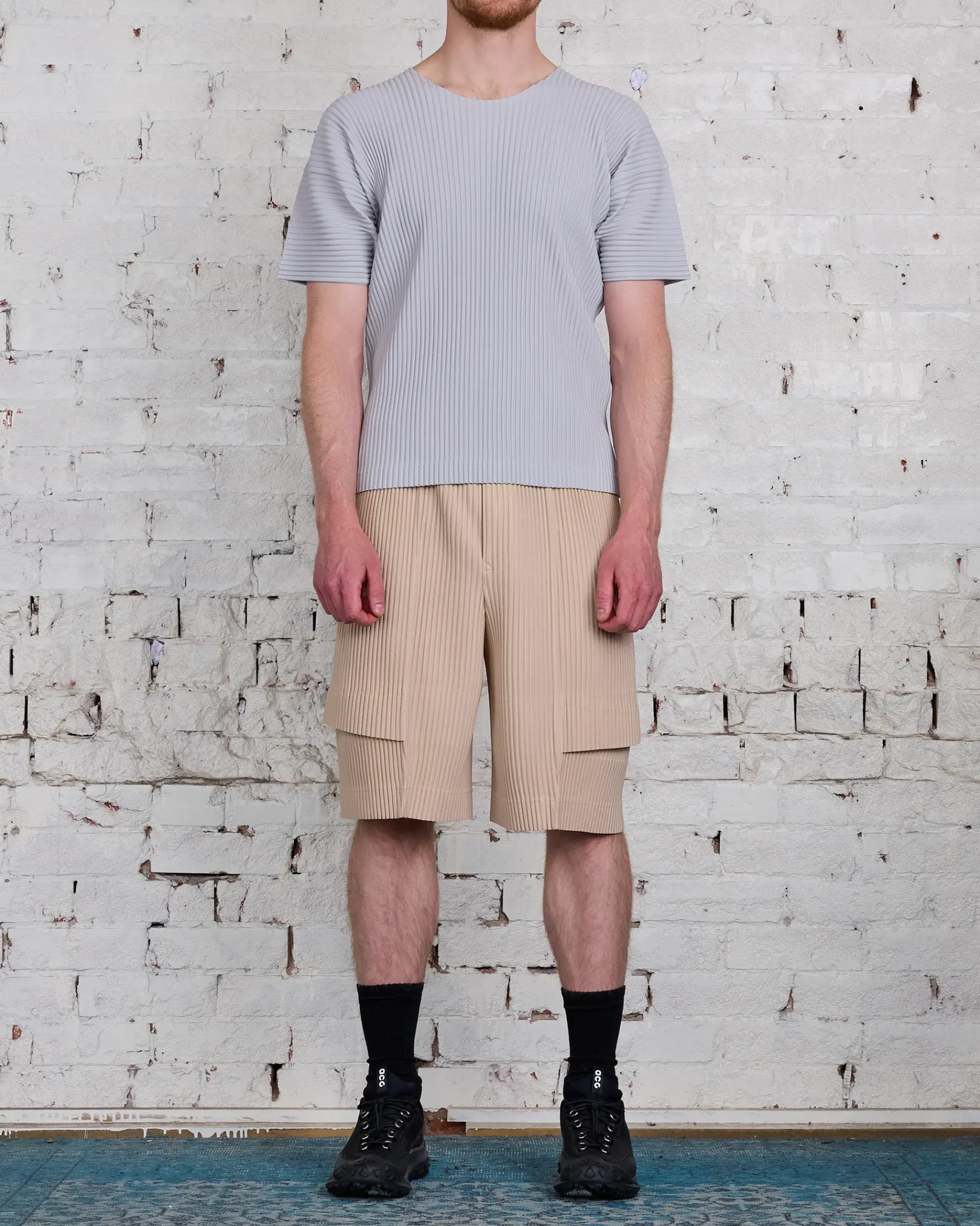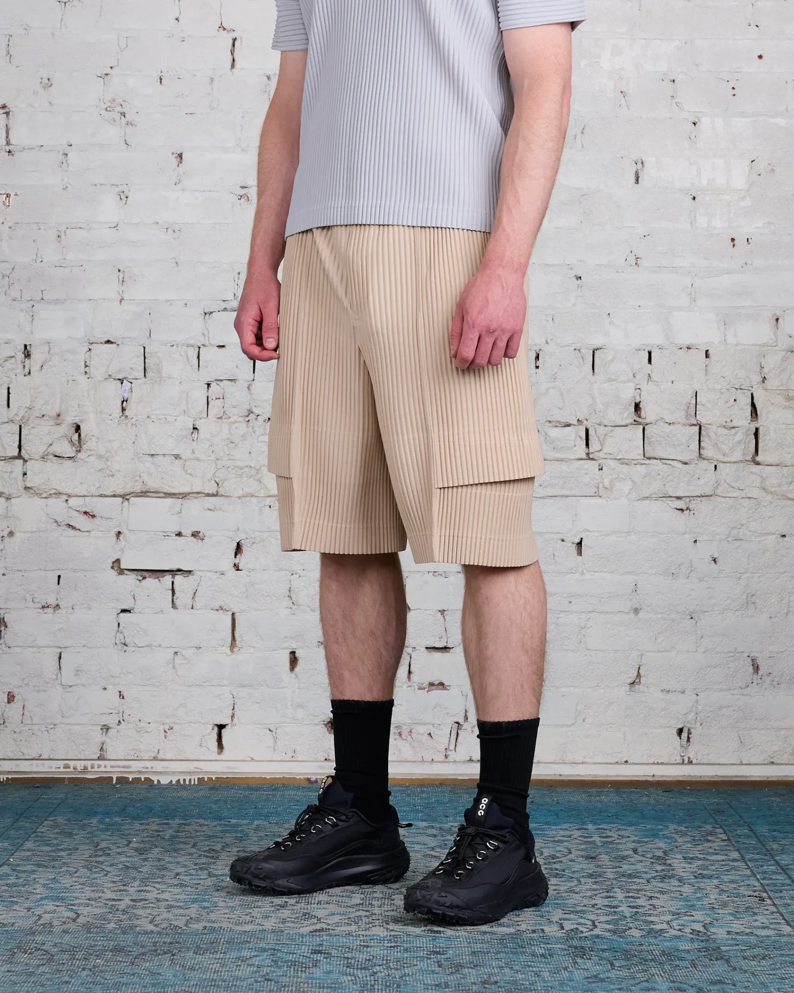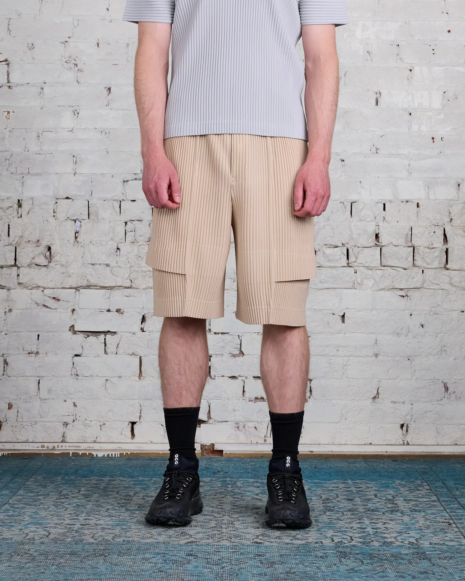 These shorts are made from pleated material with a cargo pants design. They are characterized by their bold tucks. They have pockets on both sides and an inner drawcord. They have a front-opening buttoned fly.