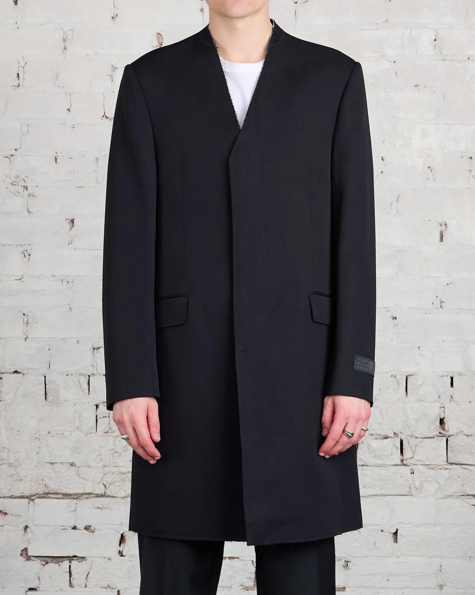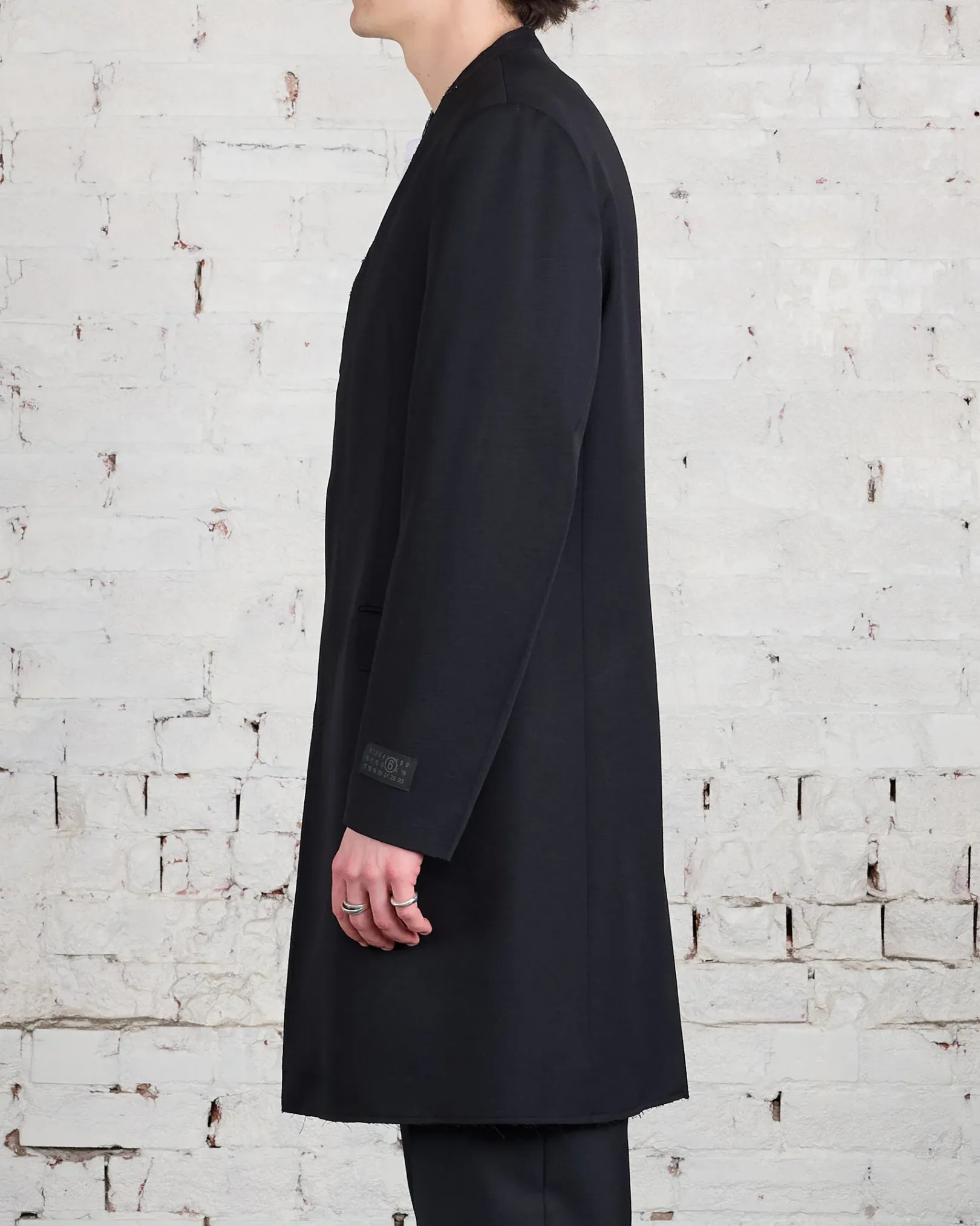A relaxed take on a perennial classic – the tailoring jacket – MM6’s single-breasted version is crafted in Italy from wool to a collarless shape. The style also features padded shoulders, flap pockets and buttoned cuffs. The brand’s discreet yet distinct signature, a horizontal line of white stitches, is also found on the back of the garment.