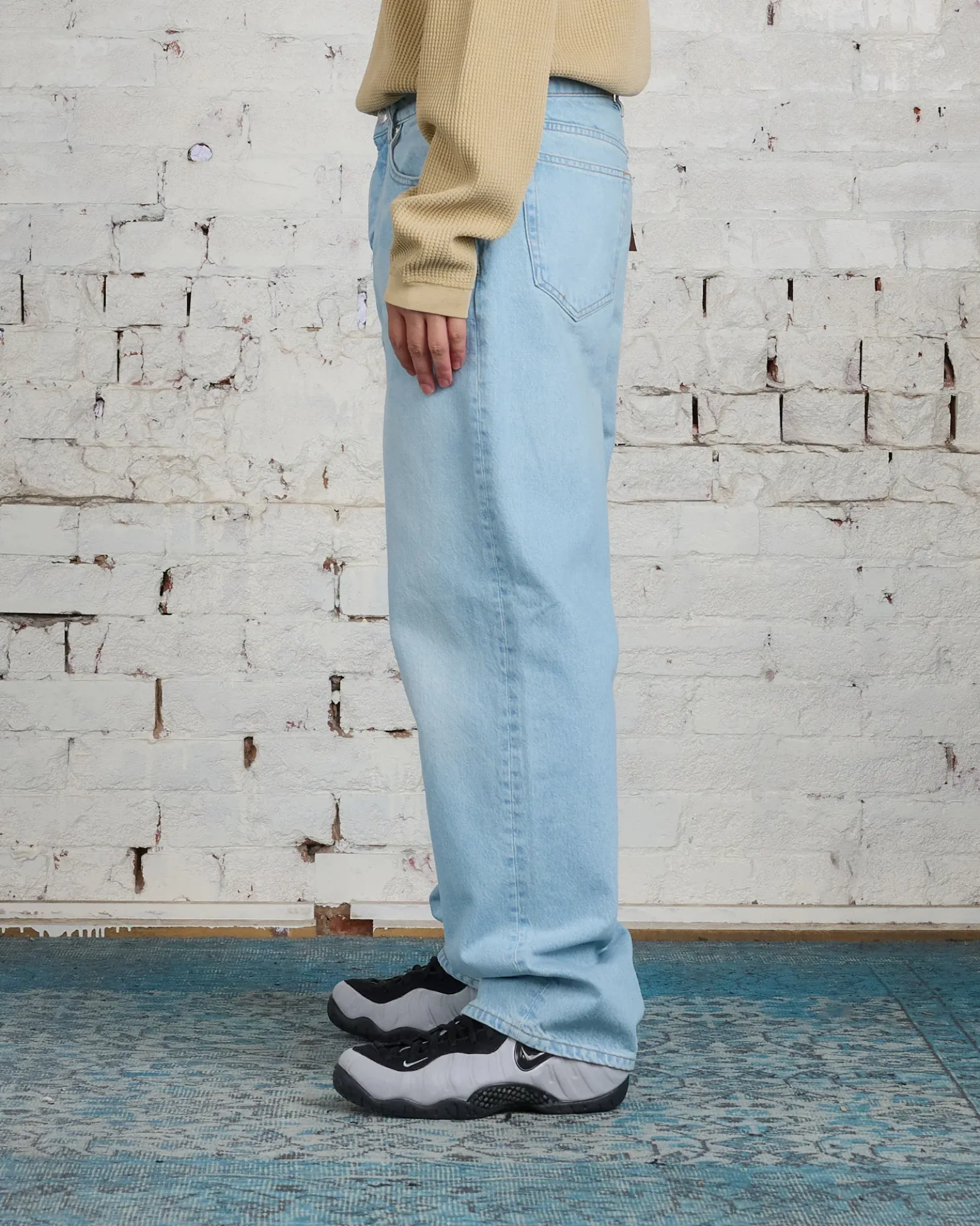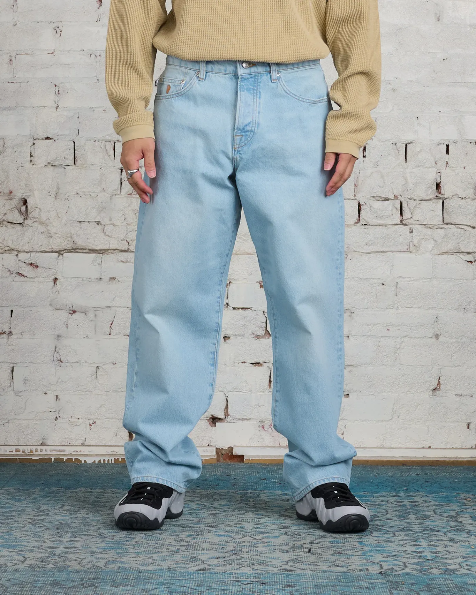 Baggy jean in 14.5oz cotton denim. Oversized waist with a relaxed rise and roomy thigh that tapers to the cuff. Features branded nickel shank hardware and a suede Stüssy logo patch. Size down for a true-to-size fit in the waist, or order your normal size for a baggier fit.