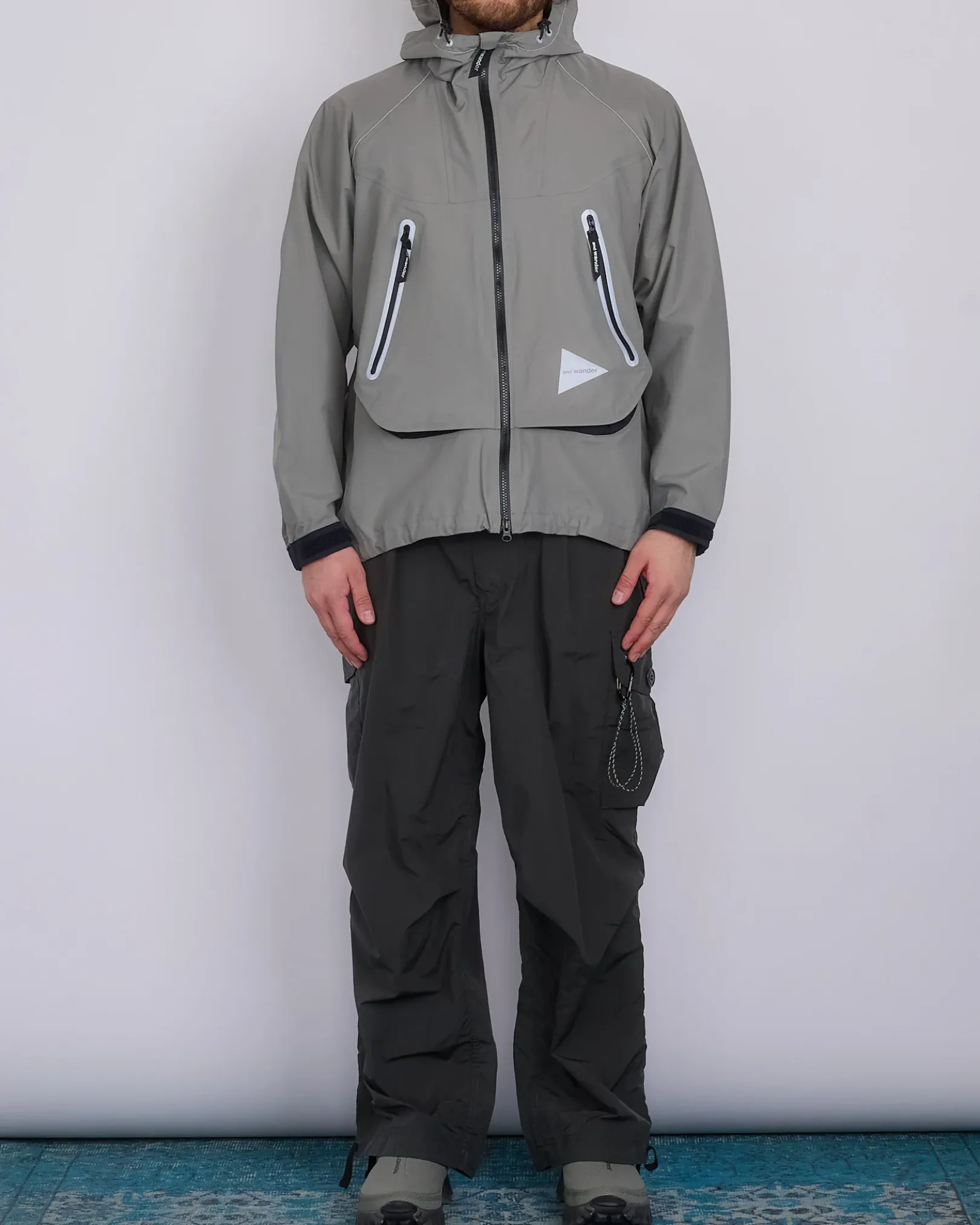 The rain jacket with relaxed-fit around the waist and ventilation on the back. Outer fabric is made of 3-layer waterproof fabric. Water permeability 10000mm (g/m2/h JIS L1092) Water pressure resistance 20000mmI (JIS L 1092 A method)