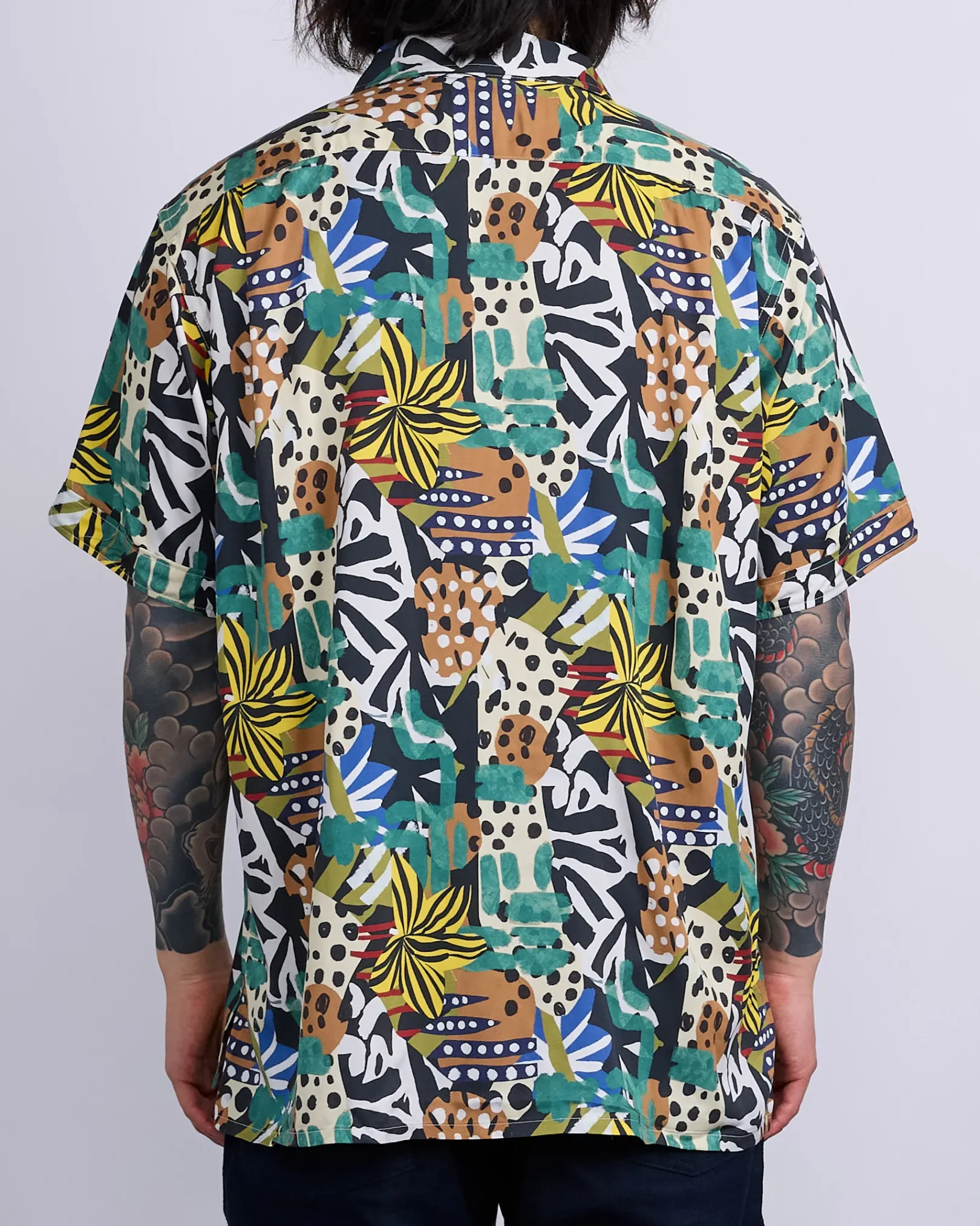 The Camp shirt silhouette features a short sleeve button up front, two patch pockets: one at the chest and the other at the waist. Details include a straight hem and split side vents.