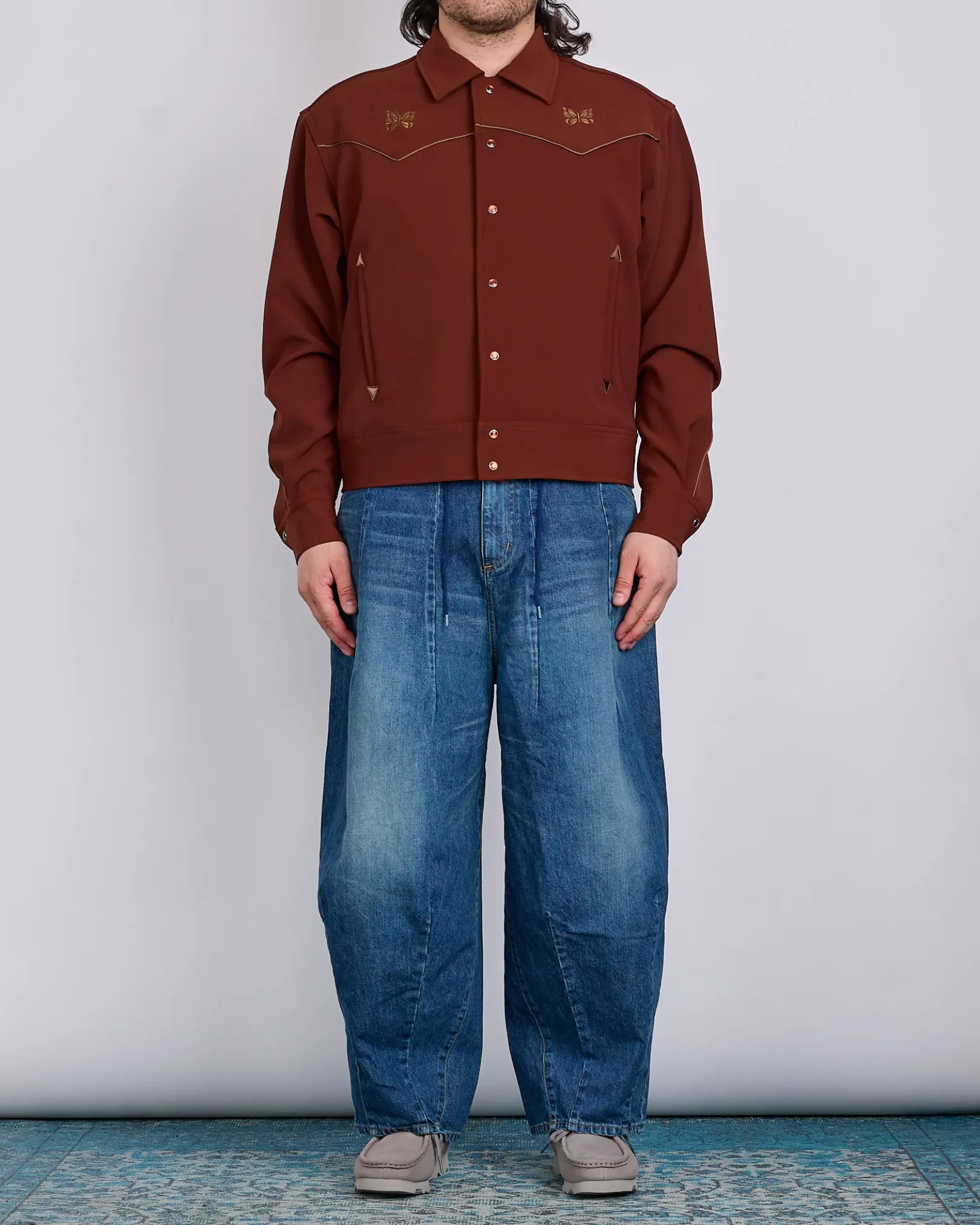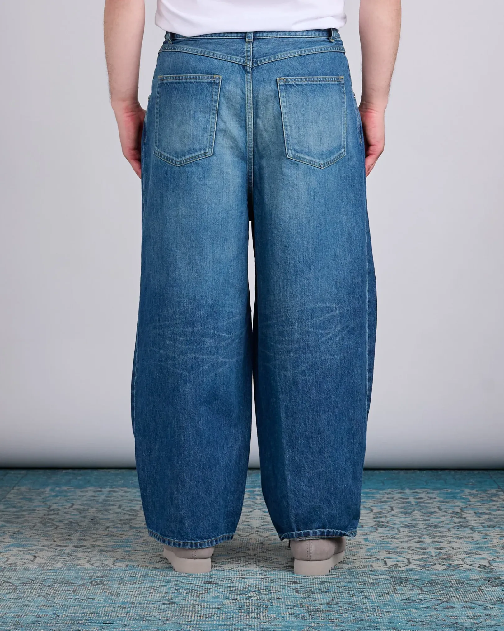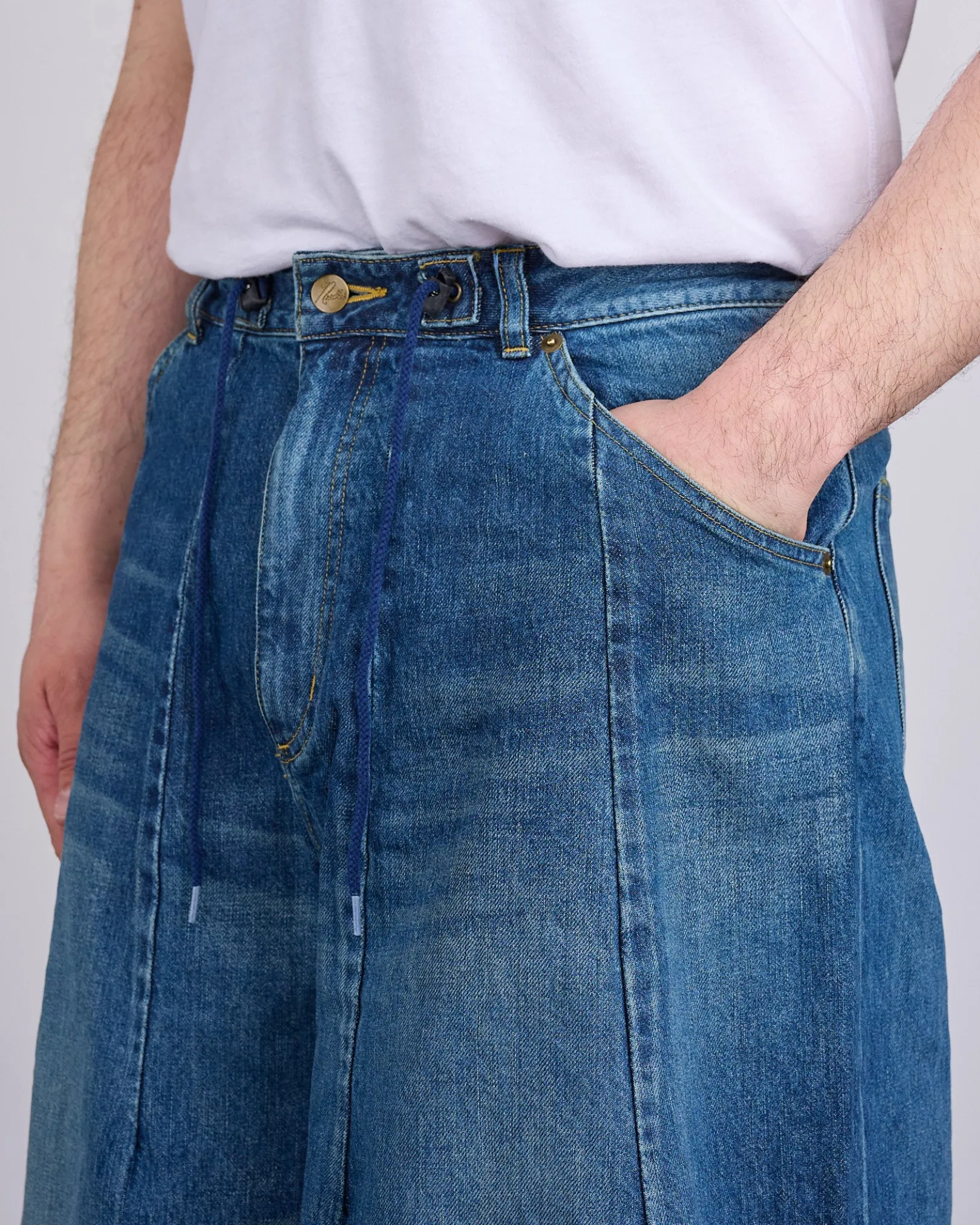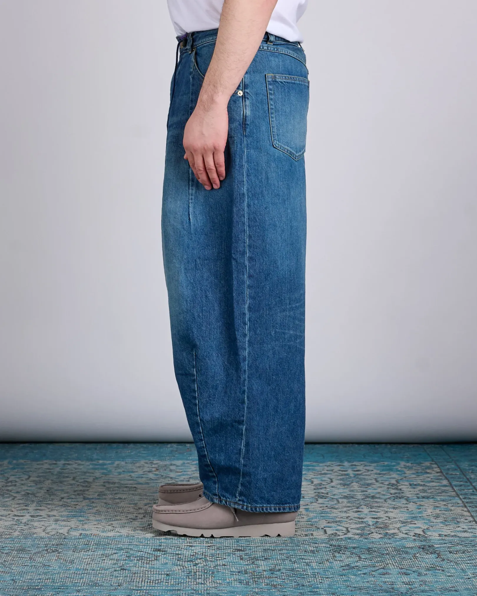 A standout silhouette in every Needles collection, the H.D. Pant—short for “hiza-deru,” meaning “knee-out” in Japanese—features a bold, exaggerated shape created by carefully sewn darts at the waist and hem. This version is crafted from sturdy 12oz indigo denim with subtle distressing, offering year-round versatility. Designed with a relaxed fit, zip fly, hand pockets, and back patch pockets, it blends comfort and structure with signature Needles flair.