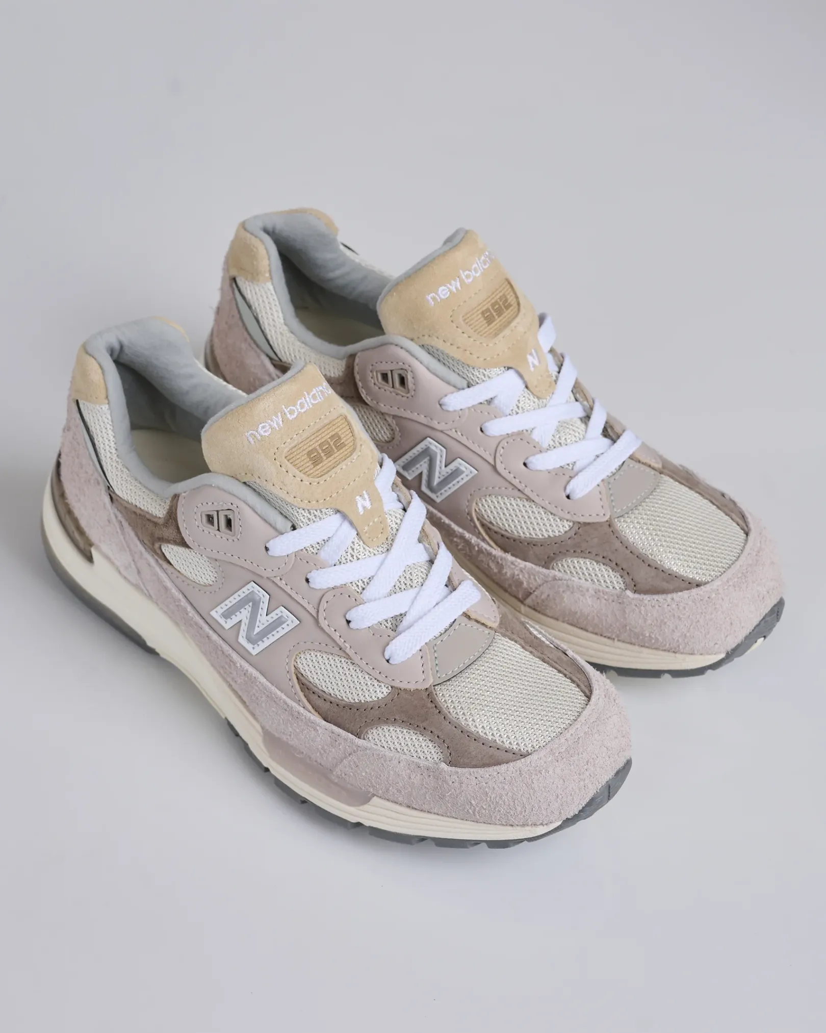 The legendary Made in USA 992 comes to the Made in USA Seasonal Collection for the first time. This fan-favorite silhouette marks its first appearance in over three years with a subtle twist on a classic look. A premium material mix featuring hairy suede, mesh, suede, and leather sports a light shade of grey, moonrock, with earthy mushroom accents.