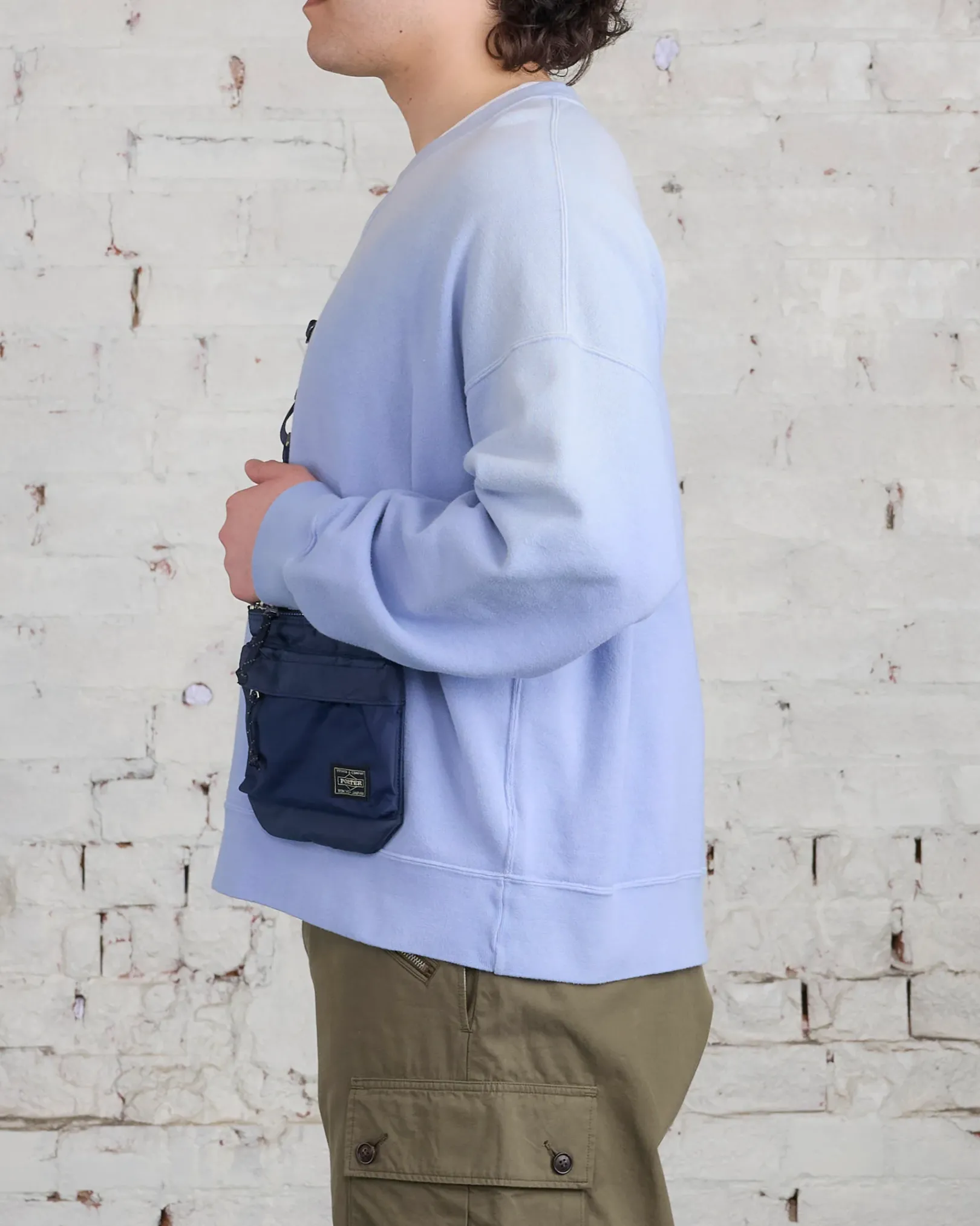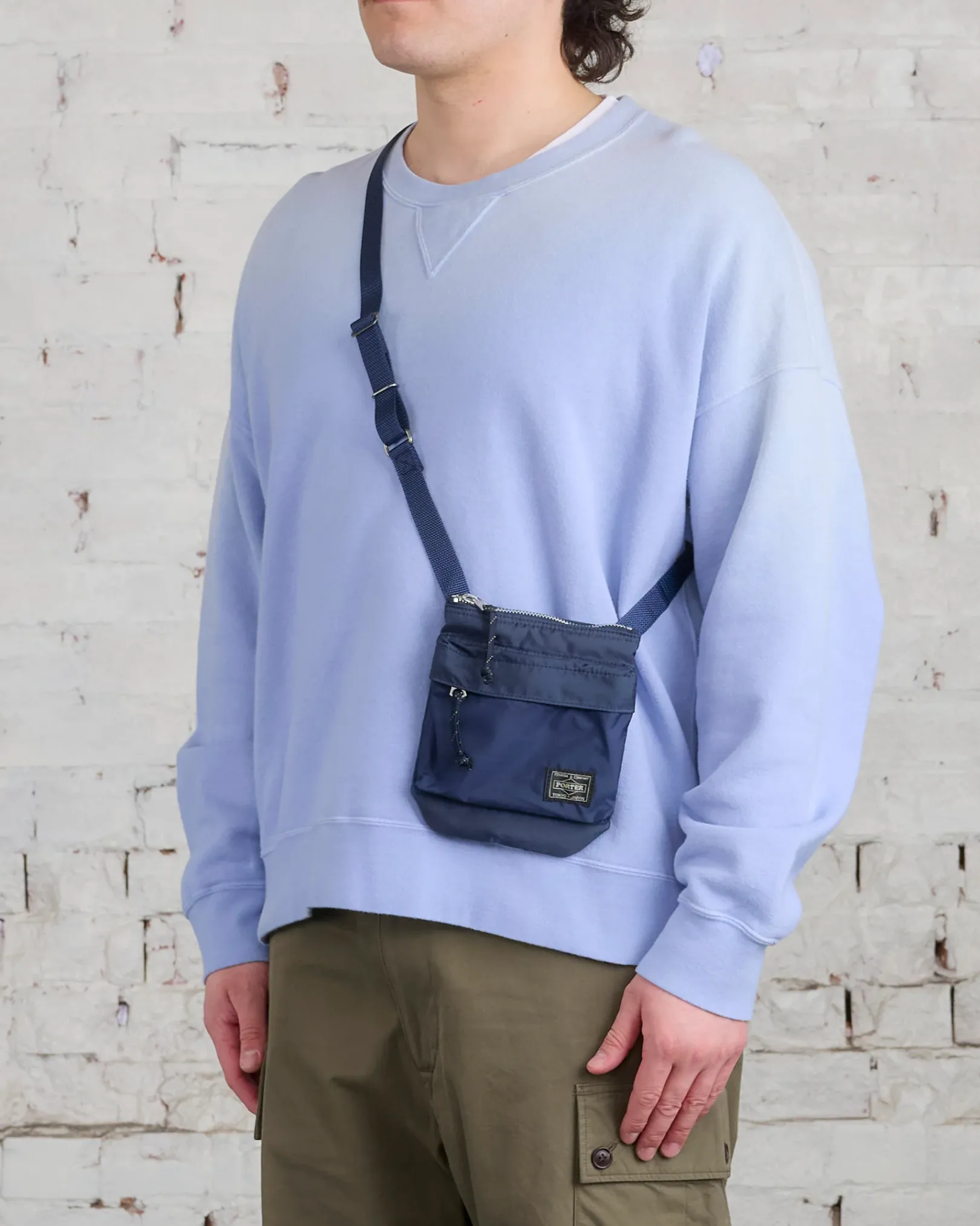 PORTER FORCE Shoulder Pouch in Navy. Inspired by military-style goods, this series highlights the unique color variations found by chance in the fabric. Made with durable 210 denier 6 nylon, originally used for rubber boats, this bag offers functional design with an interior key clip, front pocket, zip closure, and interior divider.