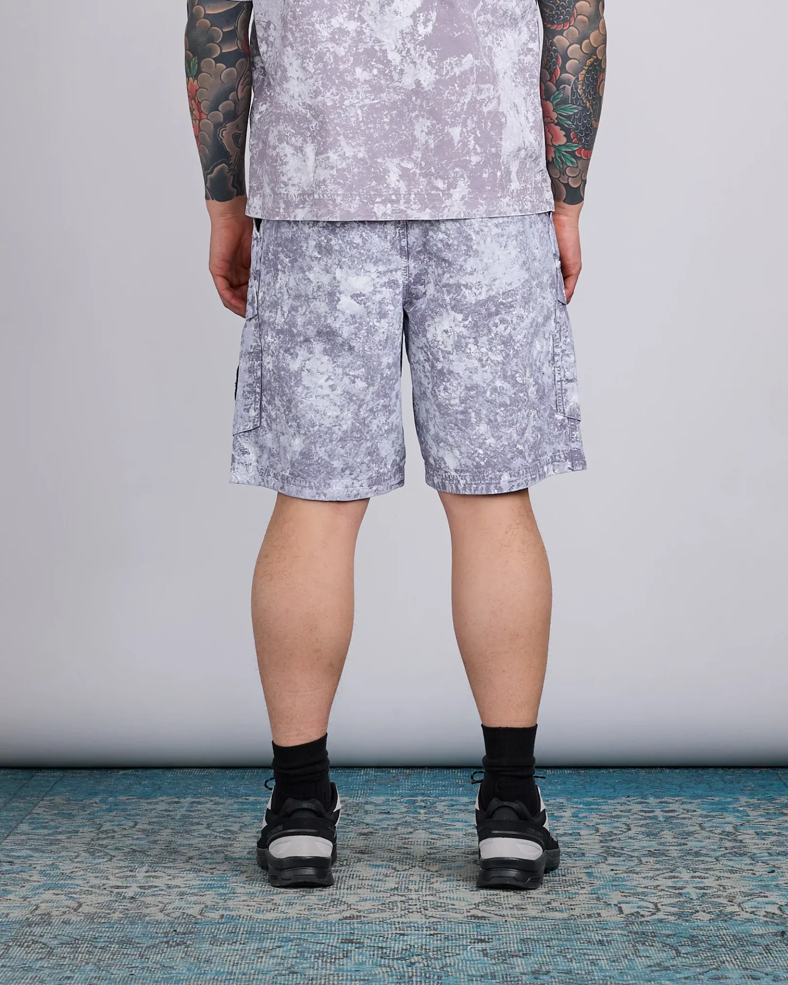 Cargo shorts made of a very fine stretch canvas and dyed with specific recipes. After drying, it undergoes a white pigment treatment and is then fixed through oven-drying. A final wash eliminates the color residues.