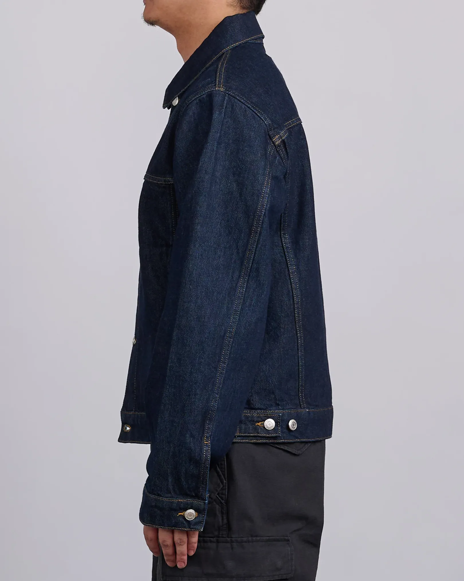 Relaxed fit trucker jacket in 14.5oz rinsed indigo denim. Boxy cut with branded nickel shank hardware, gold topstitching and a suede Stüssy logo patch.