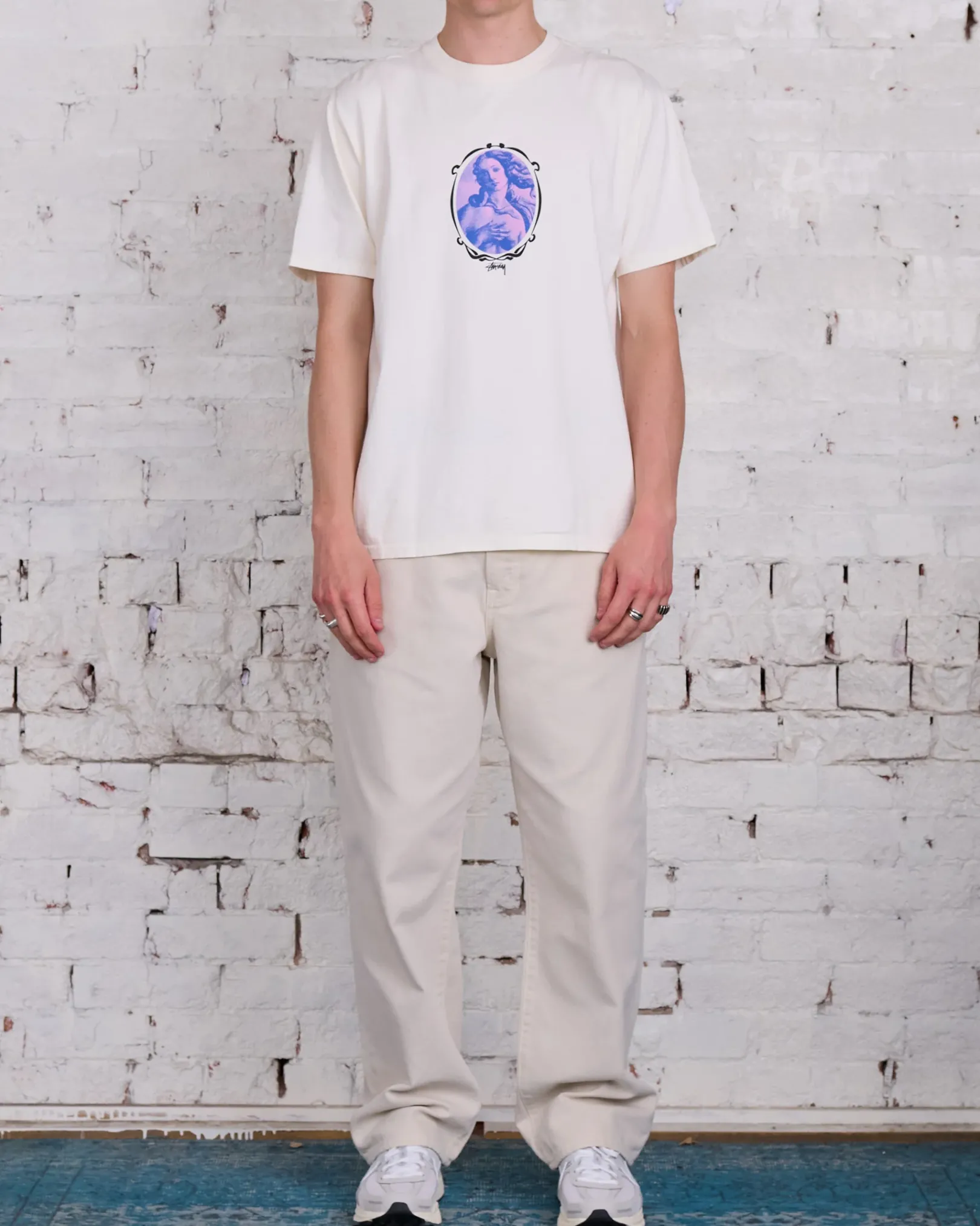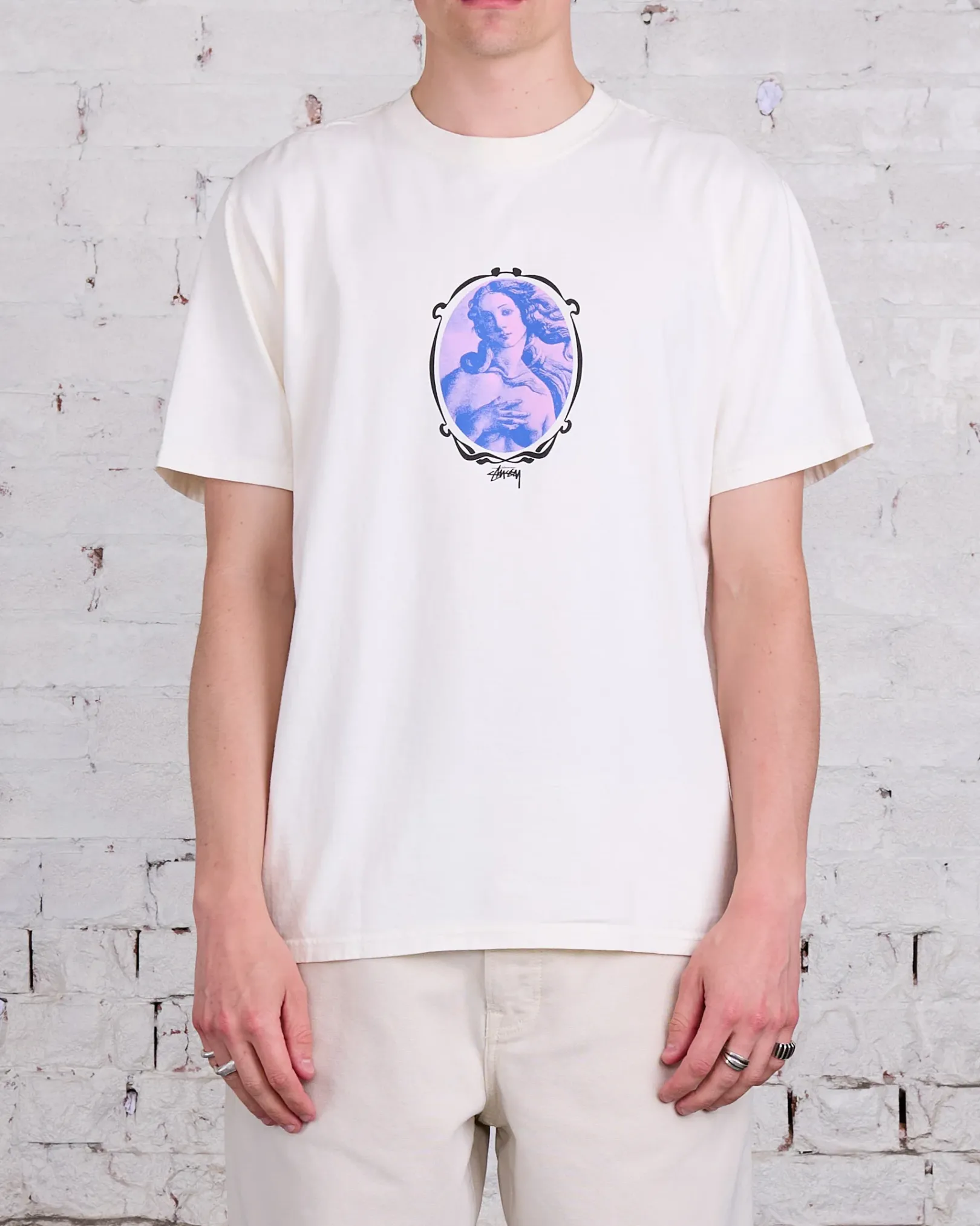 Oversized pigment dyed tee in midweight 6.5oz cotton jersey. Features screenprinted graphics.